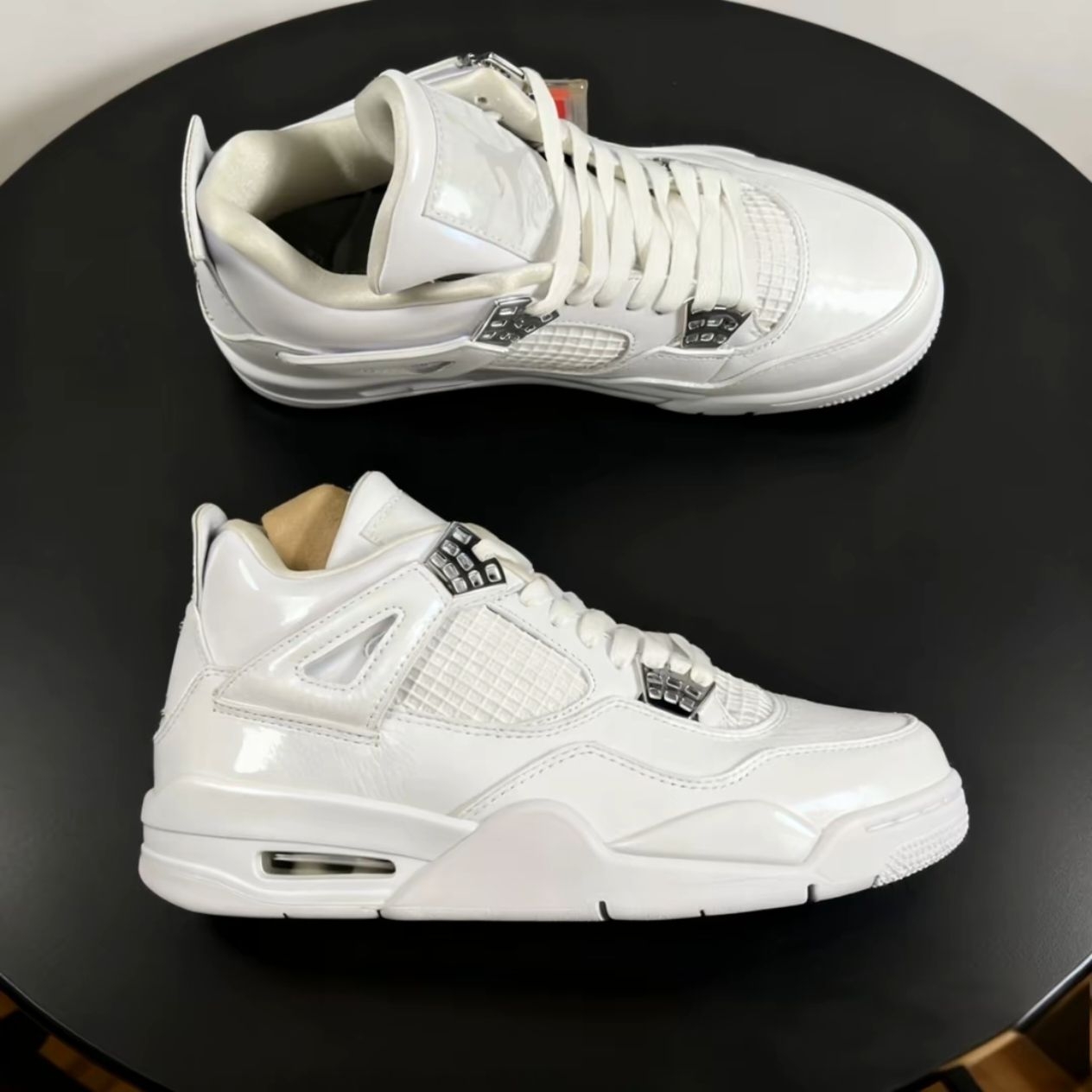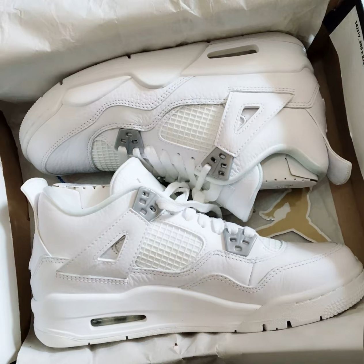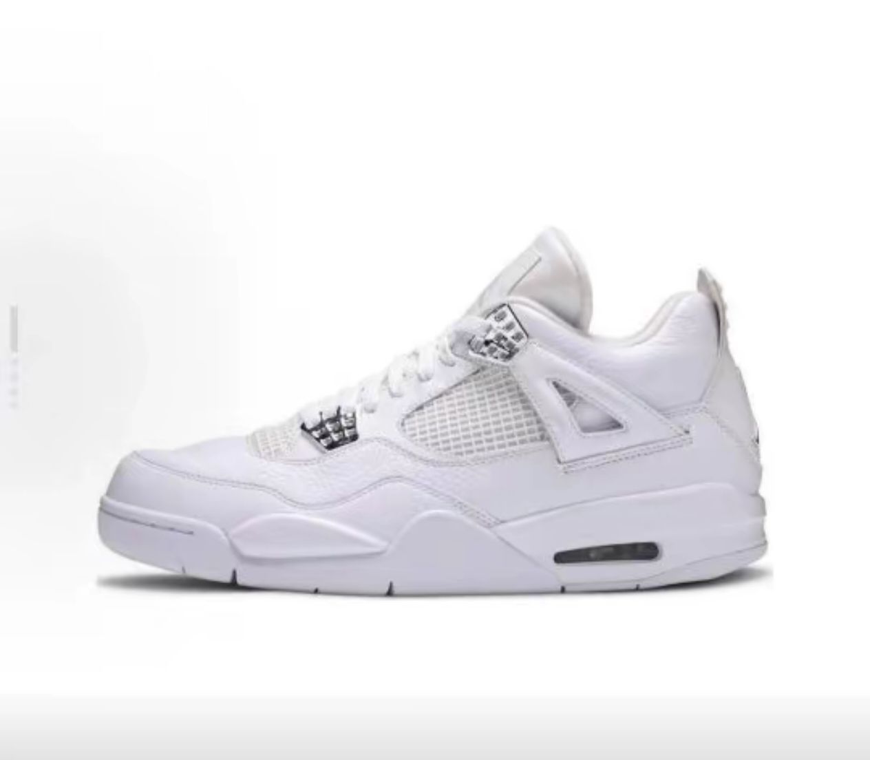纯白AJ4,百搭王者真的藏不住! 谁能拒绝一双全白的Air Jordan 4??极简纯白鞋面把高级感拉满,经典的网格鞋面、塑料鞋扣和后跟飞人标细节在线,利落又有辨识度。 脚感也完全不踩雷,气垫缓震适配日常通勤、逛街,搭配牛仔裤、运动裤甚至休闲西裤都毫无违和感,堪称鞋柜里的“万能选手”。 不管是AJ老粉还是小白,这双纯白AJ4都能轻松拿捏风格,颜值与实穿性双在线,入股不亏!