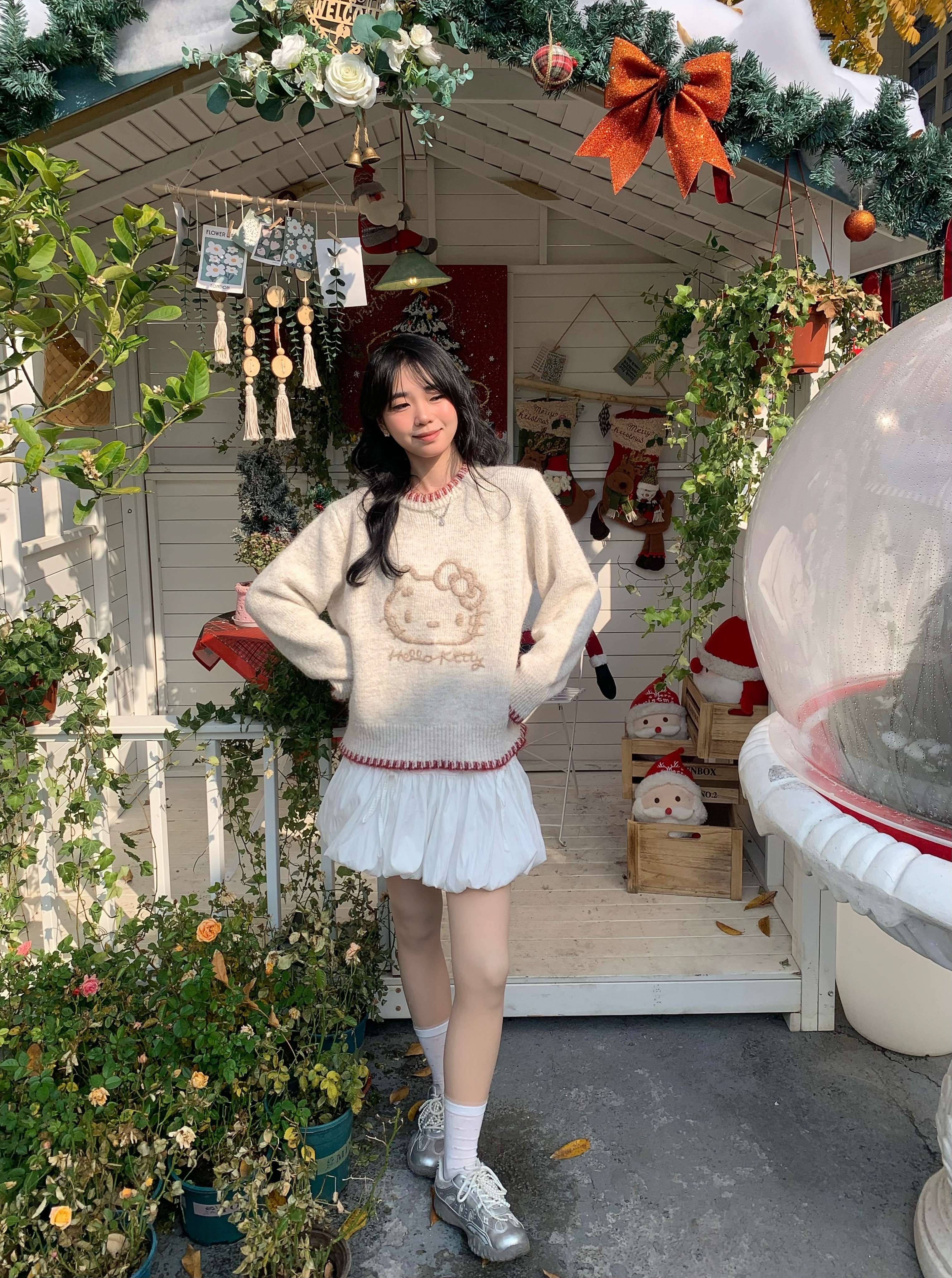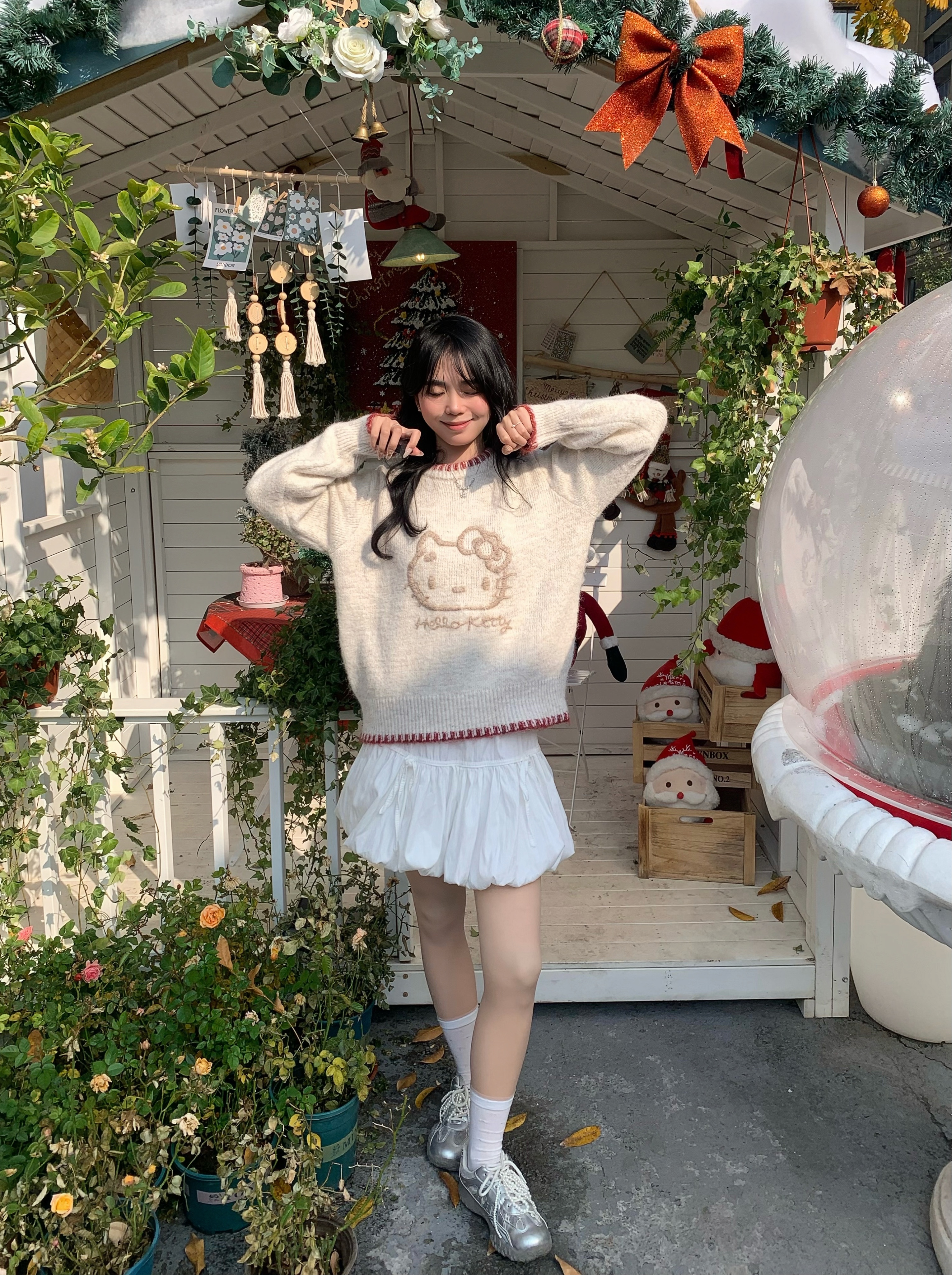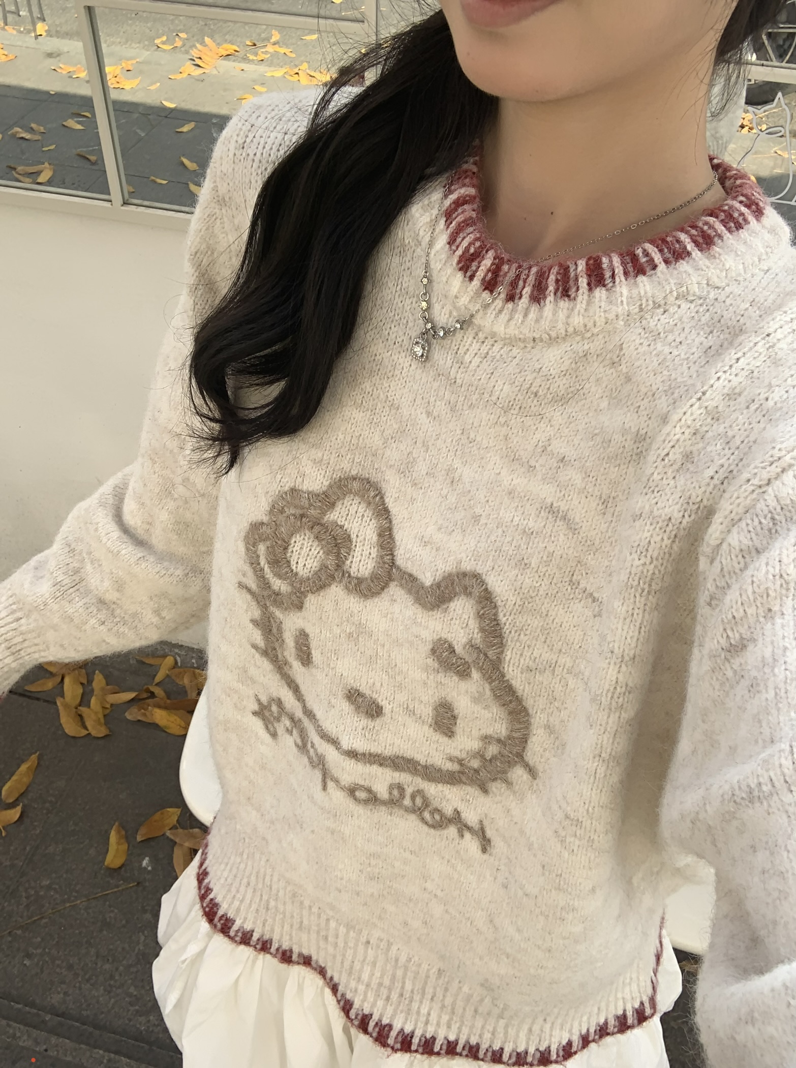 好温柔的毛衣软软糯糯的 穿着好舒服 最近好喜欢hellokitty风格的衣服~ 最主要在冬天穿在羽绒服里面也不会显得臃肿 图案印花很精致 搭配小短裙或者裤子都好好看~ kitty主义爱住了😻 搭配银色的鞋子更温柔啦~