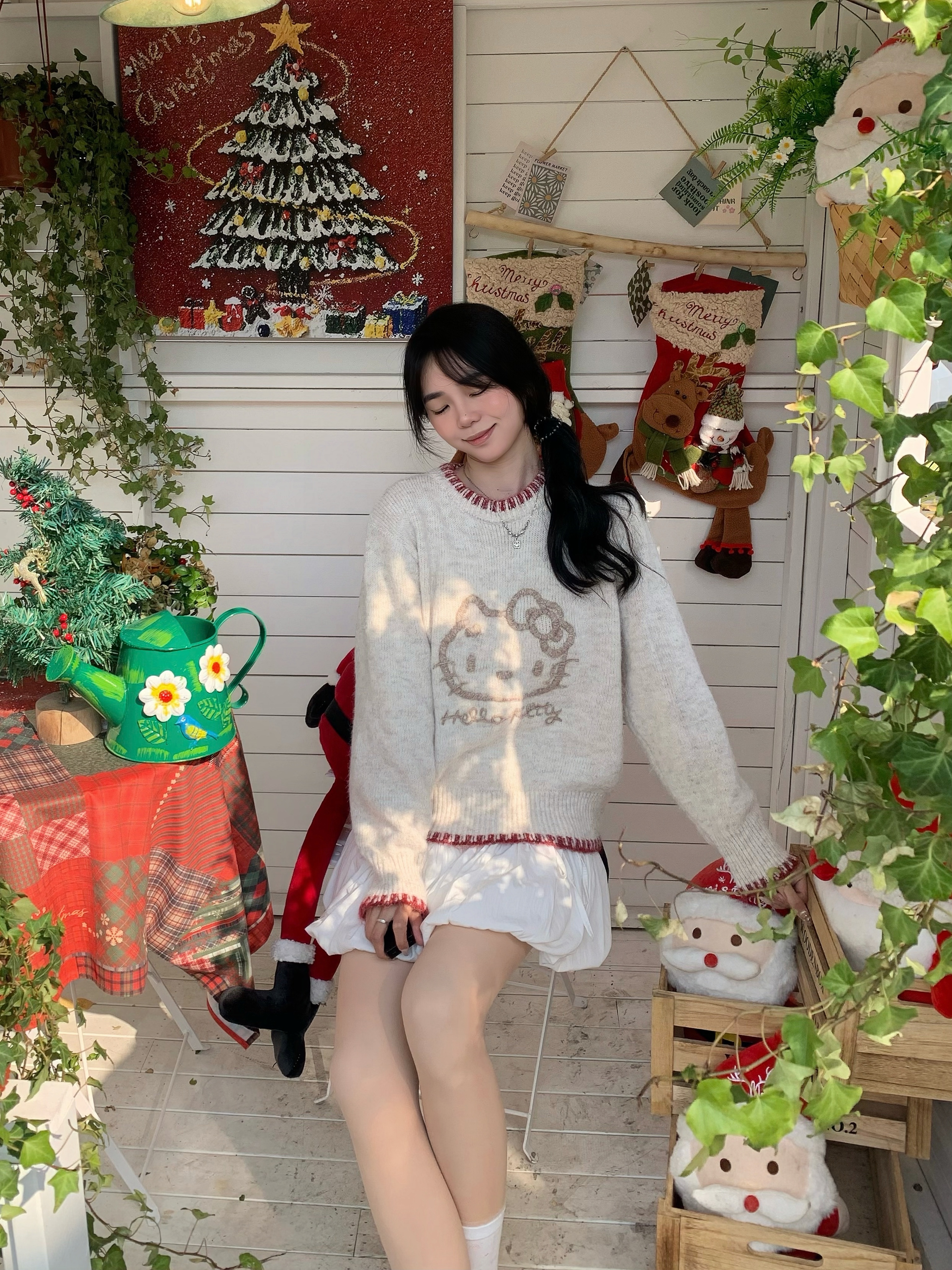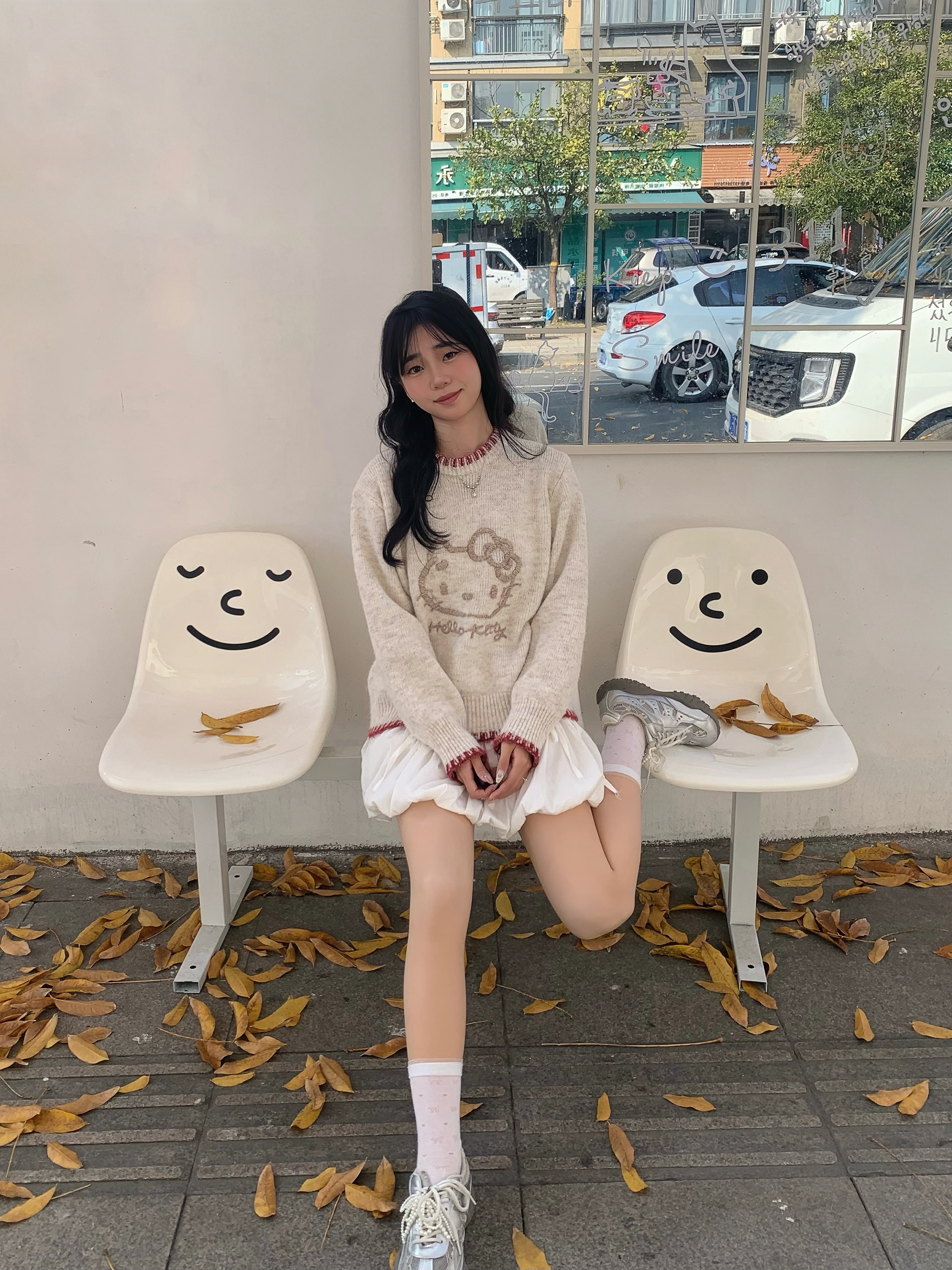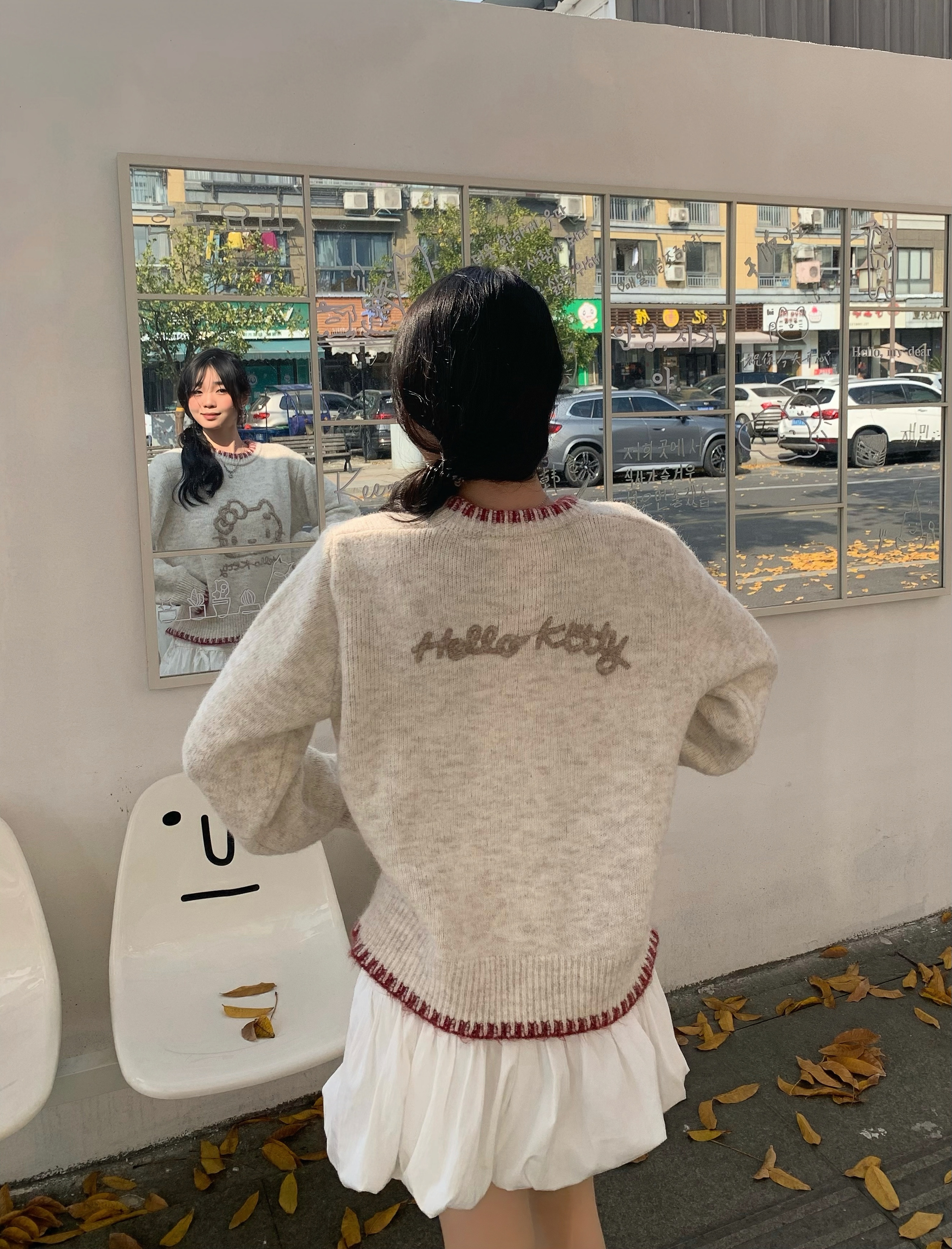 好温柔的毛衣软软糯糯的 穿着好舒服 最近好喜欢hellokitty风格的衣服~ 最主要在冬天穿在羽绒服里面也不会显得臃肿 图案印花很精致 搭配小短裙或者裤子都好好看~ kitty主义爱住了😻 搭配银色的鞋子更温柔啦~