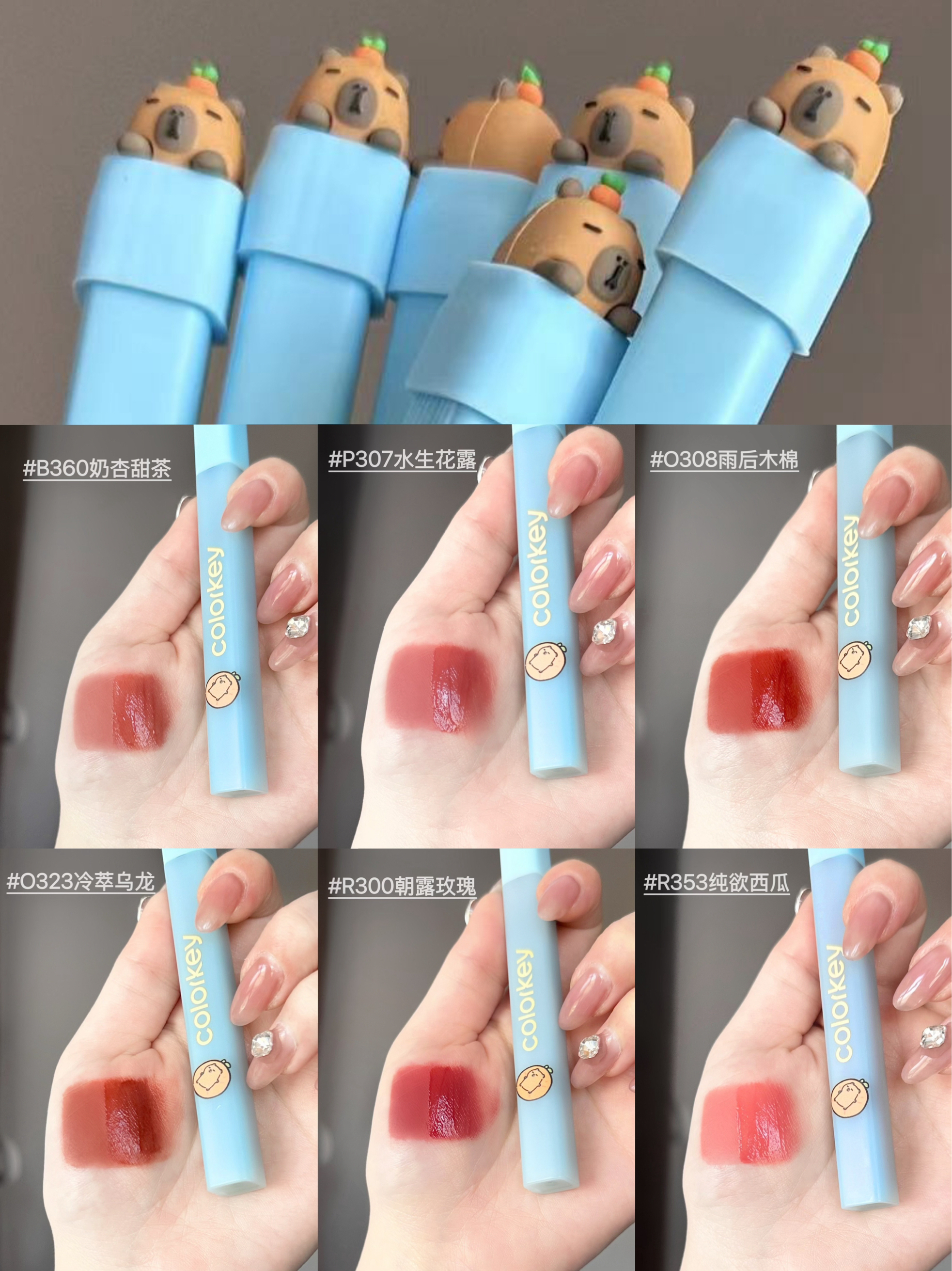 来人呐!卡皮巴拉萌晕我了 珂拉琪橘子水豚联名全试色来咯! 水雾唇露上嘴晕开依旧是轻薄的雾面 而且很持久不沾杯 - 🍊#O352佛系橘汁 元气感拉满的奶橘乌龙 低饱和杏橘色像一杯橘子汁 🍊#R353纯欲西瓜 甜妹感满满的冰镇西瓜瓤 黄皮深唇涂都显嫩的清纯白月光色 🍊#B360奶杏甜茶 松弛感无花果奶杏 伪素颜真神妥妥的淡人舒适区 🍊#P307水生花露 低饱和水蜜桃果汁色 有种娇生惯养的美感 不愧是口...