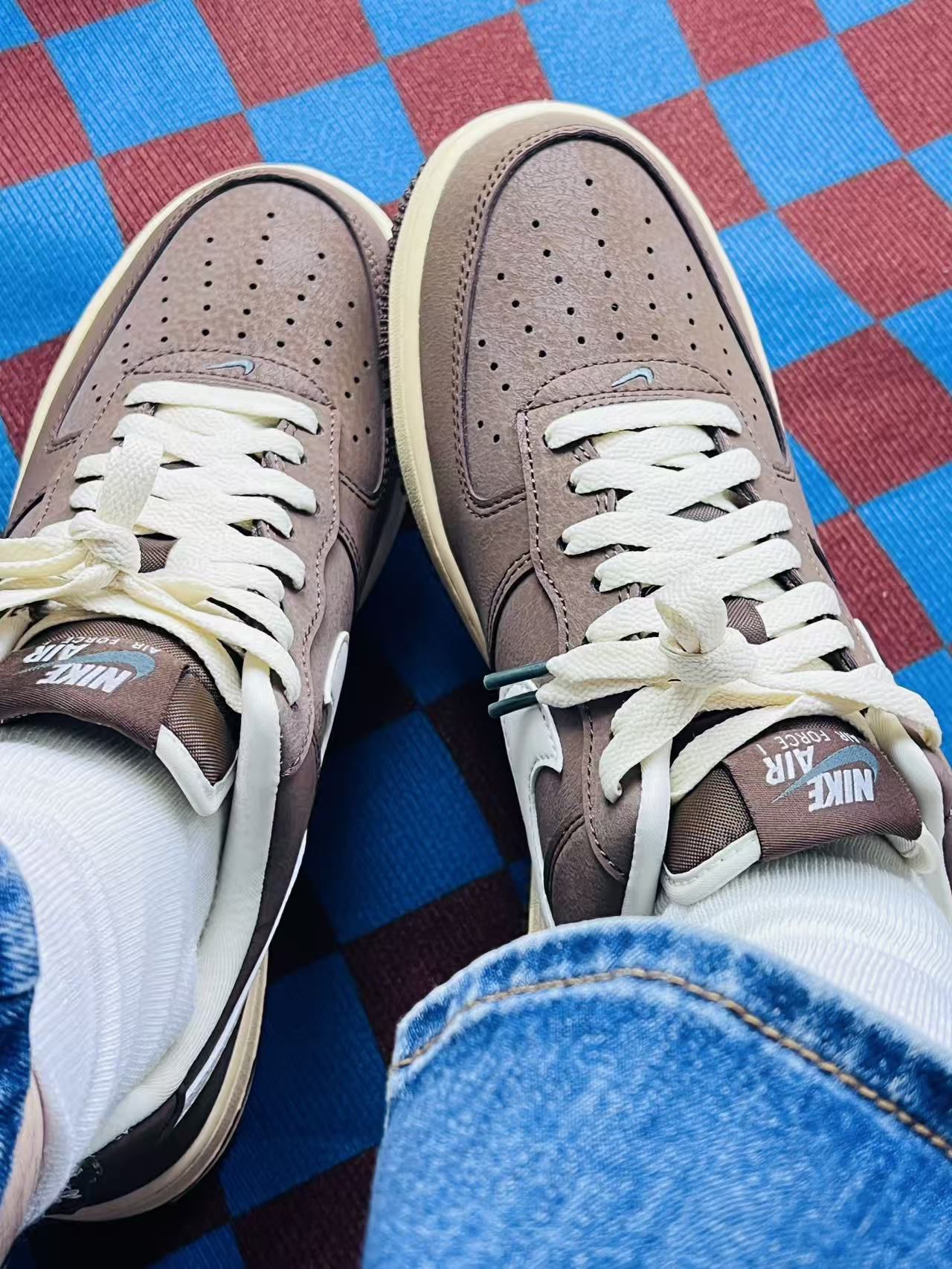 这双Nike Air Force 1的“咖啡棕”配色,上脚第一感觉是比想象中好搭太多🤎。 原本担心深棕色挑衣服,结果不管是浅色系的牛仔裤,还是偏日系的卡其裤都能融进去,连我常穿的白袜子都显得不单调。 皮质摸起来是那种有点绒感的麂皮+皮革拼接,不是光面的硬邦邦质感,刚上脚的时候包裹感刚好,不会磨后跟,走一下午也没觉得压脚背。 不过有个小缺点得说——鞋面的绒感部分不太耐脏,上周不小心蹭到一点奶...