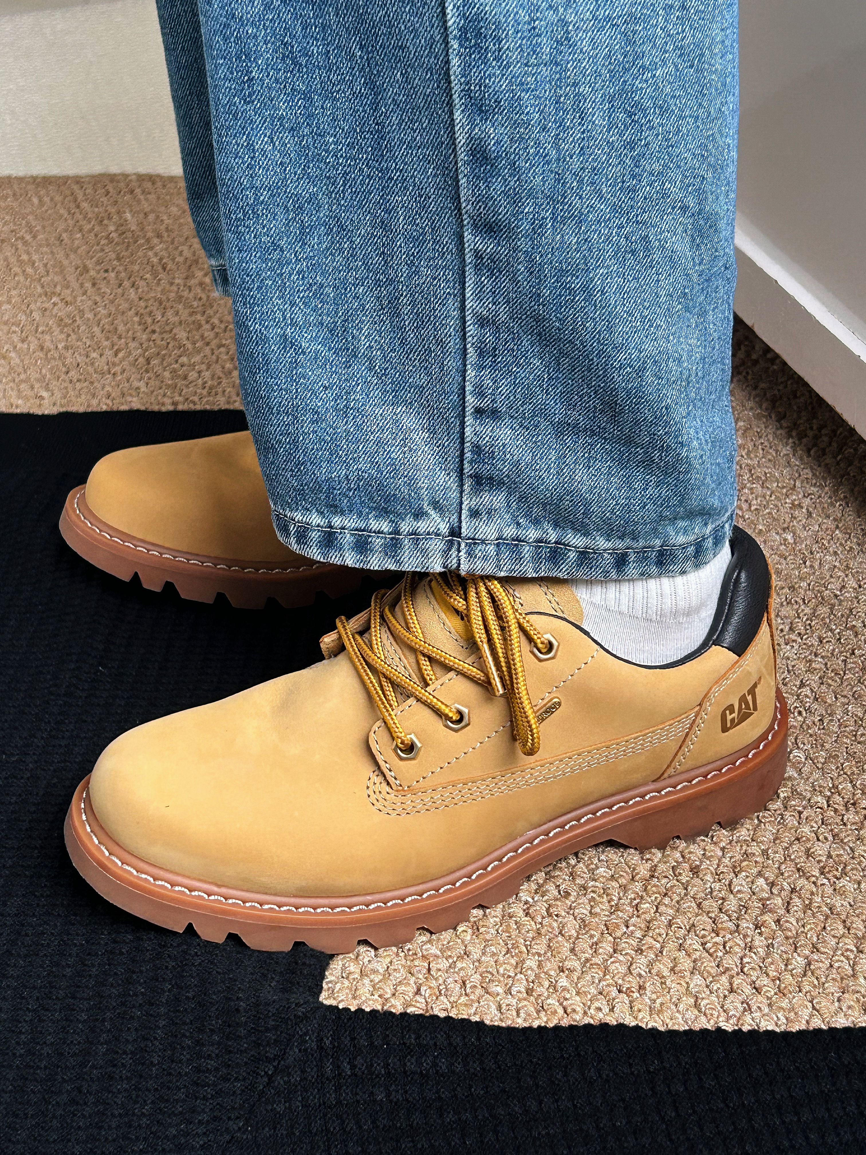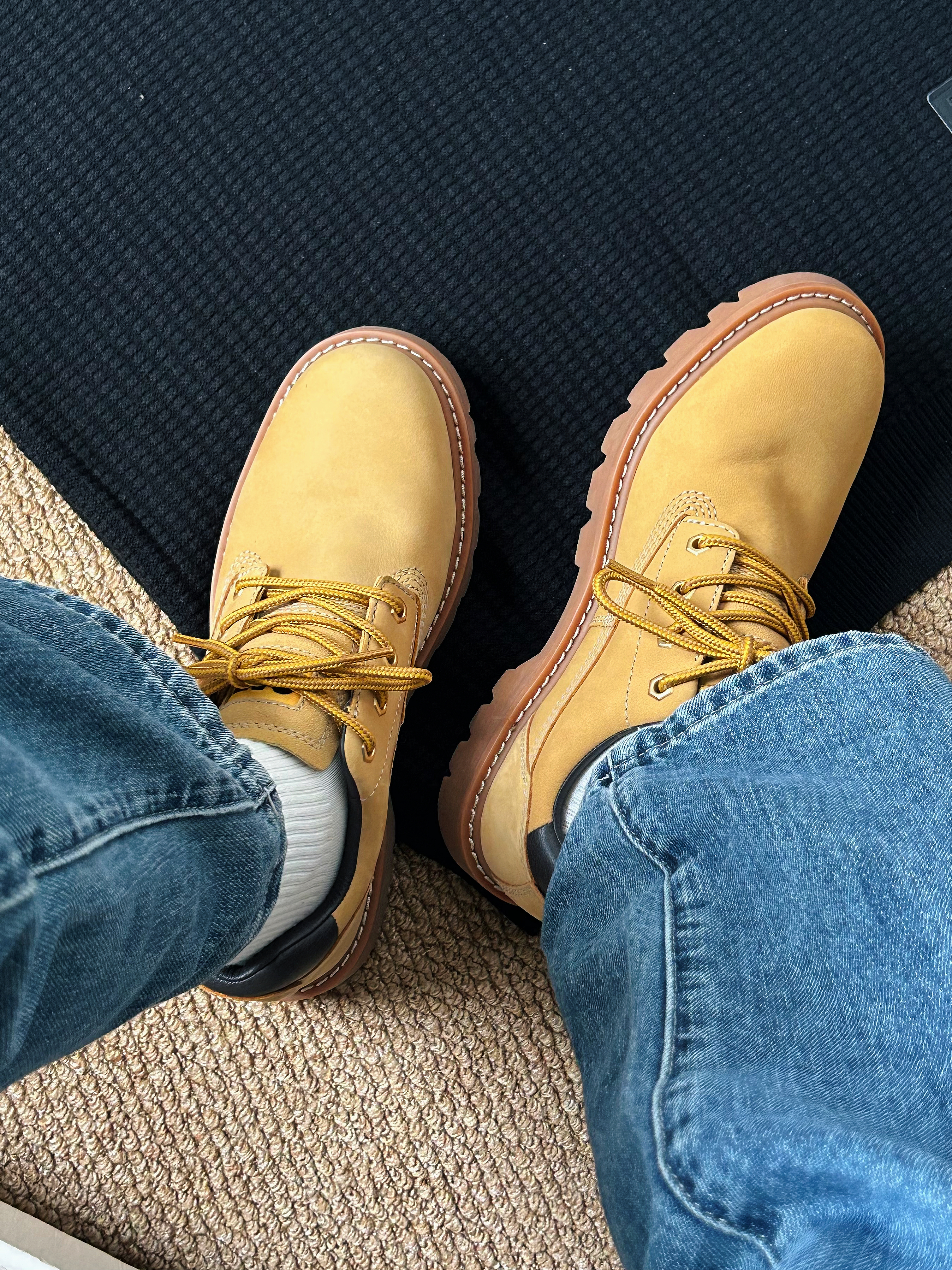 偶然入了这双CAT的大黄靴, 这颜色质感真太帅了! 鞋型挺阔有型,不重,还挺好驾驭, 今天出门裤装穿了件弯刀牛仔裤, 上身随意穿了件毛衣, 整体的穿搭没有什么亮点, 真的是纯靠这双大黄靴来点睛了! #CAT大黄靴