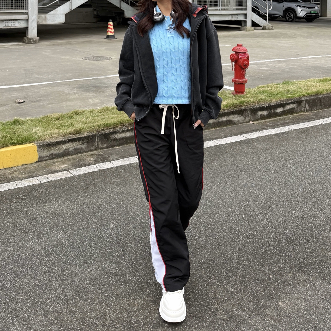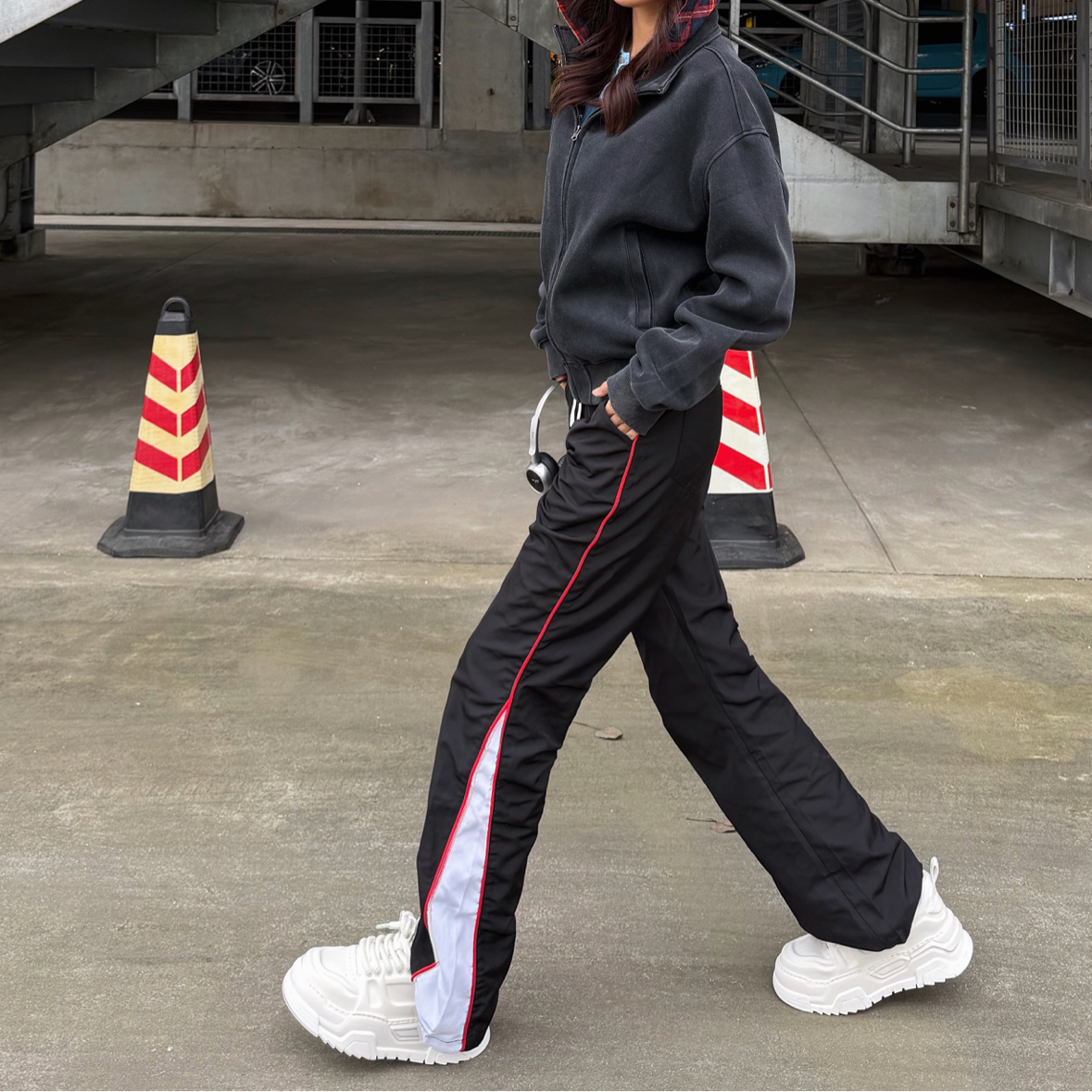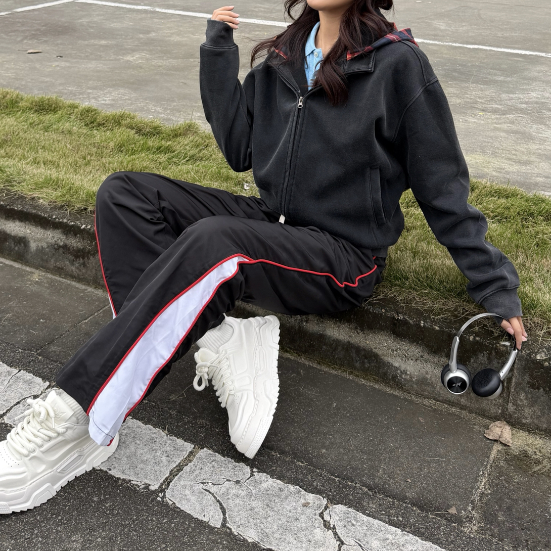 传奇商行这条微喇条纹裤也太懂显腿长了!黑红白条拼接超有街头感,微喇剪裁从脚踝处微微散开,视觉上腿长直接拉满 系带腰头可松可紧,梨形身材也能藏肉,垂坠面料走路带风不贴腿。搭卫衣是休闲潮酷风,配短款外套更显腰线,通勤、逛街、打卡拍照都适配,穿上直接解锁大长腿,小个子也能冲👍🏻