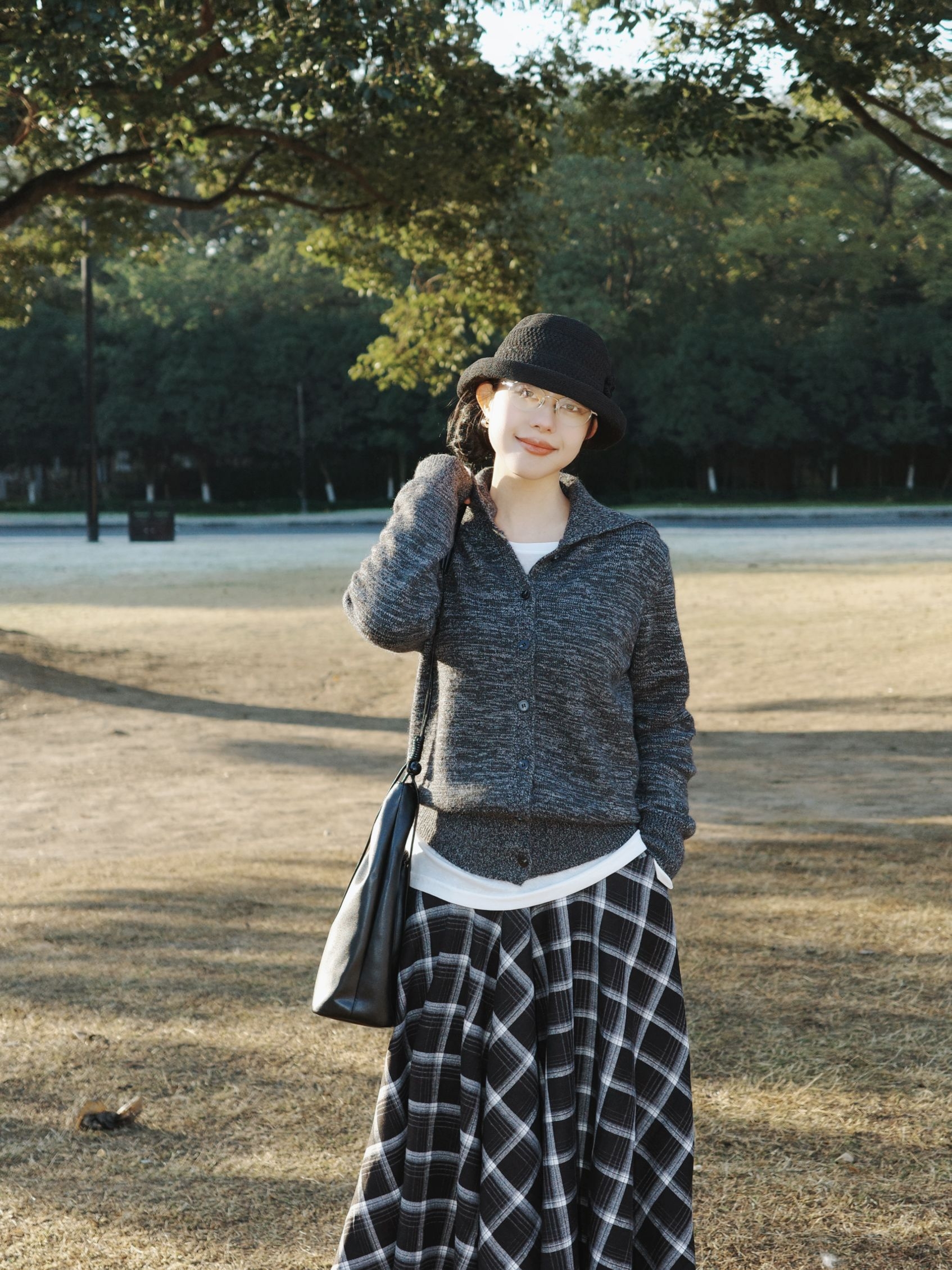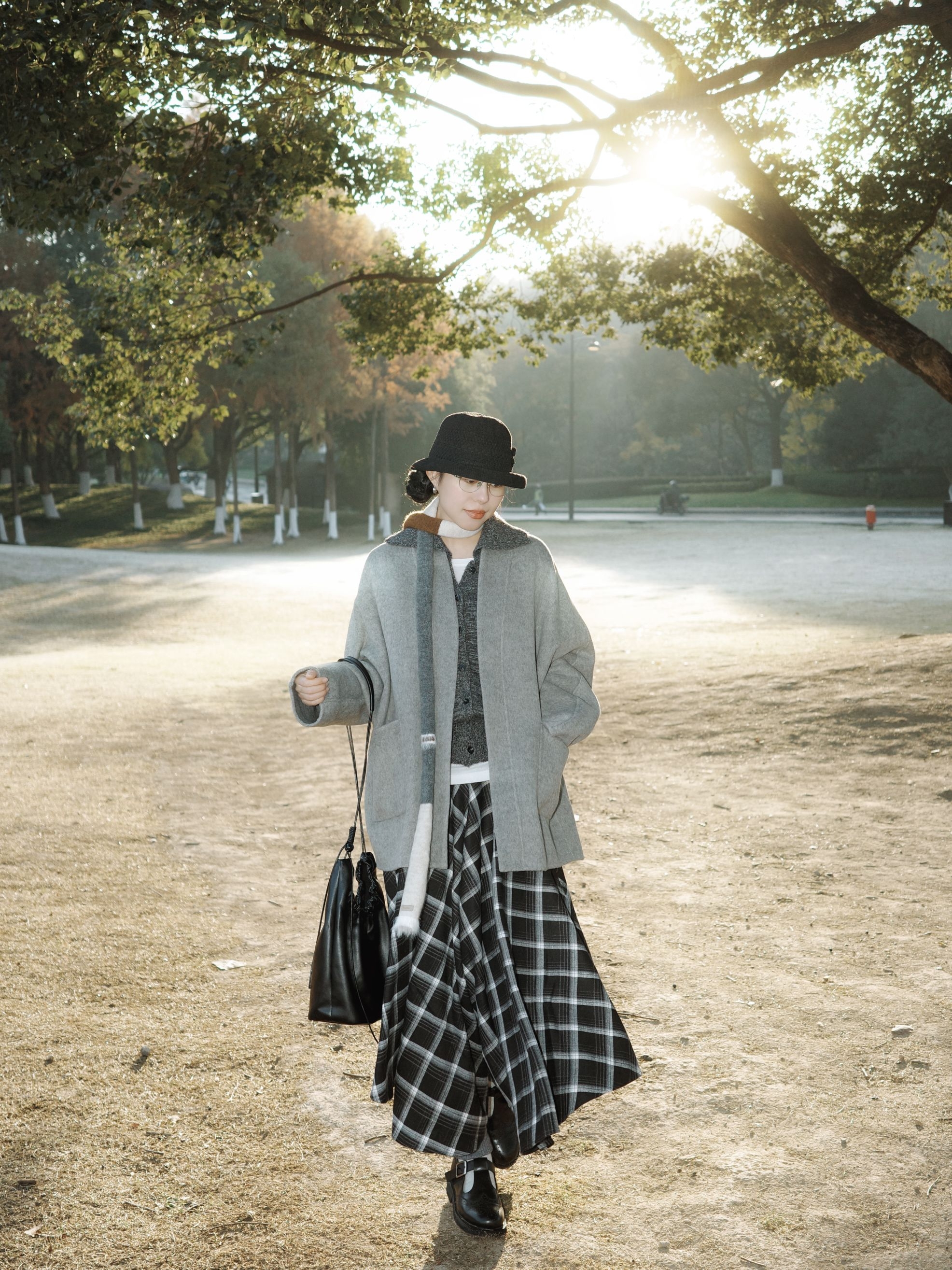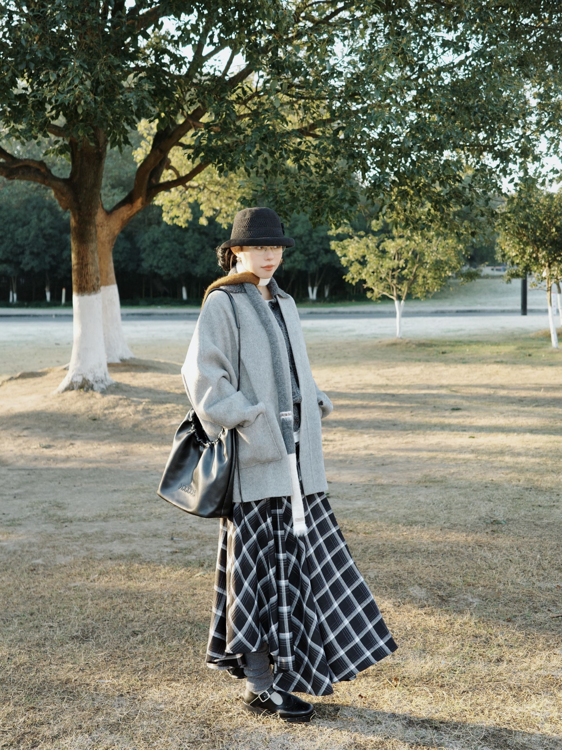公园的阳光穿过枝叶落下来,日系复古风就这么融进了十二月的公园里。 浅灰色大衣软软糯糯的,裹着身子特别有安全感,里面叠着白色内搭和深灰色针织衫,温温柔柔的层次感就出来了,拼接围巾绕在脖子上,还添了点细碎的小精致。 黑白格纹长裙坠着复古的调调,和灰色系的上装搭在一起,清冷又不失柔和,再配着黑色的小礼帽、皮质包包还有小皮鞋,整个人泡在公园的暖阳里,日系复古的慵懒感都要溢出来了。 十二月的风掠过树梢,把喜...