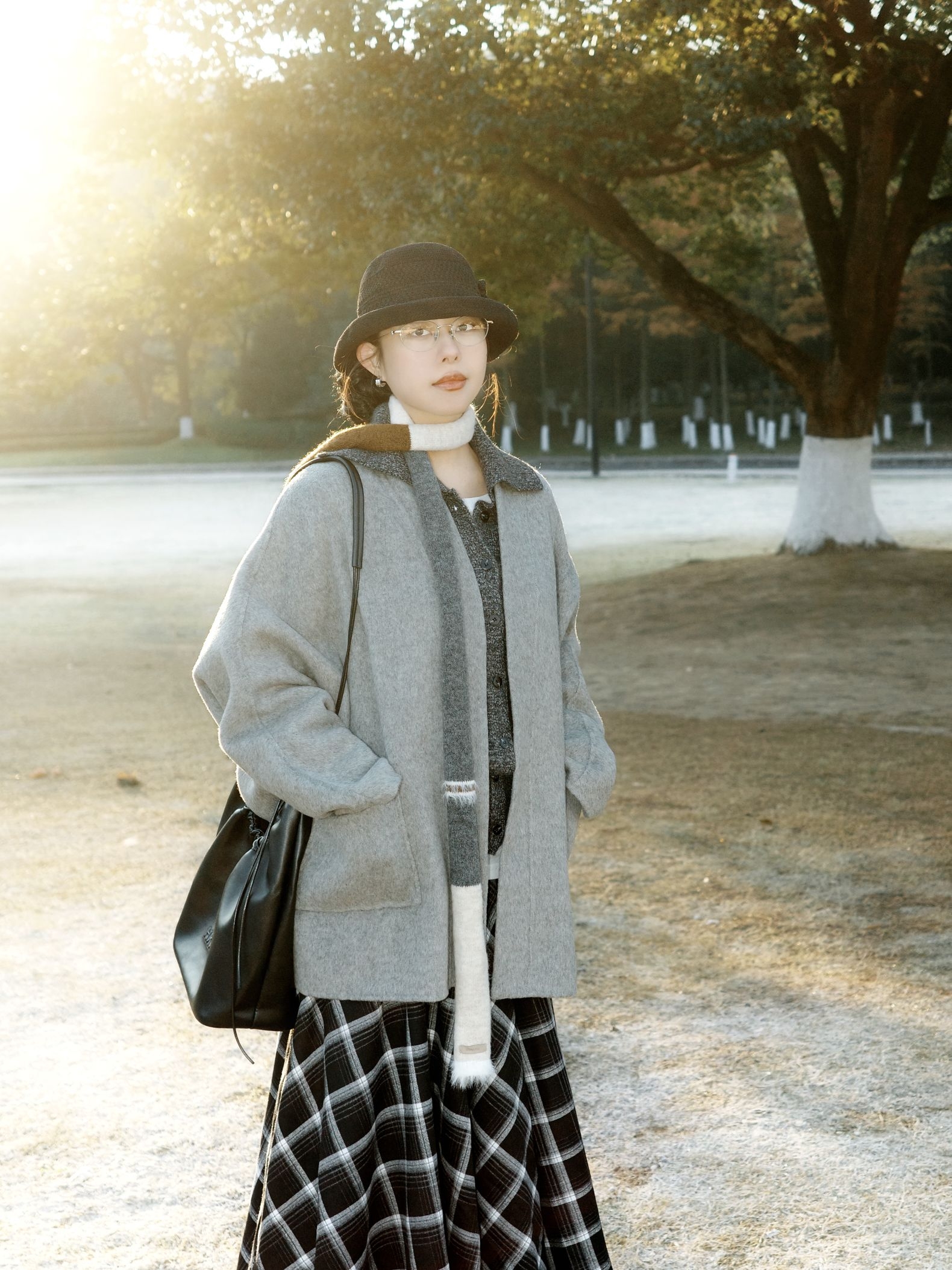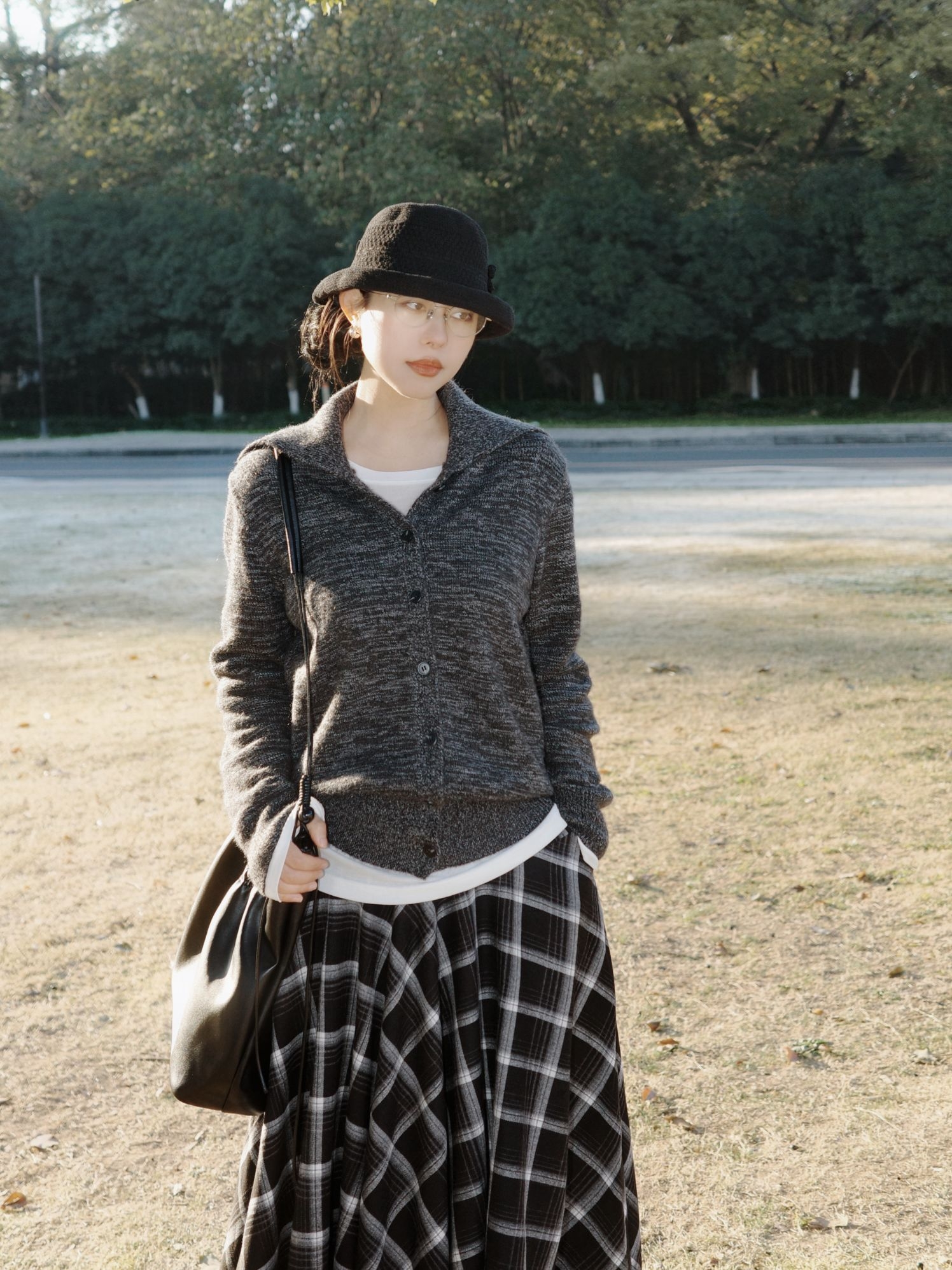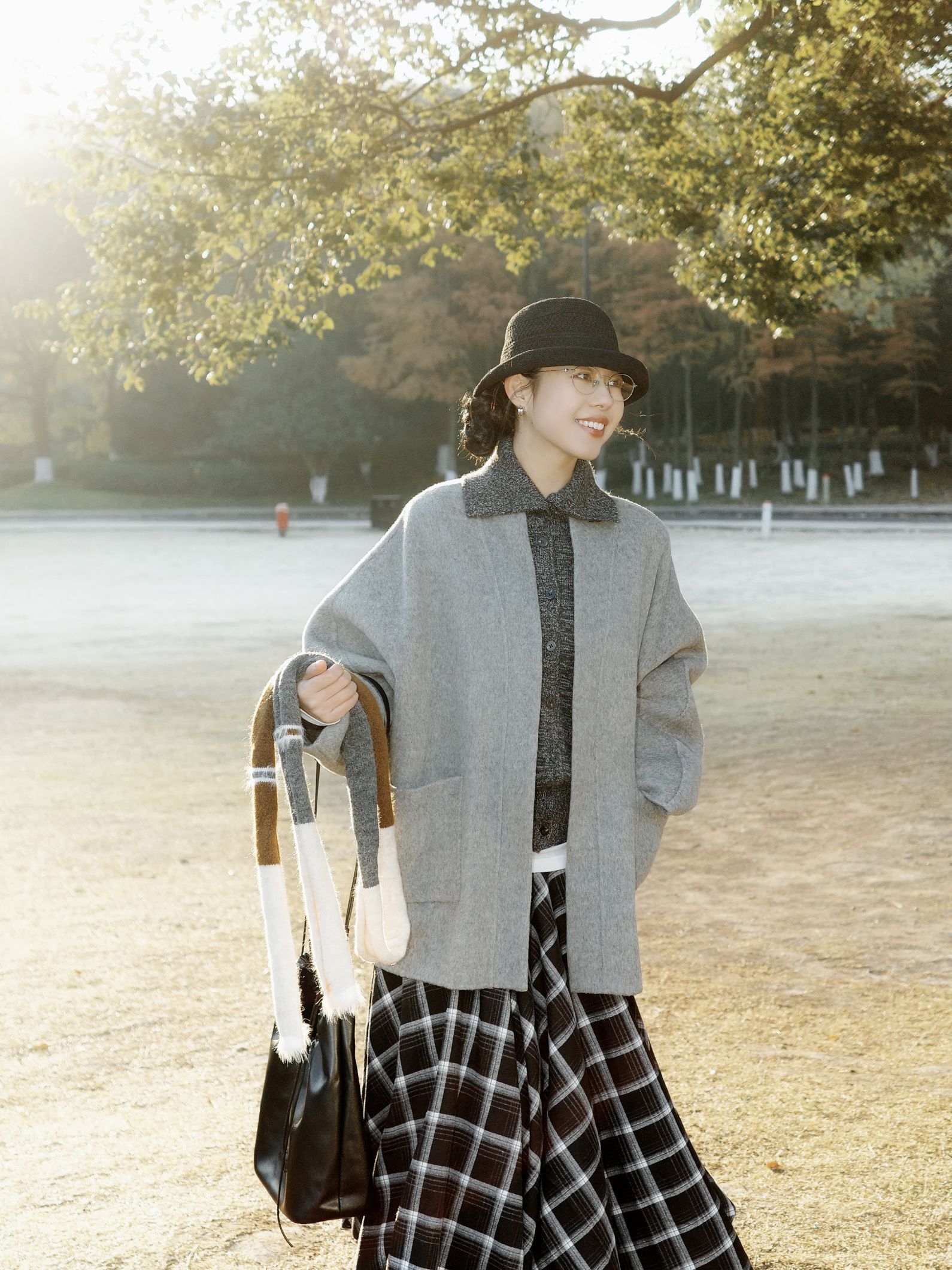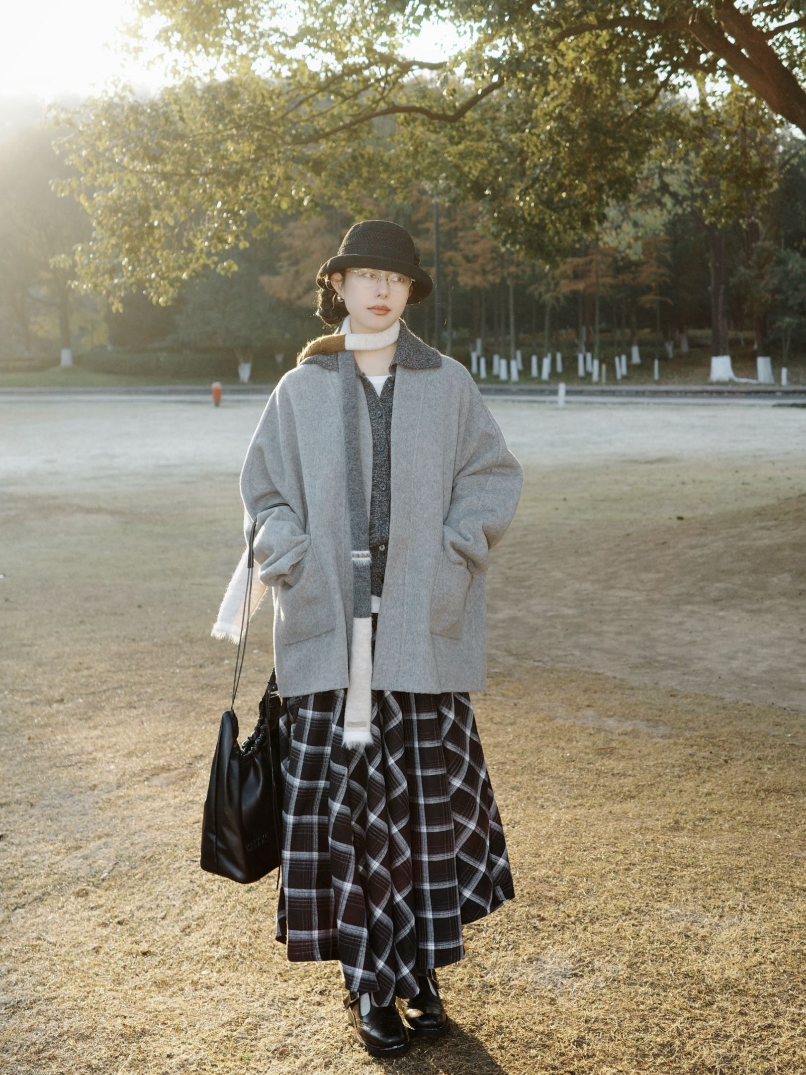 公园的阳光穿过枝叶落下来,日系复古风就这么融进了十二月的公园里。 浅灰色大衣软软糯糯的,裹着身子特别有安全感,里面叠着白色内搭和深灰色针织衫,温温柔柔的层次感就出来了,拼接围巾绕在脖子上,还添了点细碎的小精致。 黑白格纹长裙坠着复古的调调,和灰色系的上装搭在一起,清冷又不失柔和,再配着黑色的小礼帽、皮质包包还有小皮鞋,整个人泡在公园的暖阳里,日系复古的慵懒感都要溢出来了。 十二月的风掠过树梢,把喜...