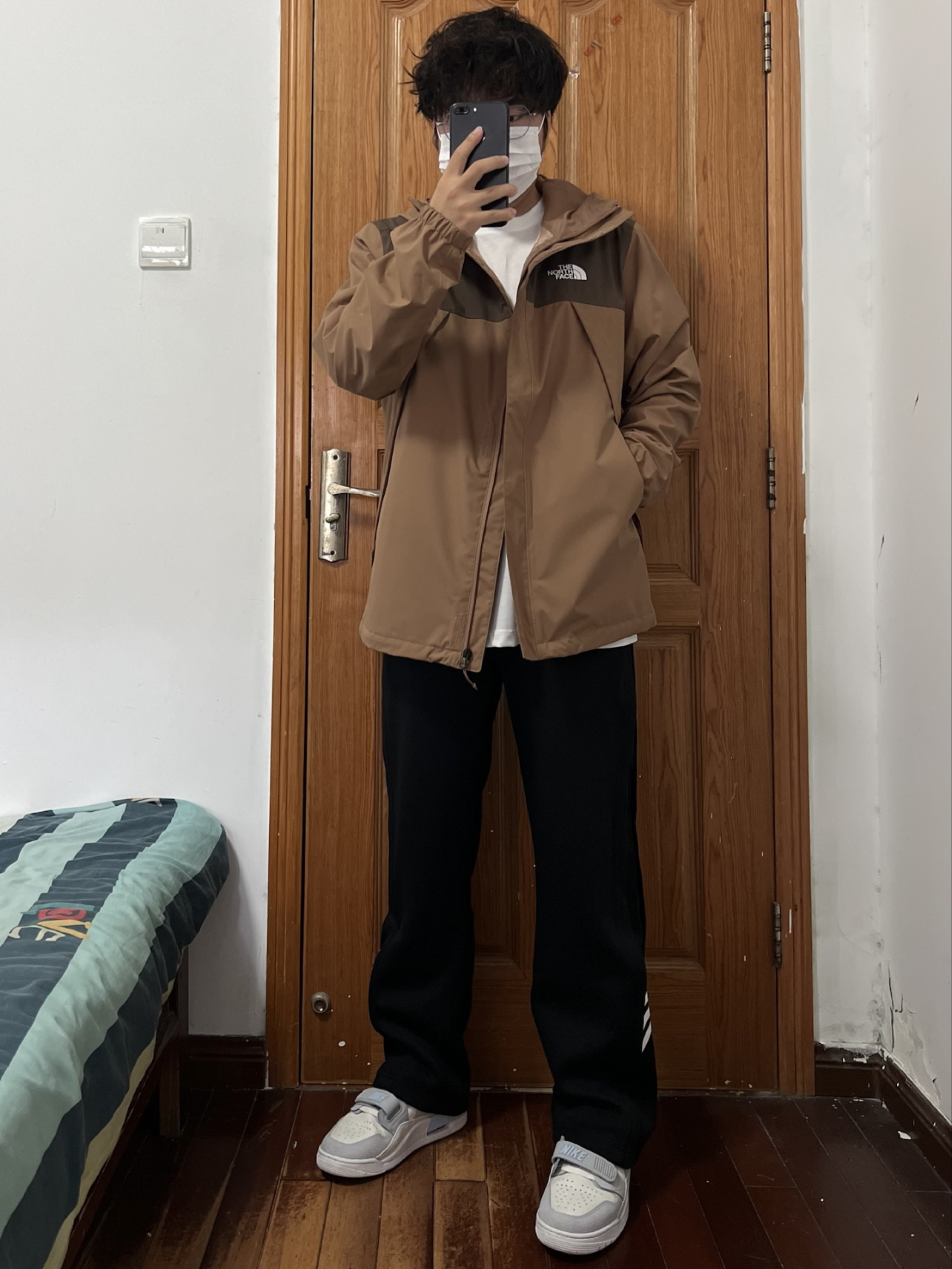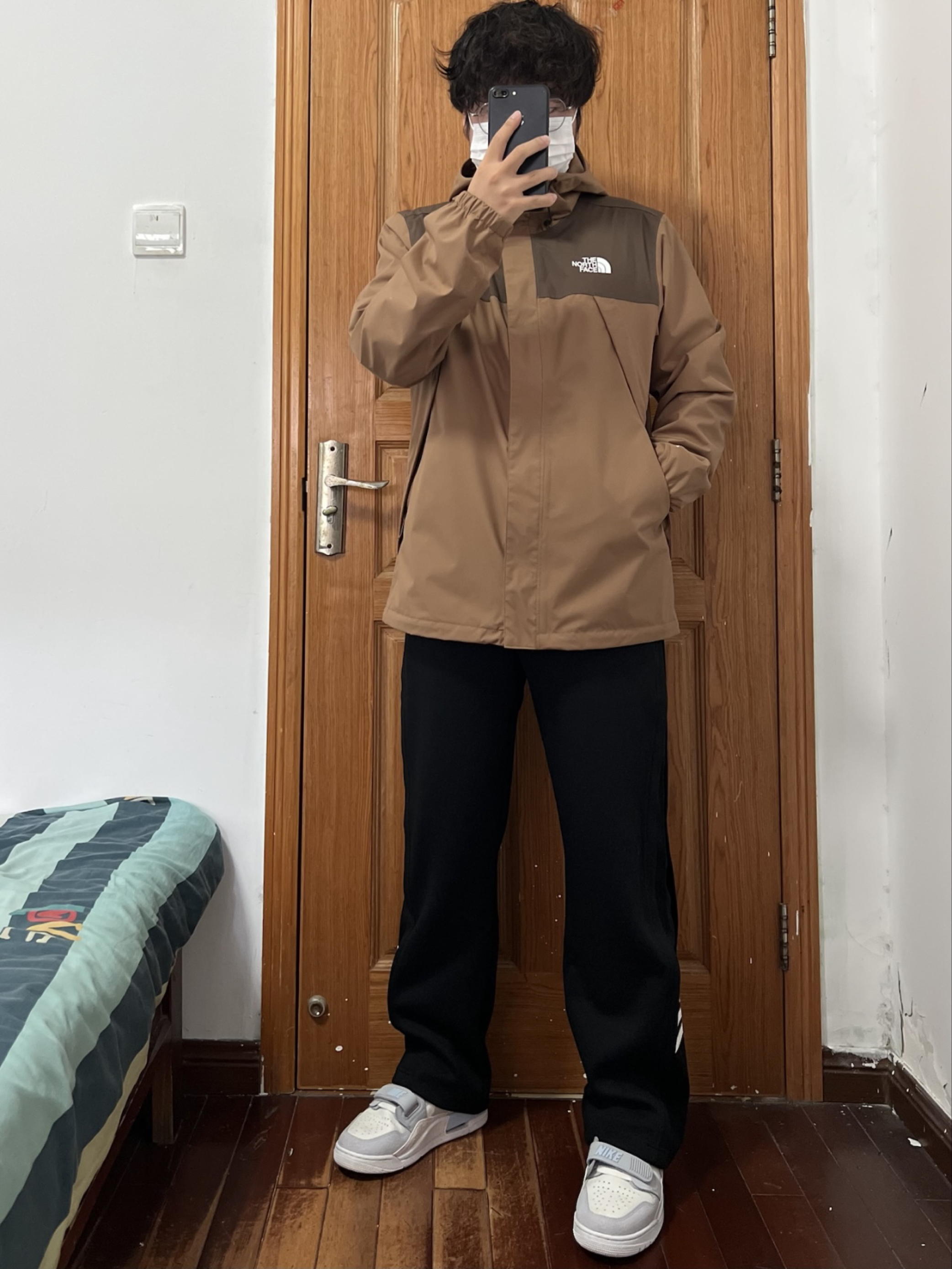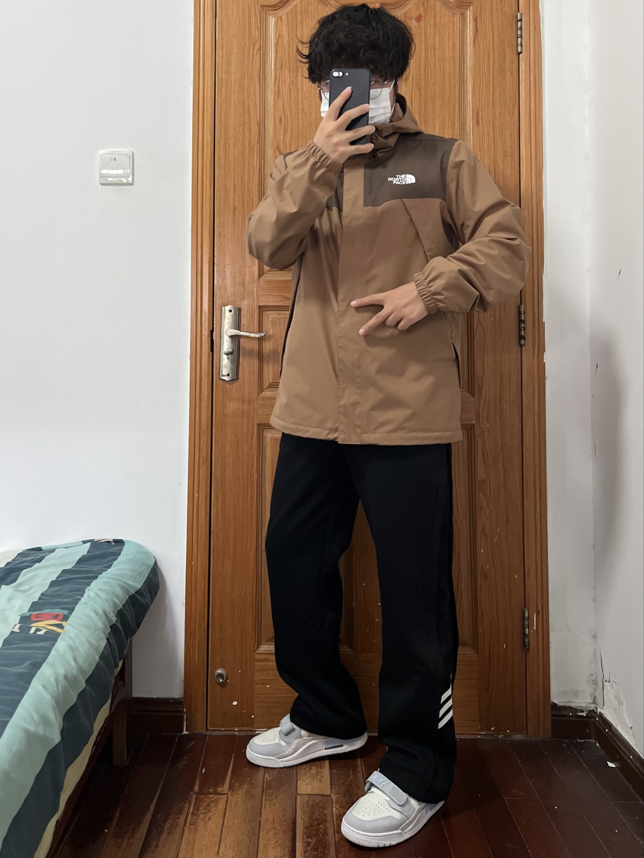 今日份我的穿搭分享🎉 现在都没人买北面单层冲锋衣了吧 那我反季抄底这个颜色绝对帅✌️ 两种不同深度的棕色组合💯 我内搭件羽绒内胆刚刚好拿捏冬天 170/130斤 👔 L 👖 M