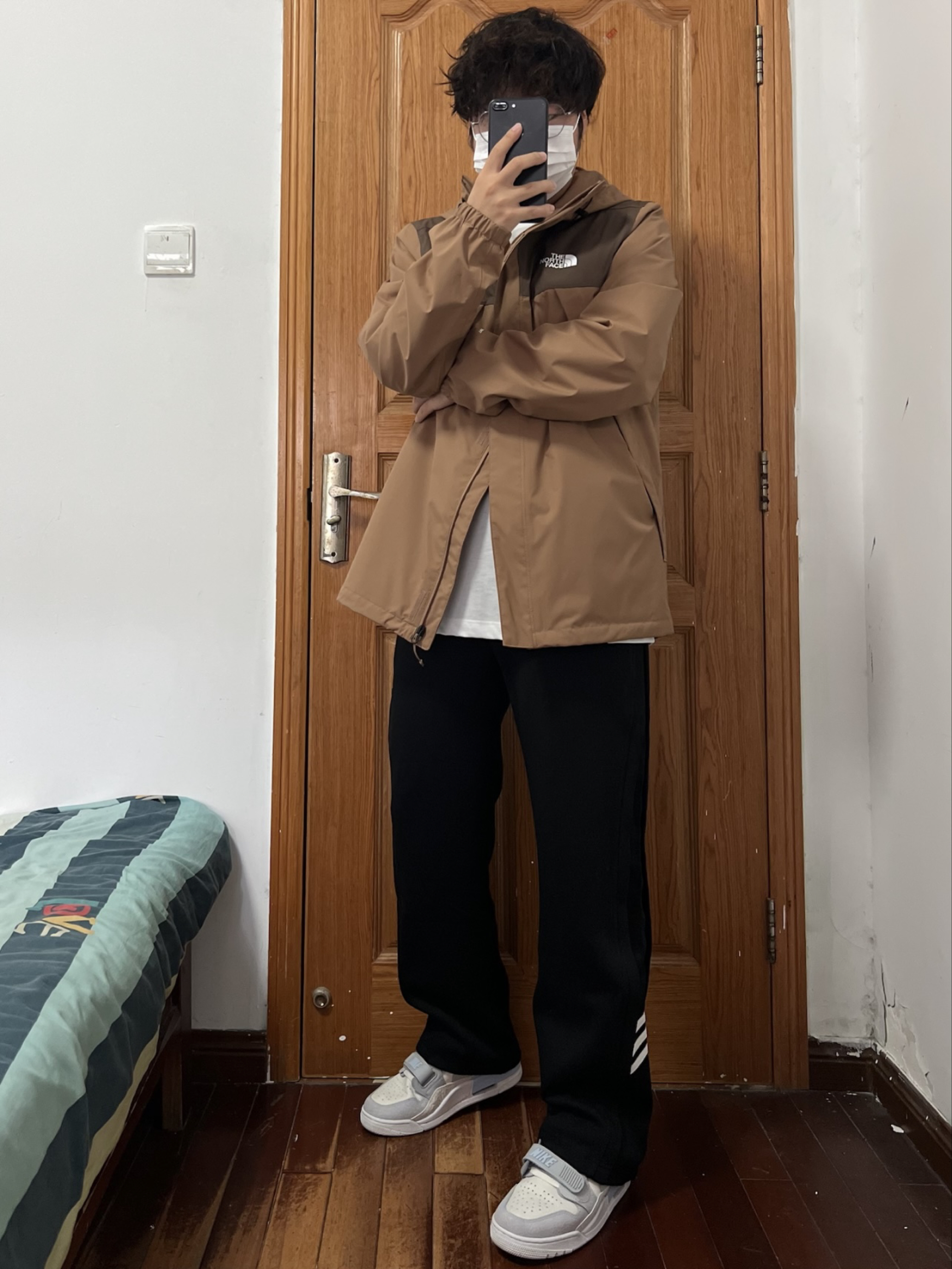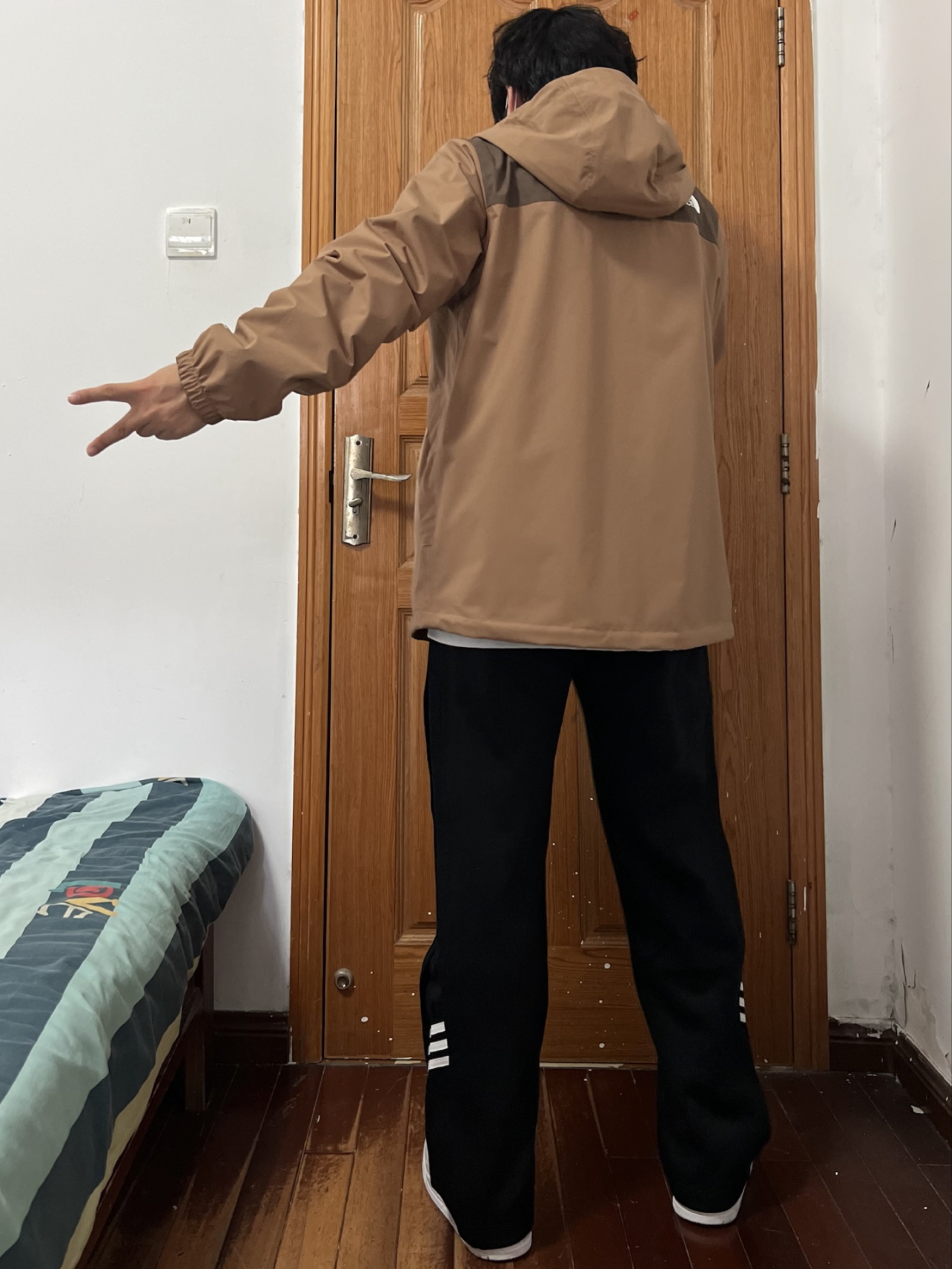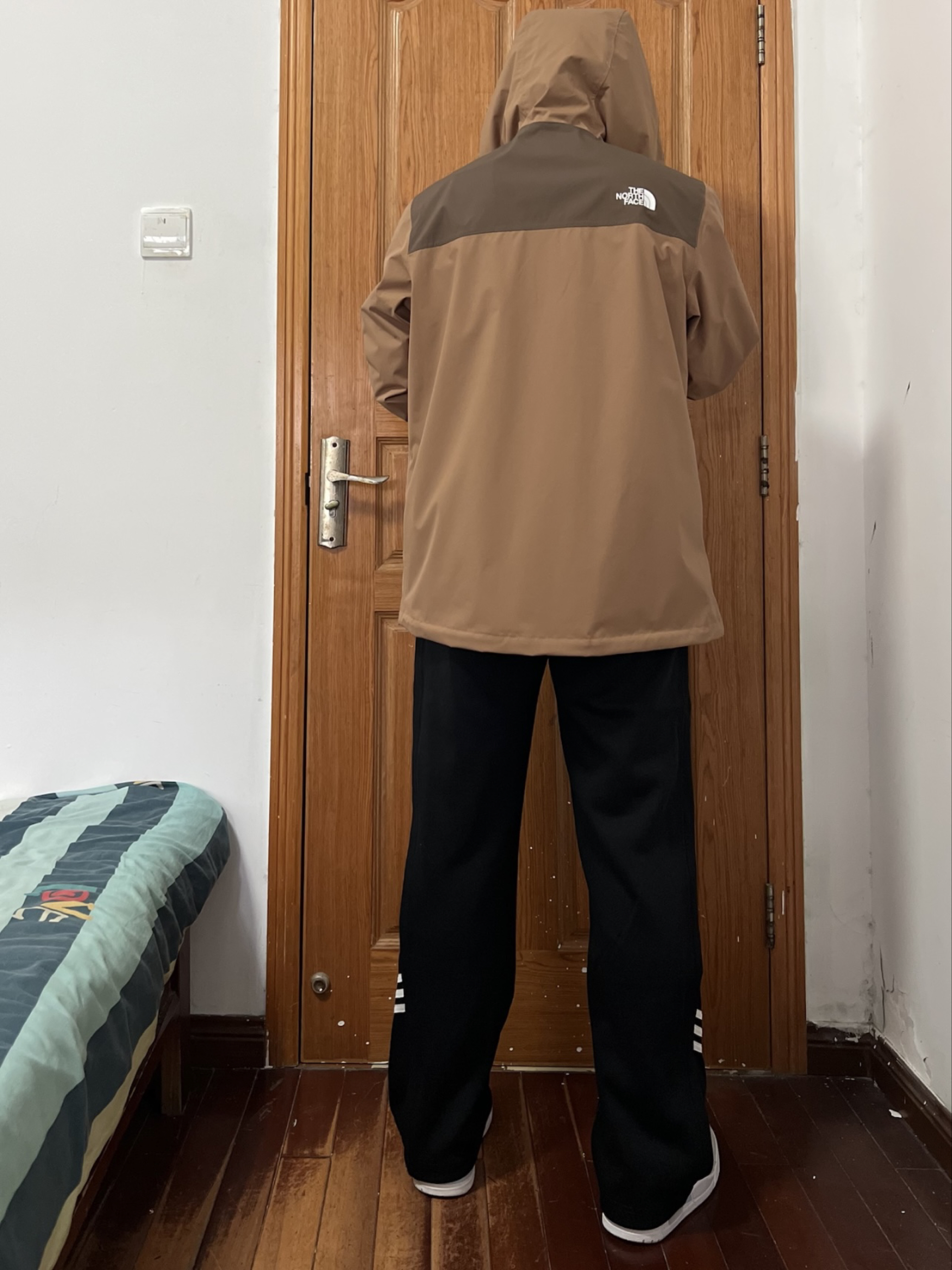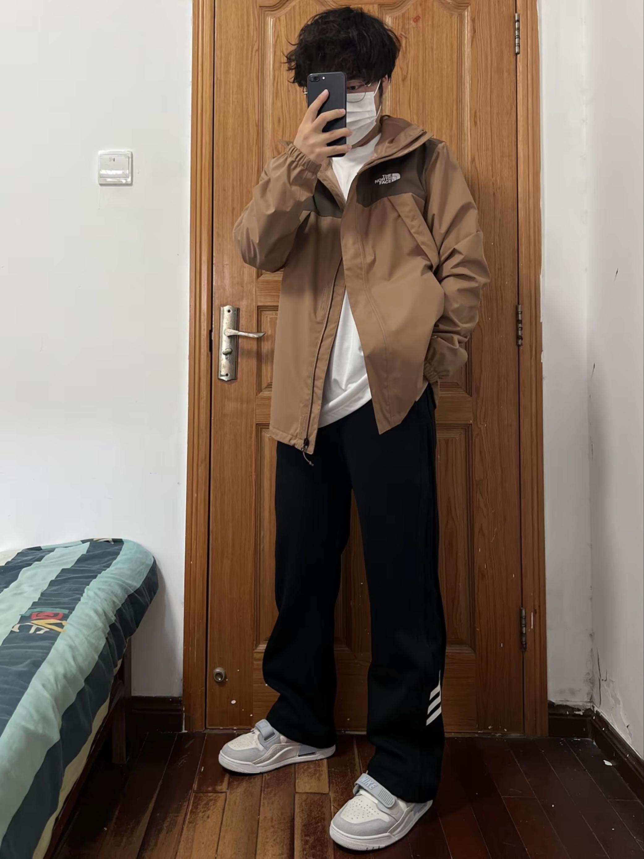 今日份我的穿搭分享🎉 现在都没人买北面单层冲锋衣了吧 那我反季抄底这个颜色绝对帅✌️ 两种不同深度的棕色组合💯 我内搭件羽绒内胆刚刚好拿捏冬天 170/130斤 👔 L 👖 M