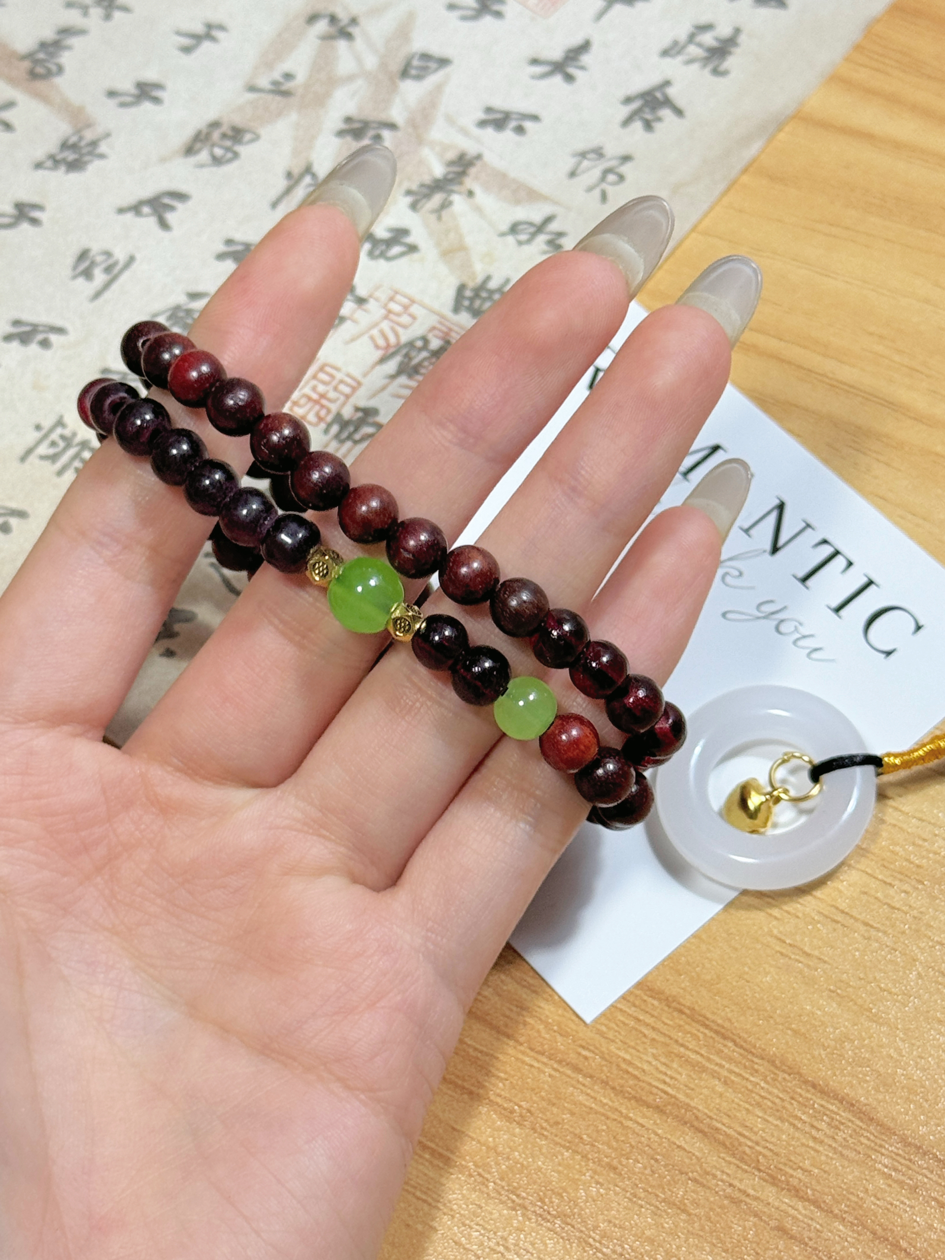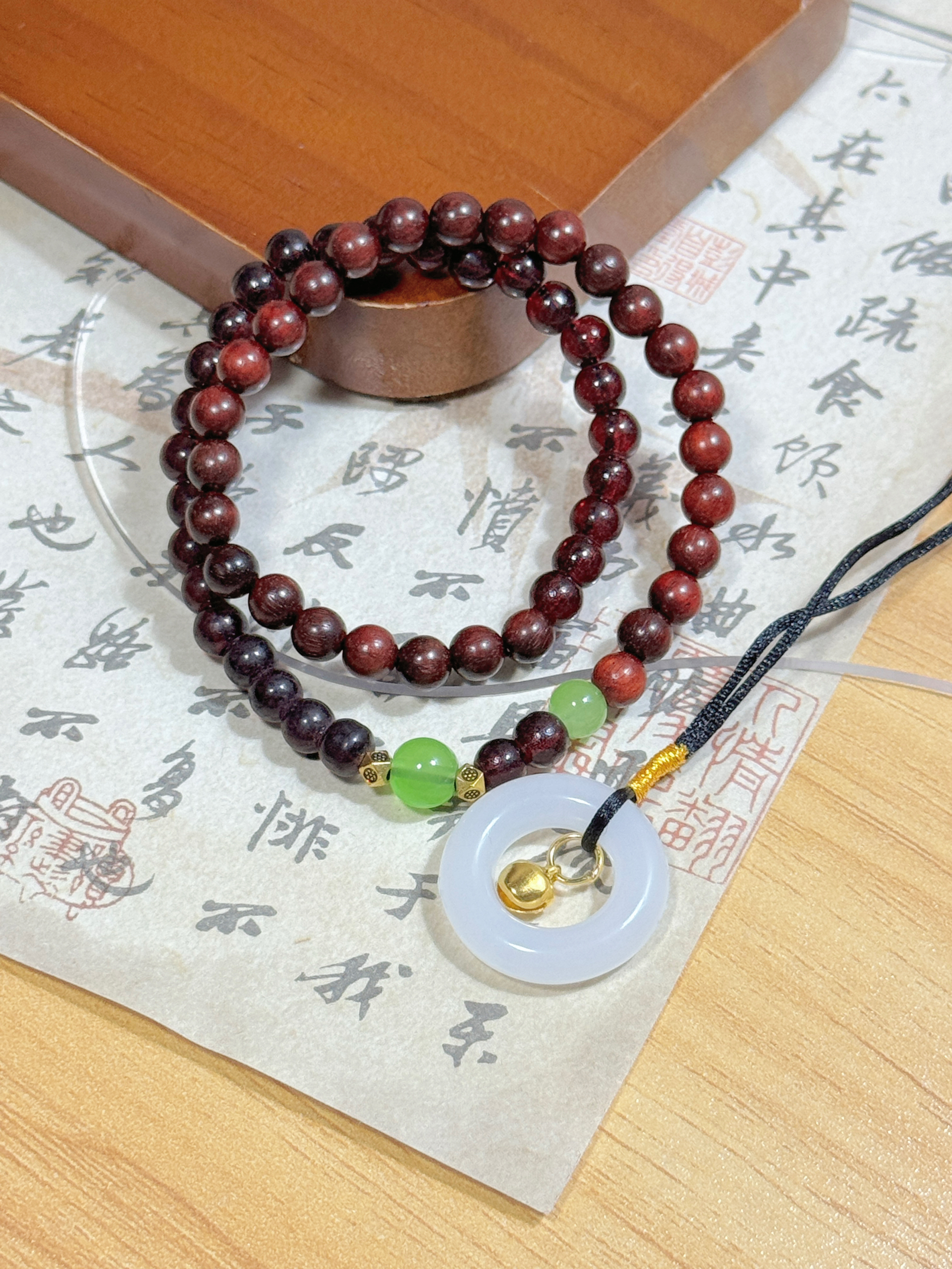 之前怕木串显老,这条加足金扣的完全不会 红棕木珠衬气质,绿珠添灵动感 平安扣是轻甜的贵气 绕两圈配卫衣是慵懒,配旗袍是古韵 戴了两周木珠更润,日常随便搭都不突兀