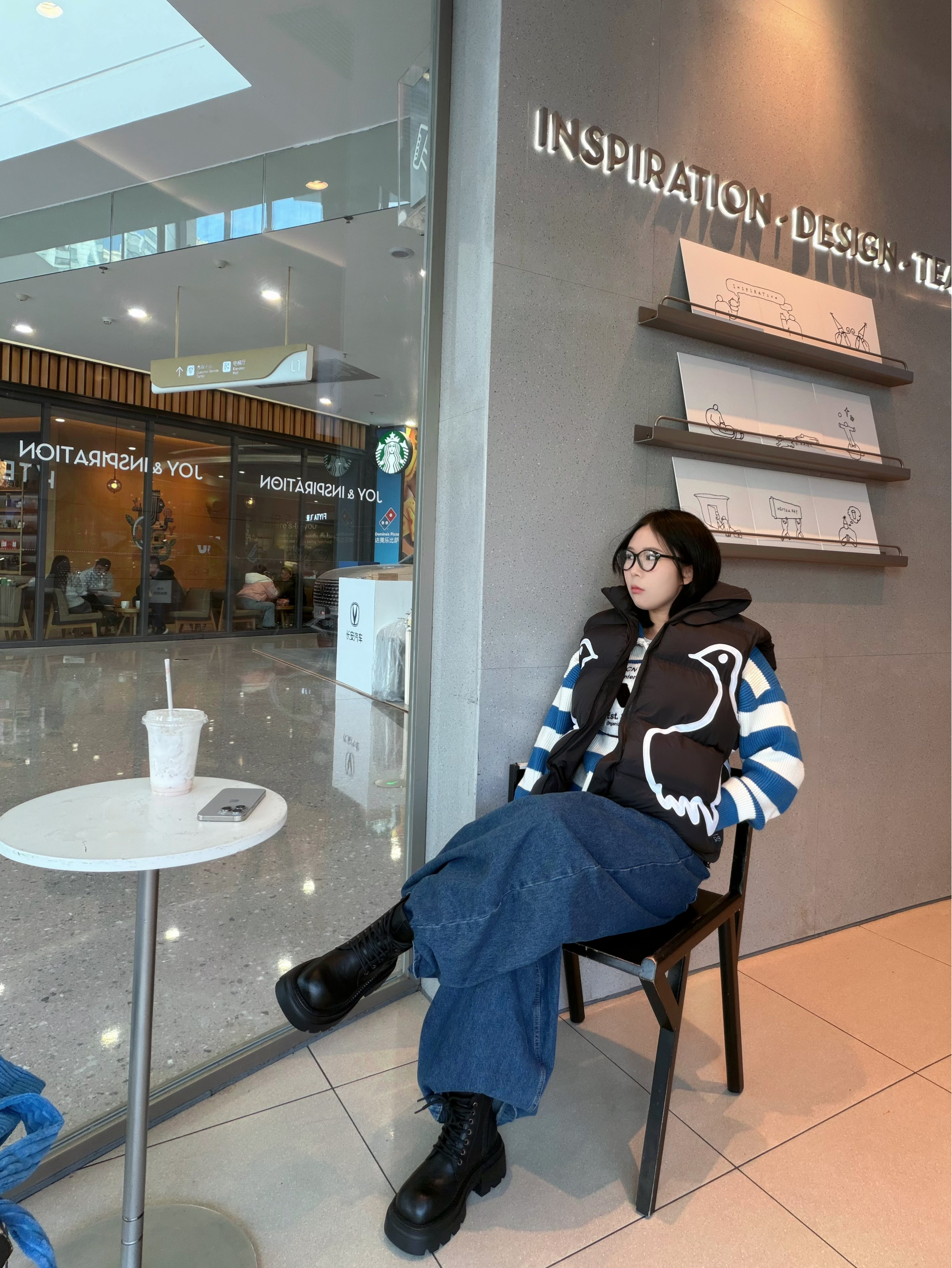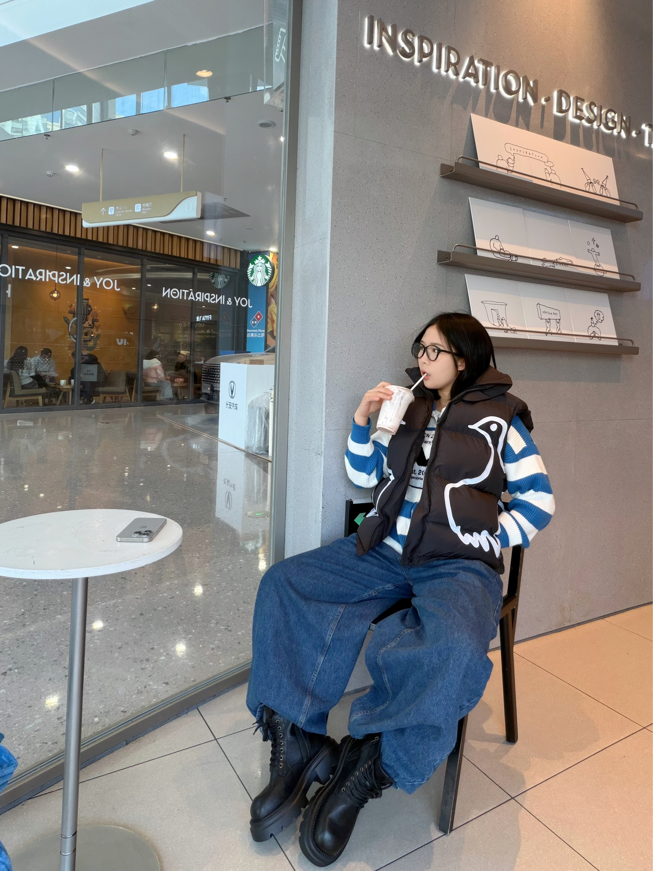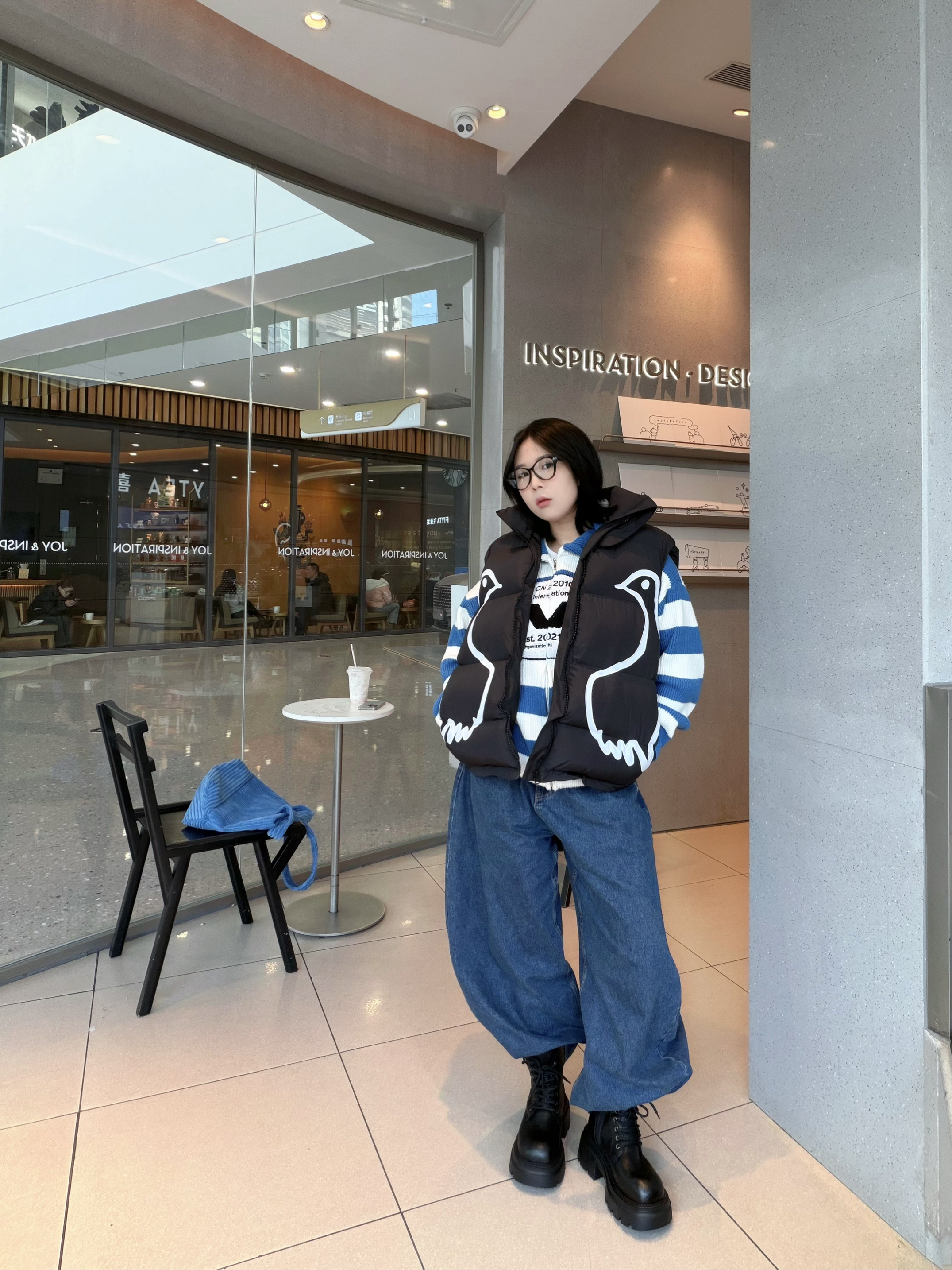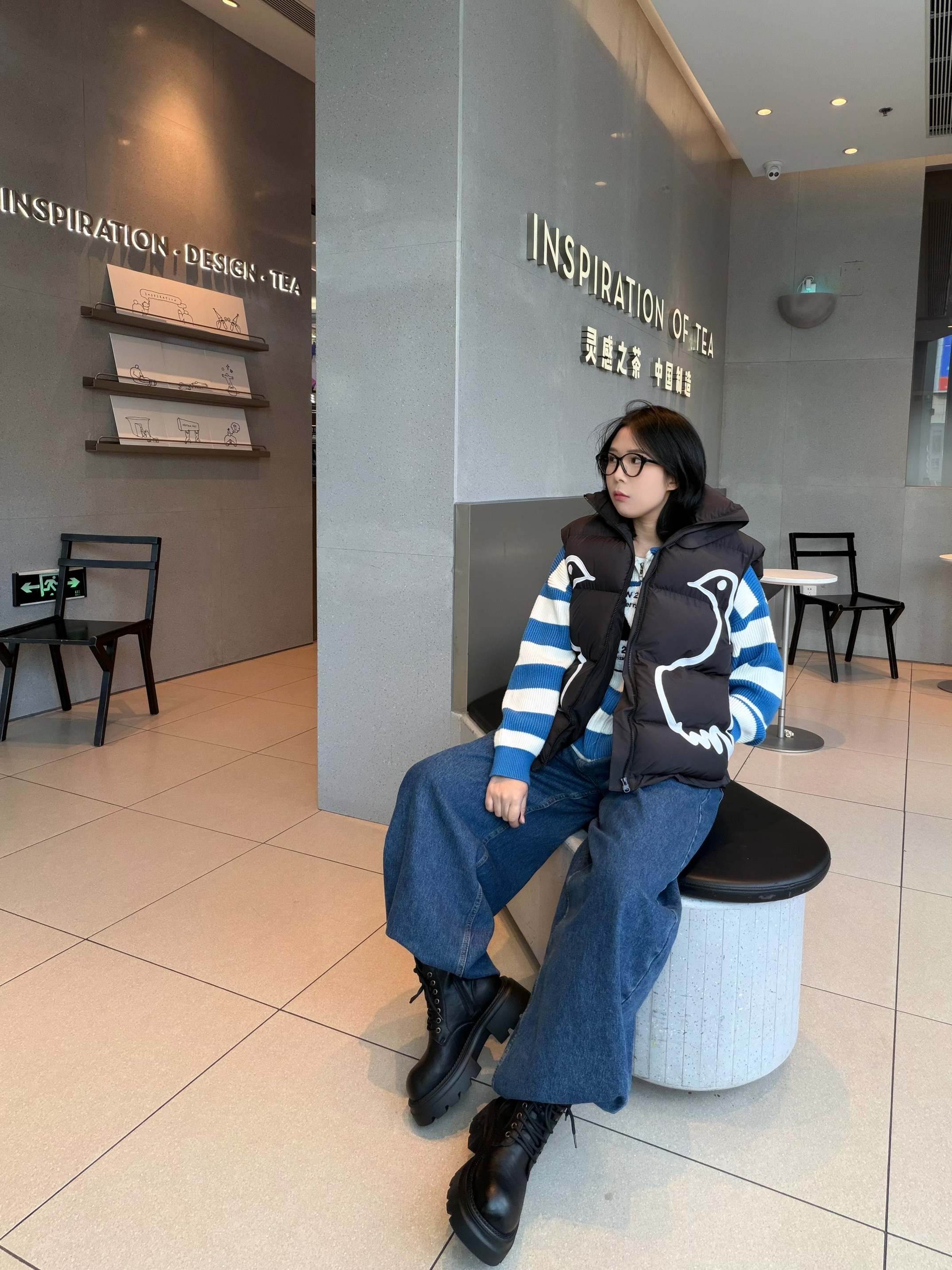 圣诞穿搭 整点酷🆒的! 蓝色连帽针织衫打底外搭黑色马甲 保暖有层次感 搭配阔腿牛仔裤,轻松拿捏时尚潮流感 鞋子选择了 ZHR 黑色厚底马丁靴 上脚高级百搭,厚底设计上脚显高显瘦 黑色百搭耐看,虽然是厚底,但脚感轻盈舒适 圣诞来临之际,一起穿的酷一些吧!