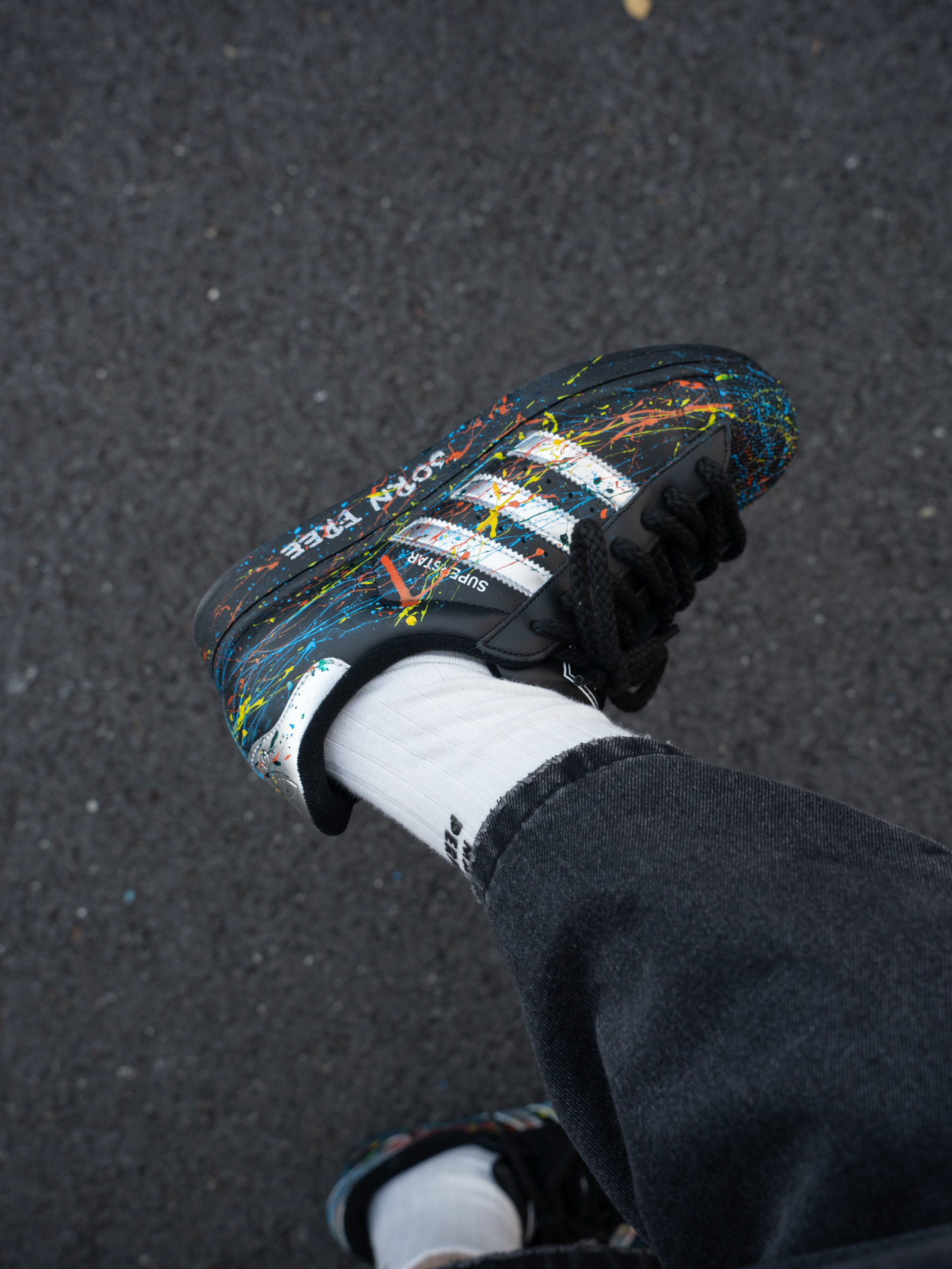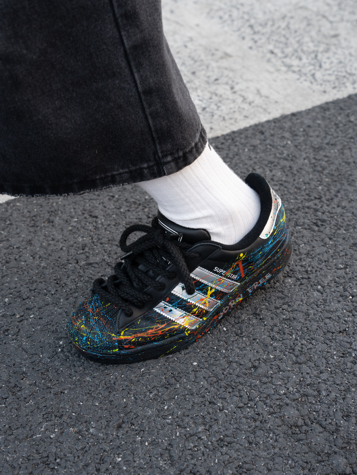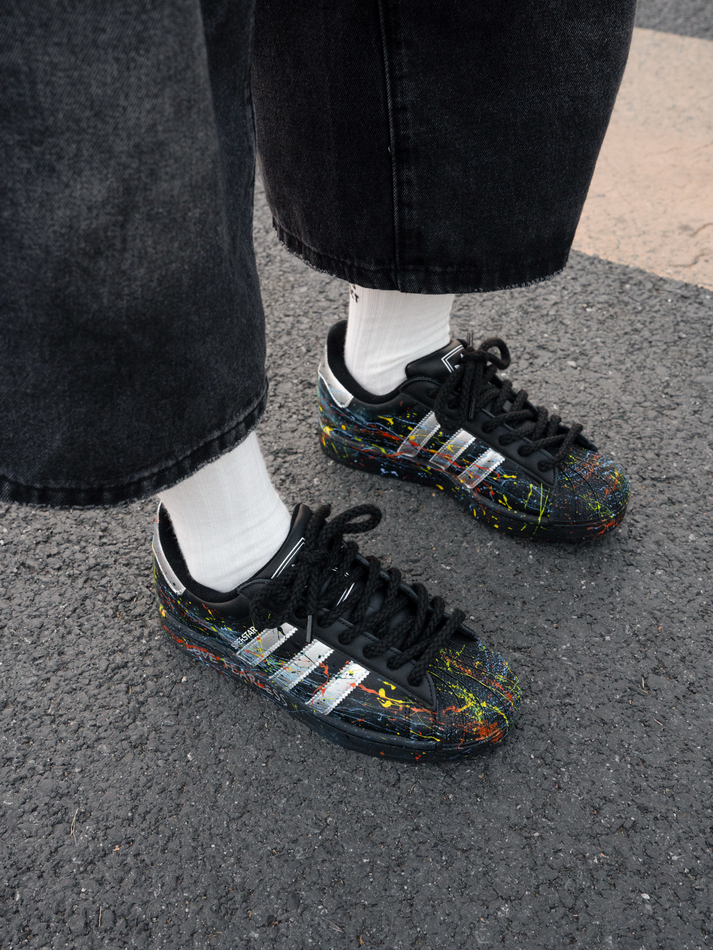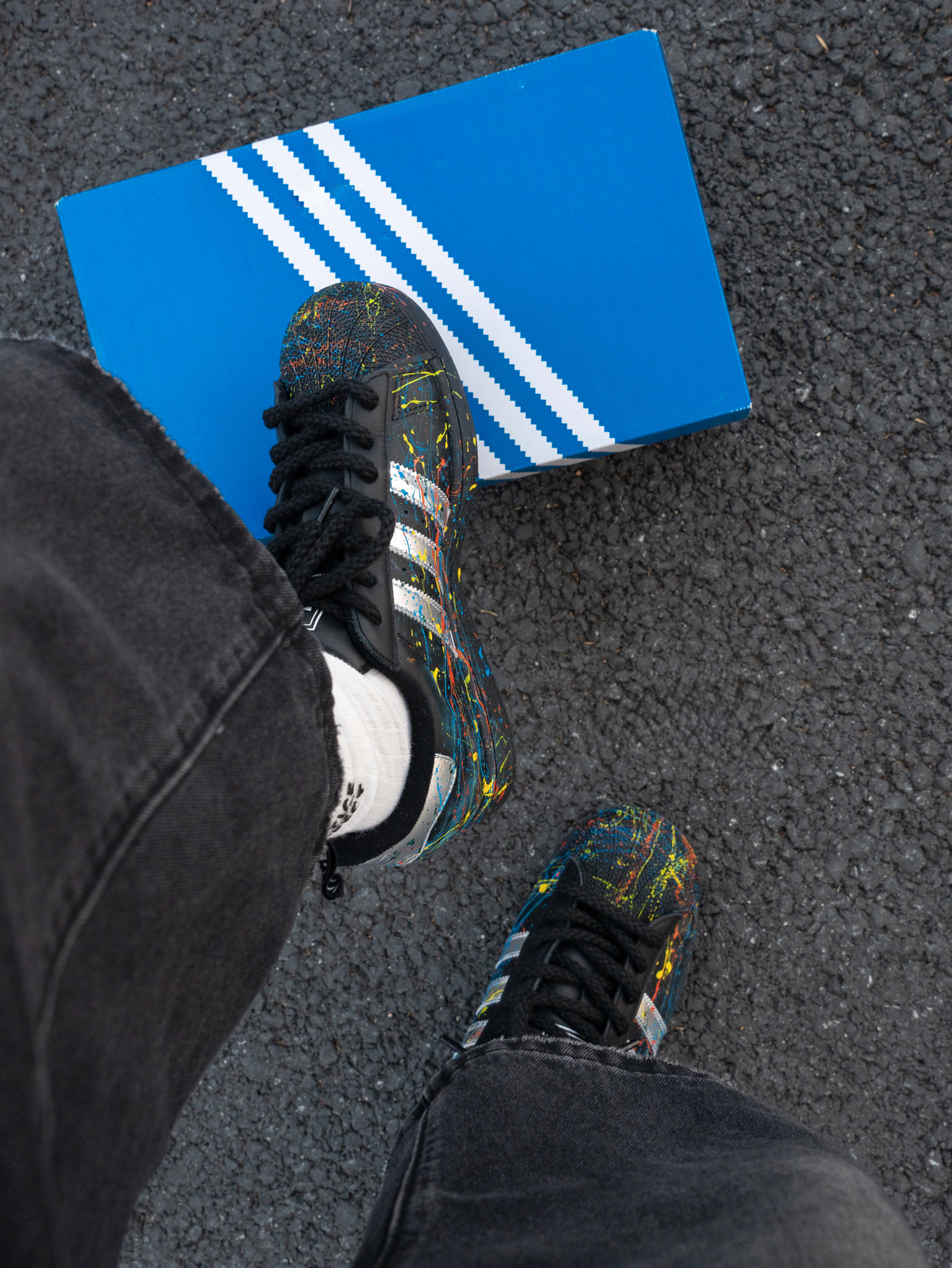 ~ 给大家分享一双 #adidas originals 的贝壳头板鞋定制款 这在原来就经典的板鞋上面做了泼墨的元素 每双定制都有自己独特的味道了 跟从画室出来不一样的是 乱中有序的颜色组合 有点街头艺术品的感觉了😎 熟悉我的朋友都知道 徐哥是真的很喜欢这种定制的鞋款👏🏻 今天挑的也是上半身基础下半身就不基础的款 搭配起来就很合适‼️ 尺码小建议: 徐哥平常穿的40这双40的刚好合适💡 #竟然被...