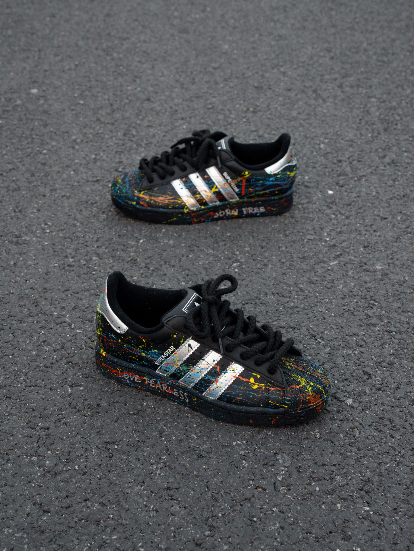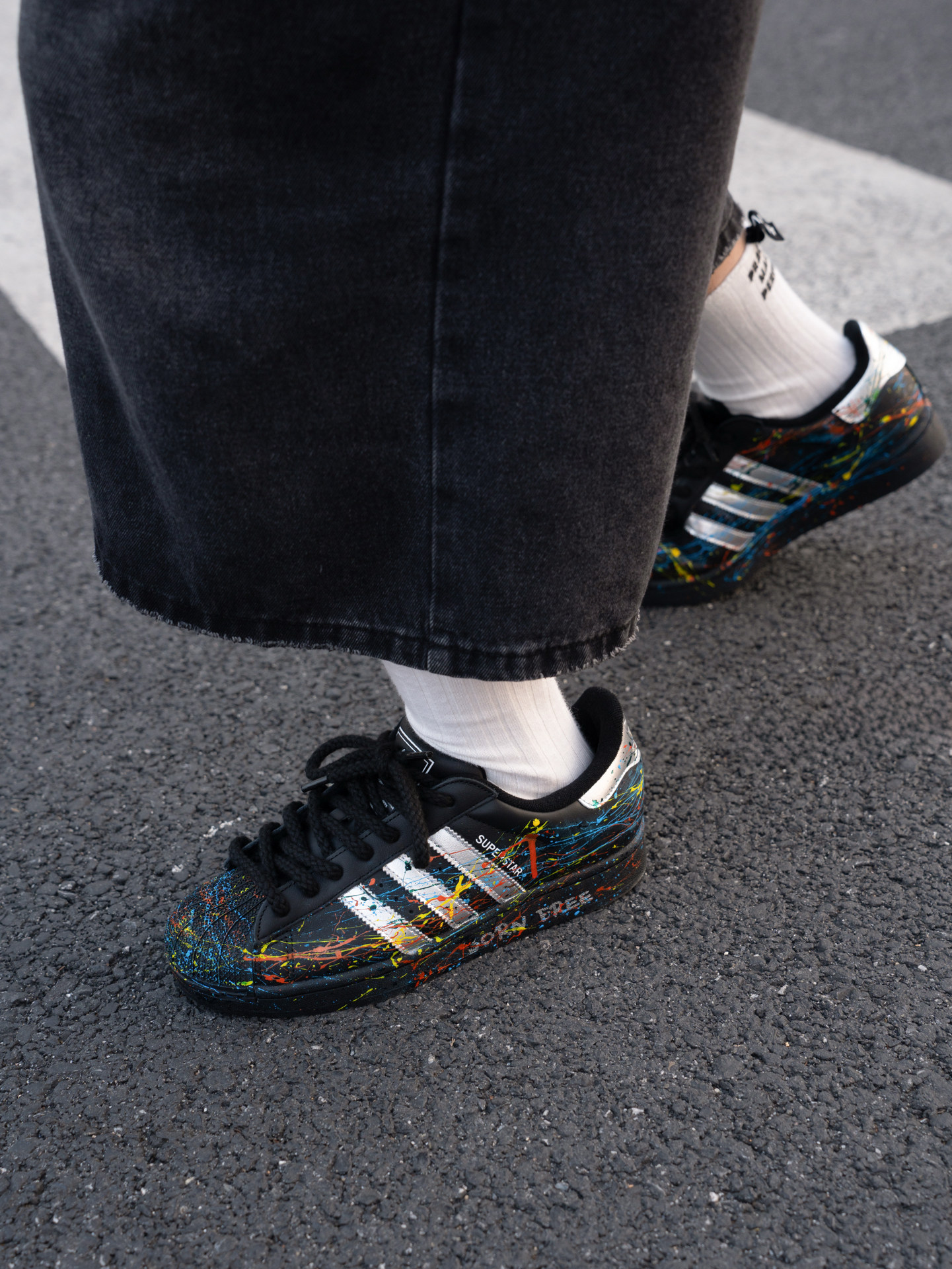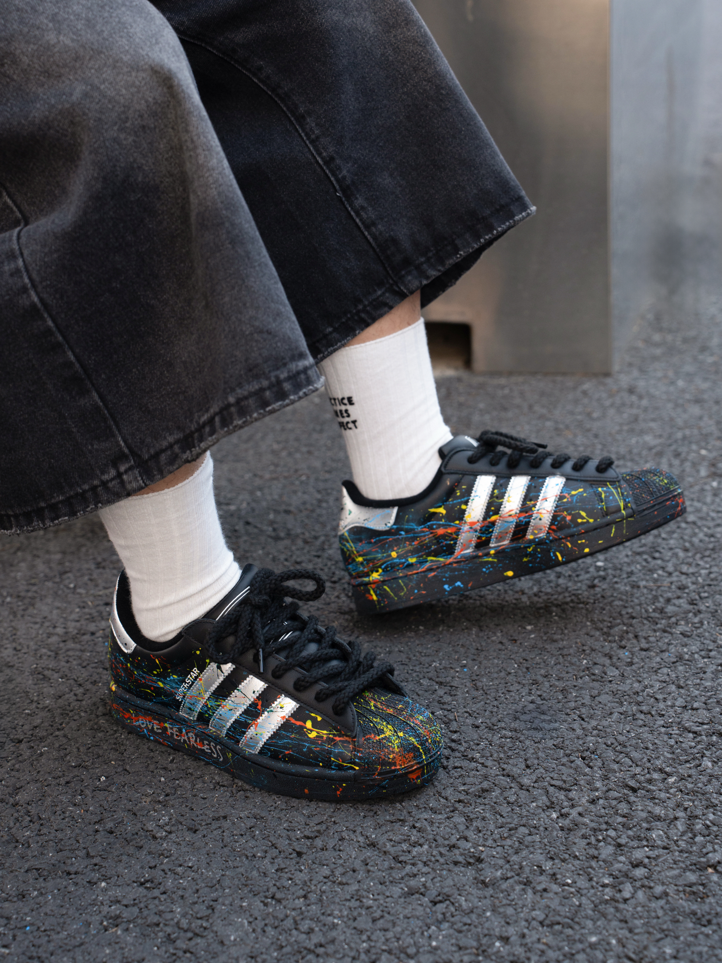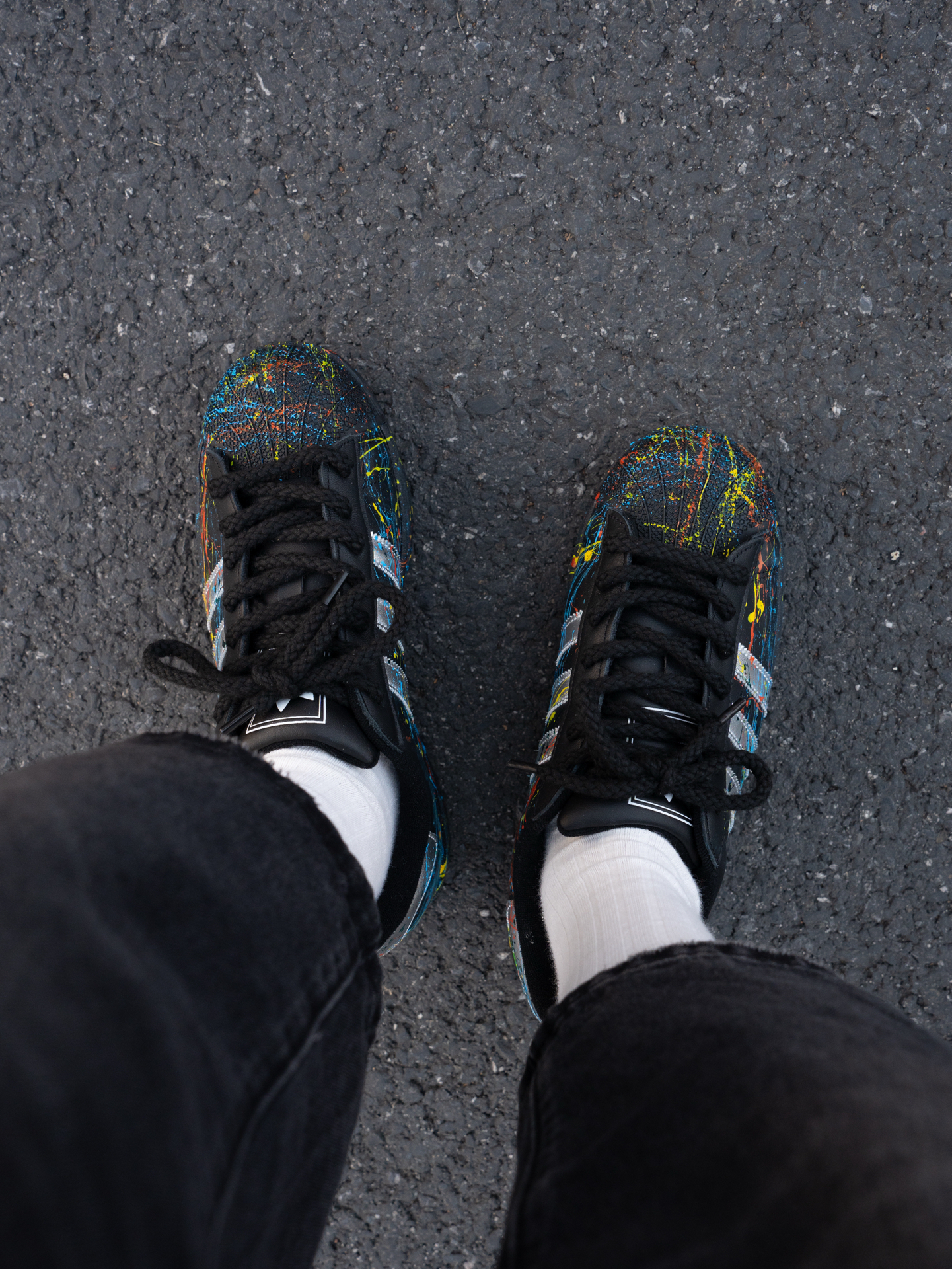 ~ 给大家分享一双 #adidas originals 的贝壳头板鞋定制款 这在原来就经典的板鞋上面做了泼墨的元素 每双定制都有自己独特的味道了 跟从画室出来不一样的是 乱中有序的颜色组合 有点街头艺术品的感觉了😎 熟悉我的朋友都知道 徐哥是真的很喜欢这种定制的鞋款👏🏻 今天挑的也是上半身基础下半身就不基础的款 搭配起来就很合适‼️ 尺码小建议: 徐哥平常穿的40这双40的刚好合适💡 #竟然被...