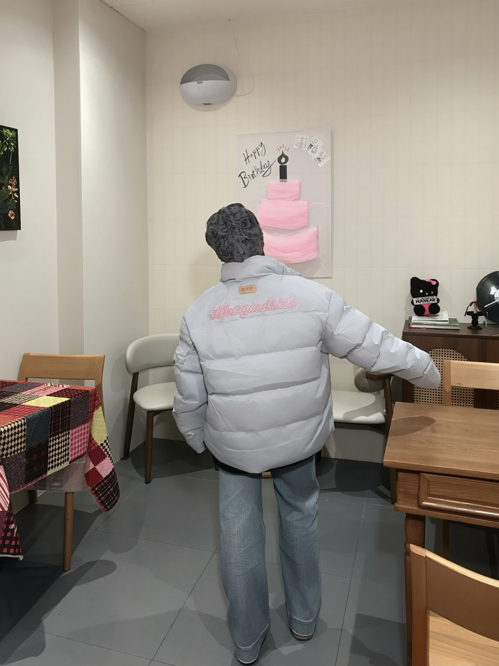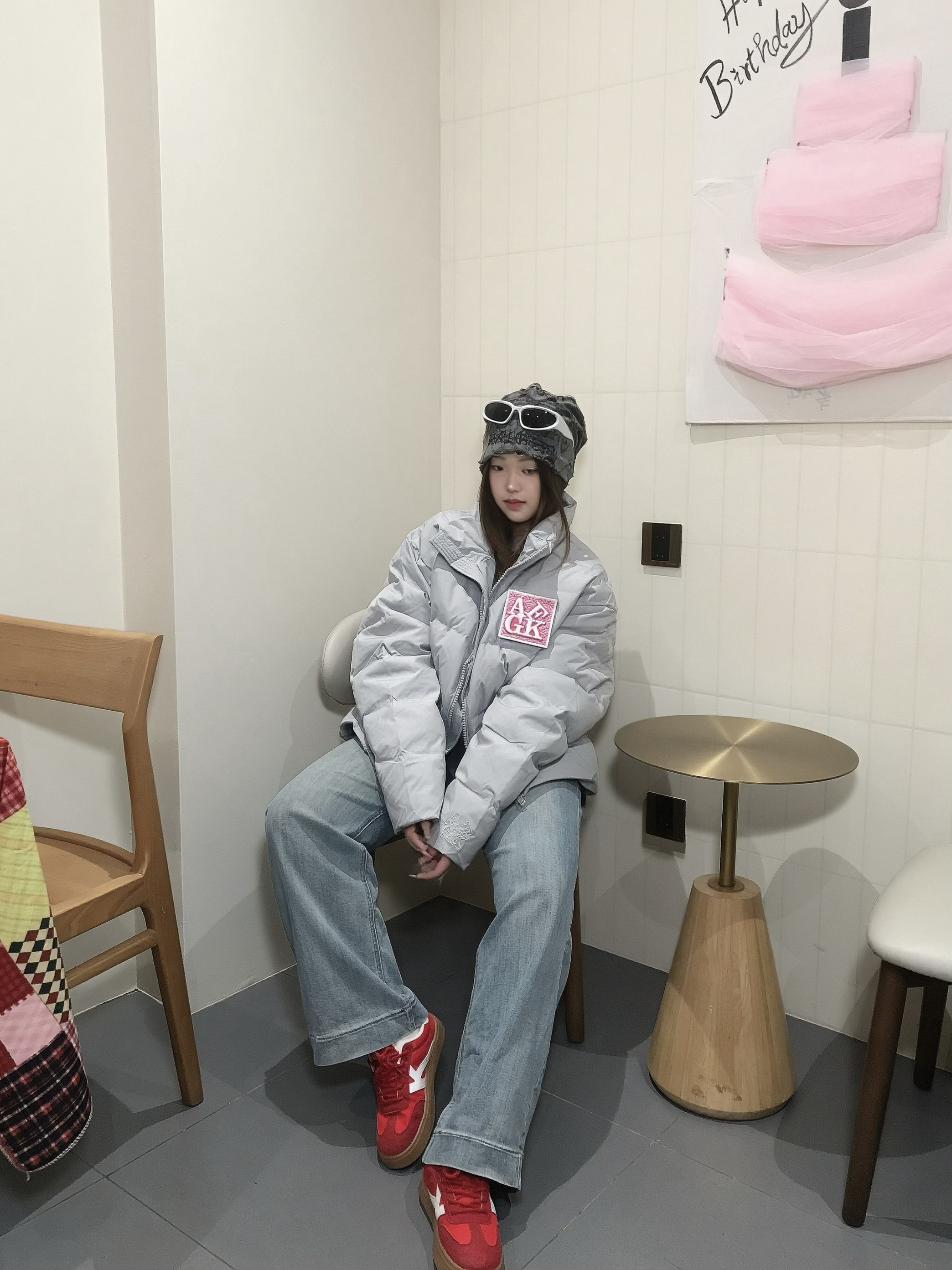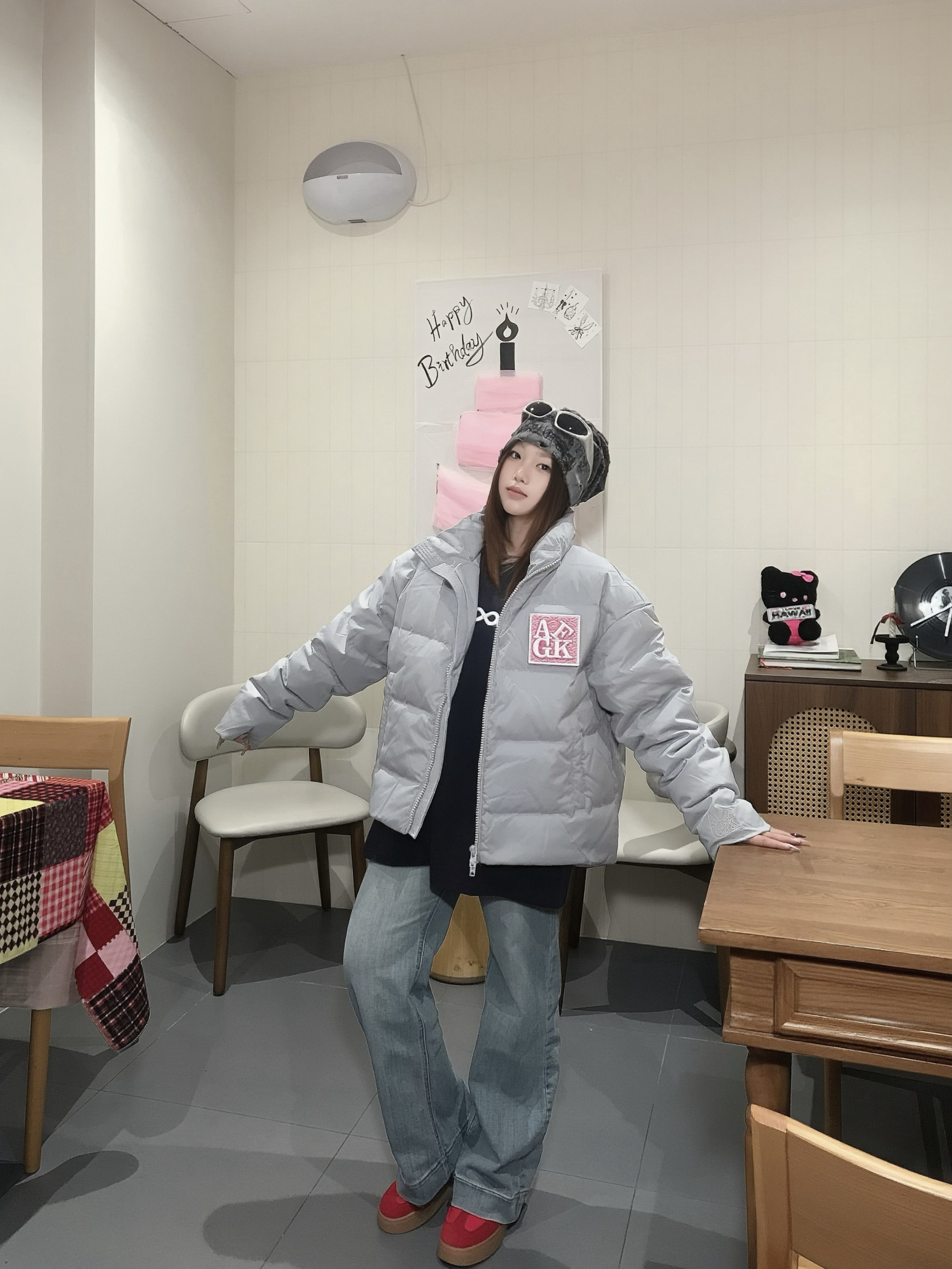 这件浅灰羽绒服的甜酷感太帅了 面料是滑溜溜的防风材质 填充蓬松却不臃肿 后背粉色刺绣像小涂鸦一样亮眼 胸前的刺绣方块可以换 一穿就有街头甜酷少女的范儿~