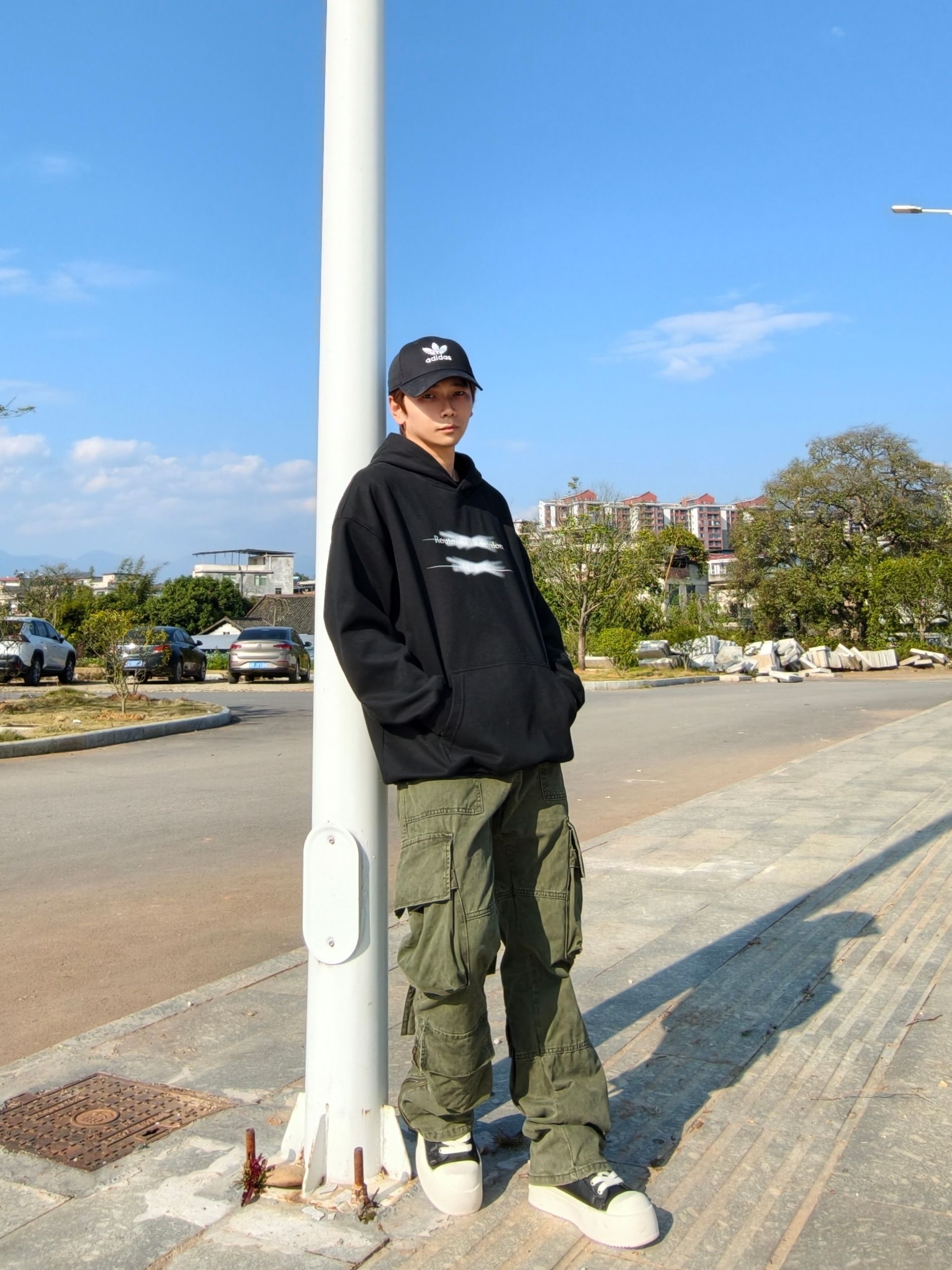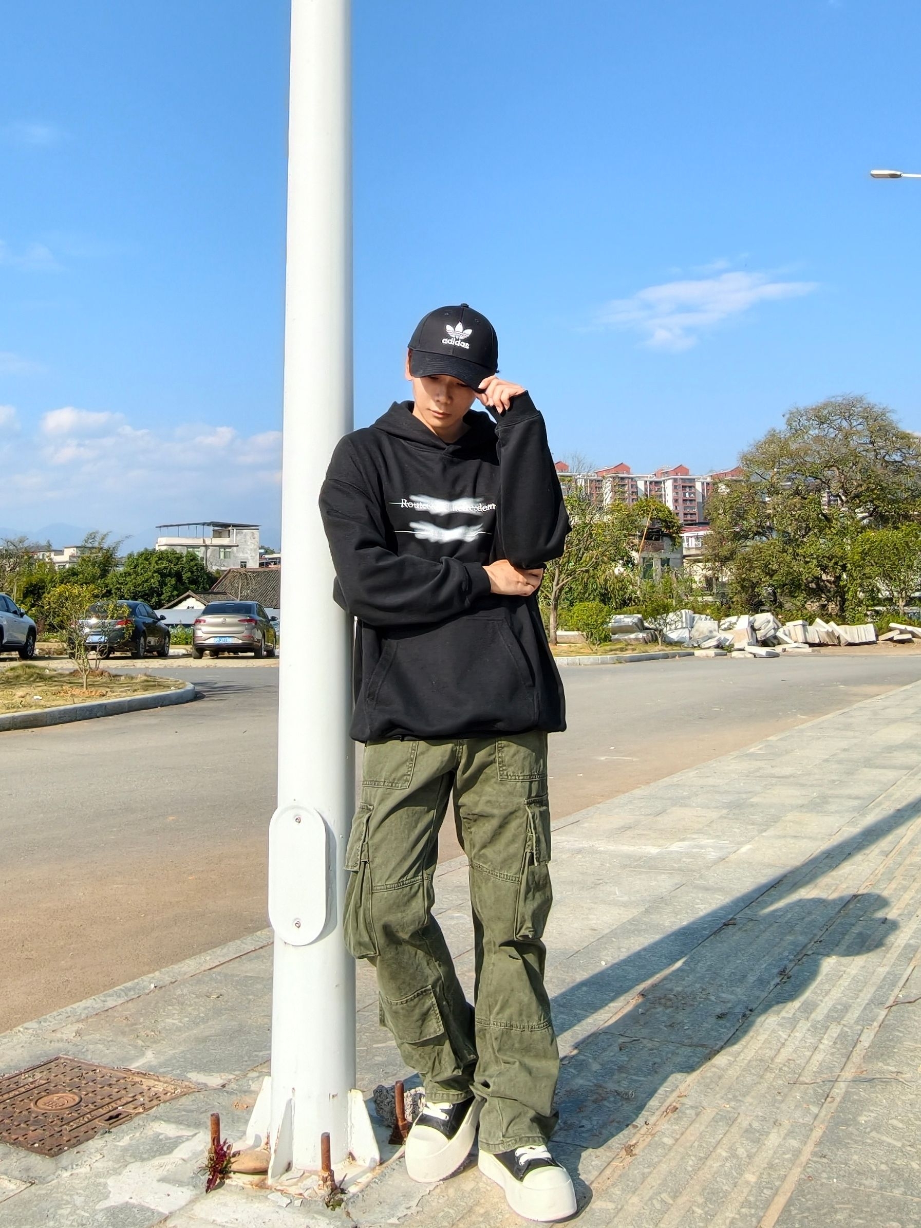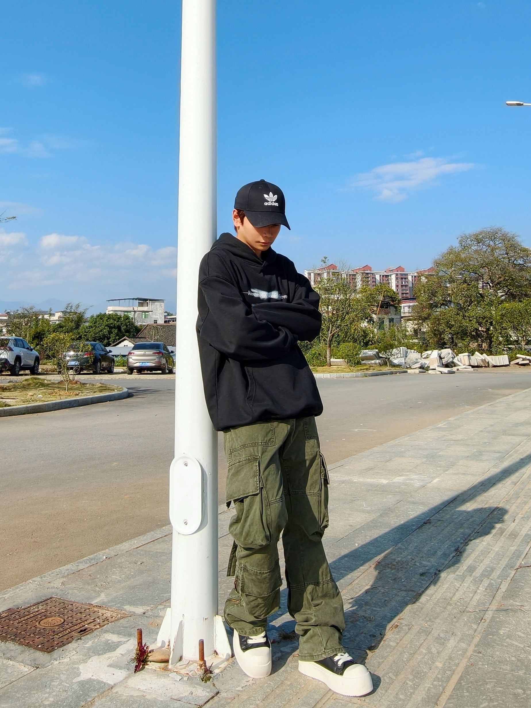 天热的白天一件卫衣就足以 下身配条撞色的工装裤 再穿双黑白板鞋就可以轻松出门