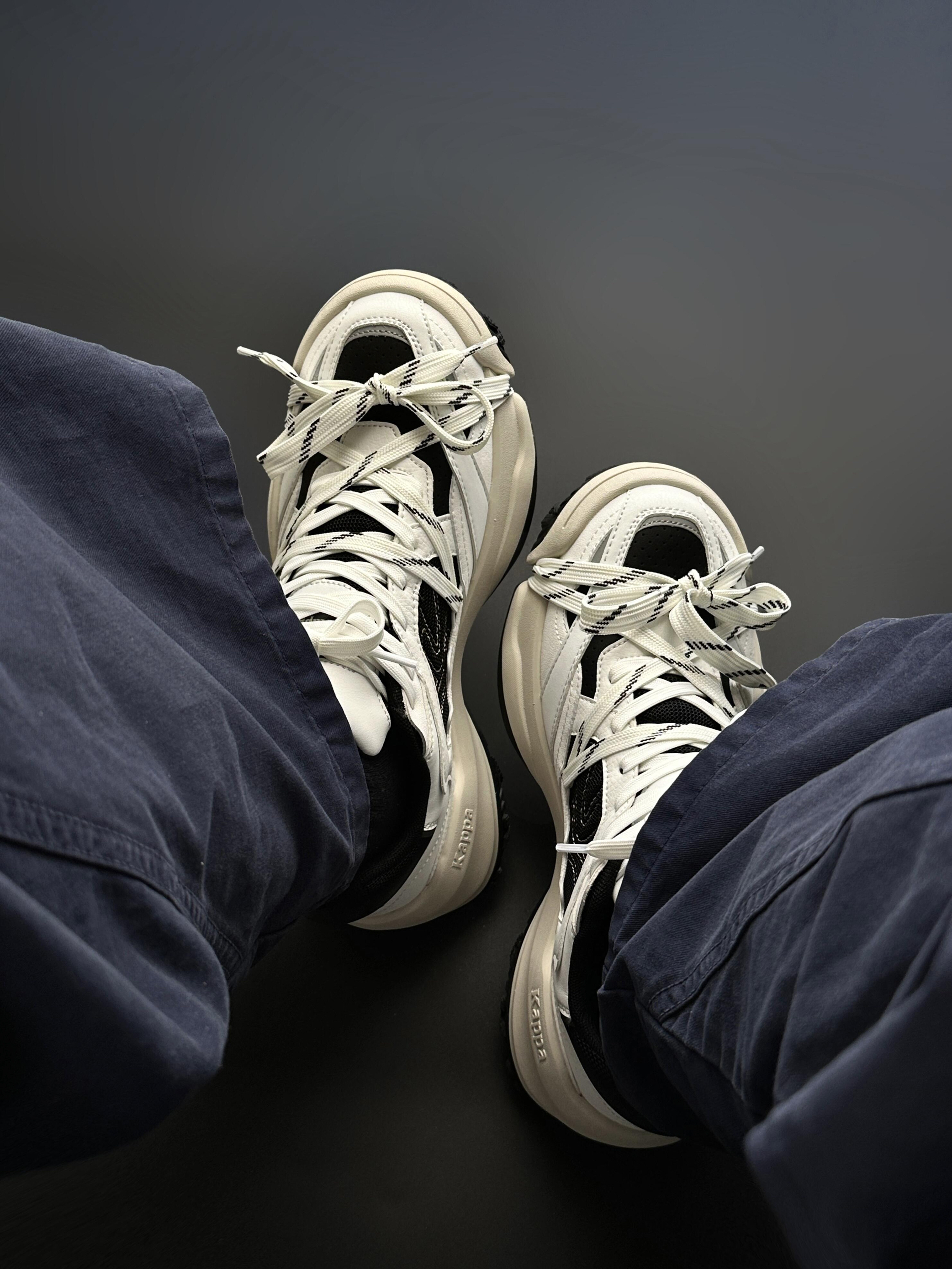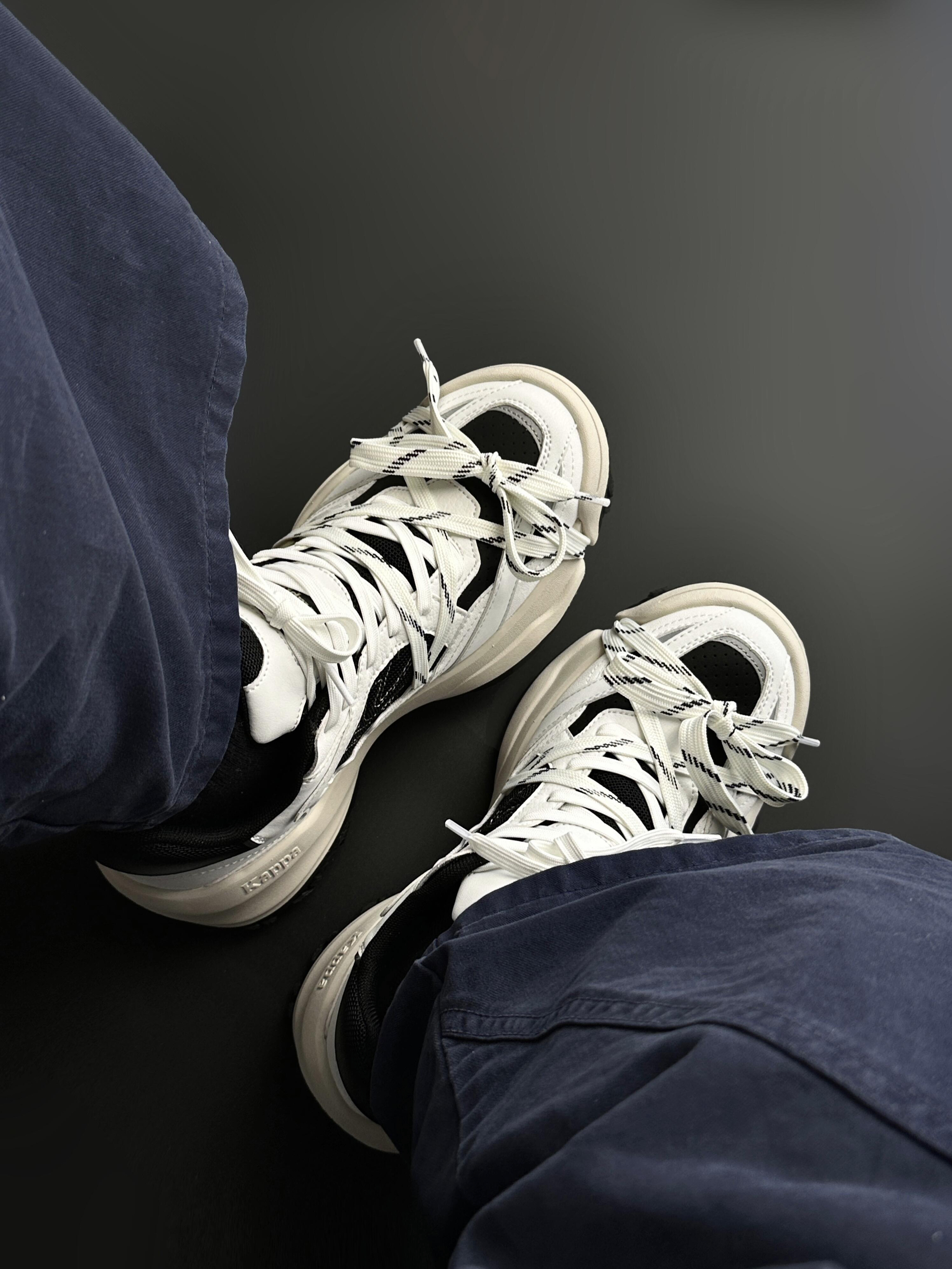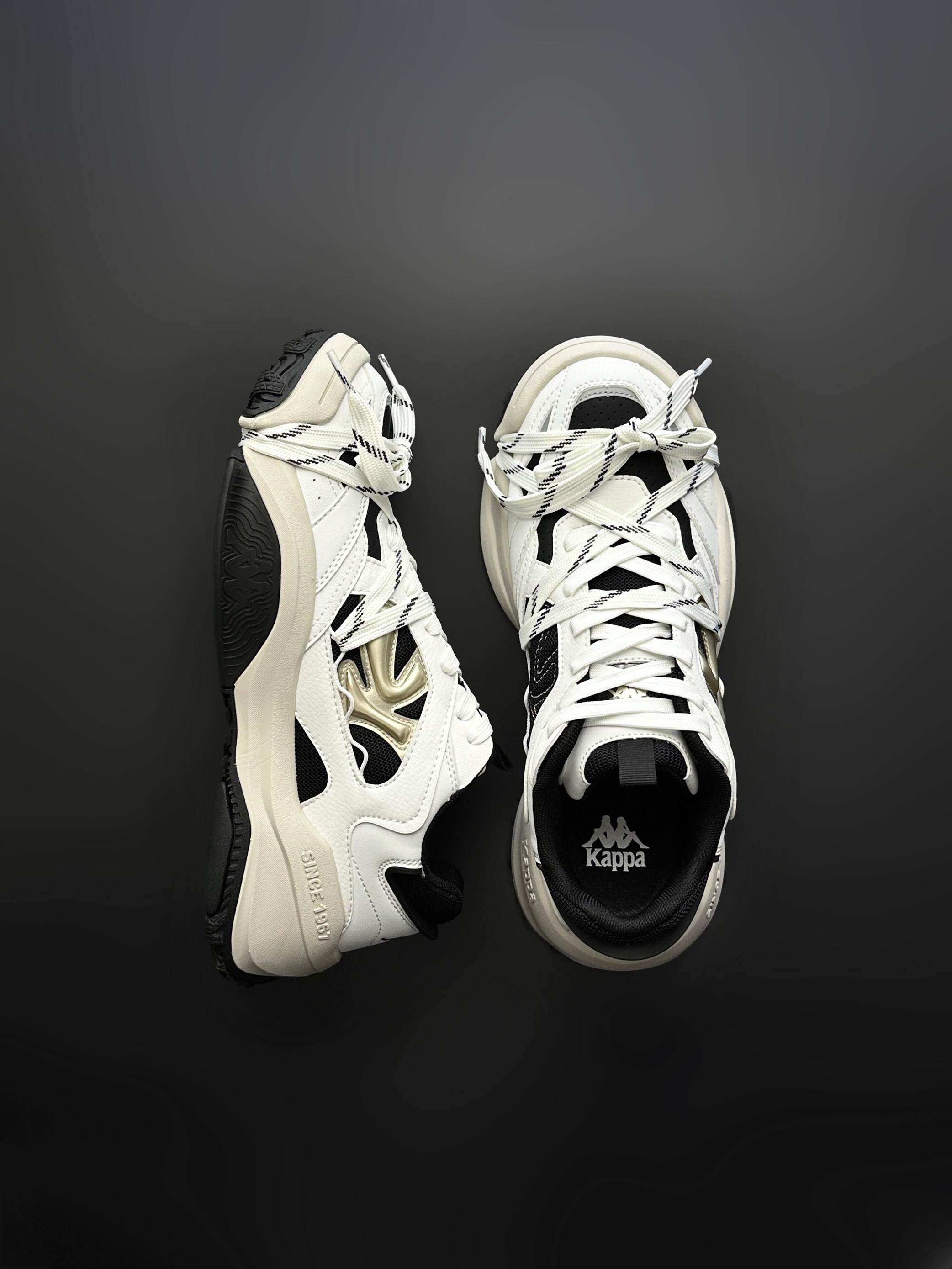 刚拆箱的Kappa方糖板鞋,第一眼就被鞋头的绑带设计拿捏了! 很有辨识度,给白黑拼色的鞋身添了不少层次感,再搭配鞋身的金色K字点缀,瞬间跳出普通板鞋的沉闷感。 鞋型是方方正正的厚底款,皮质摸起来软乎乎的,厚底踩上去很轻,一点不笨重。 侧面还有“SINCE 1967”的刻字,细节做的很到位,日常搭牛仔裤、运动裤都超适配。