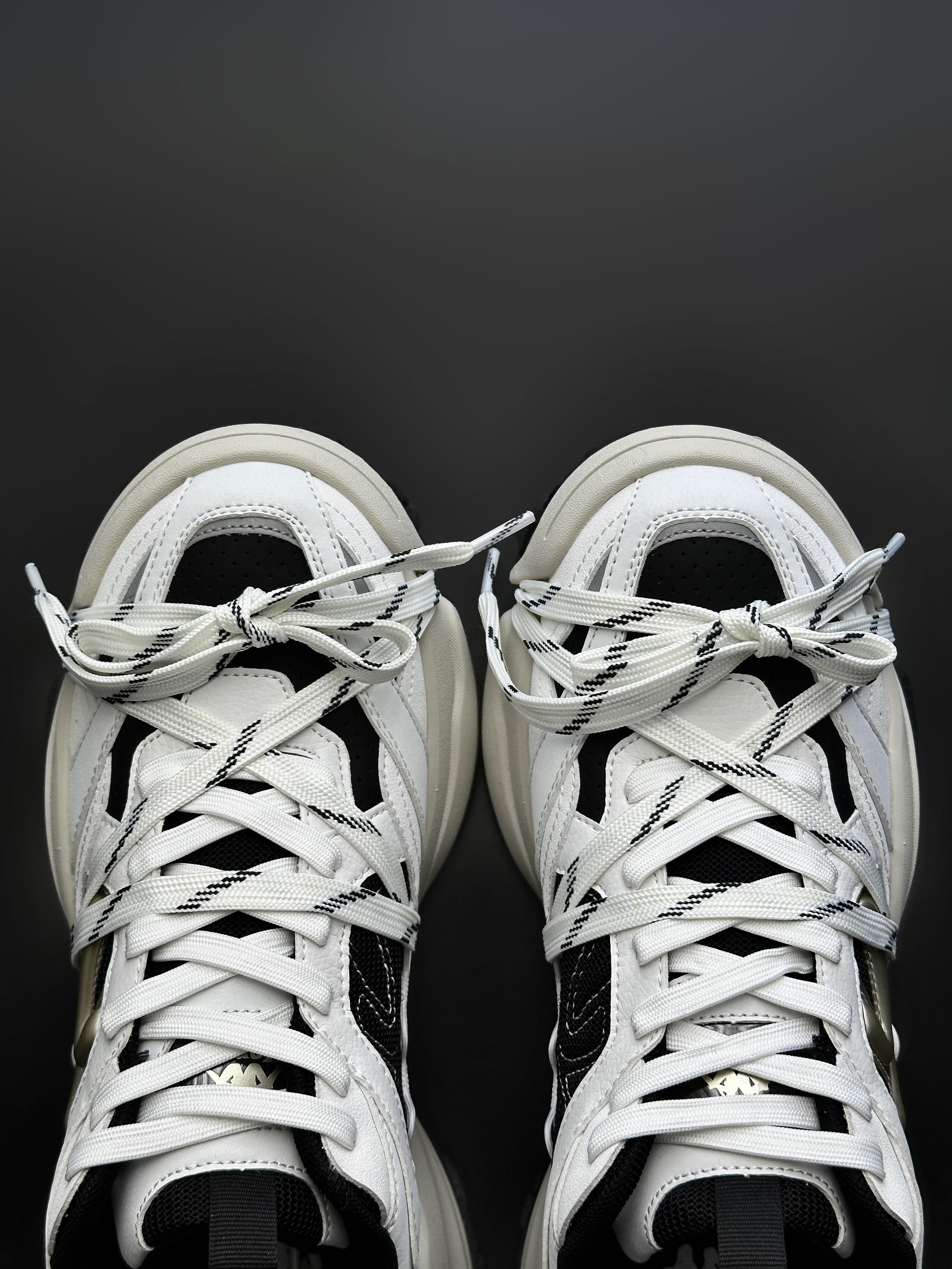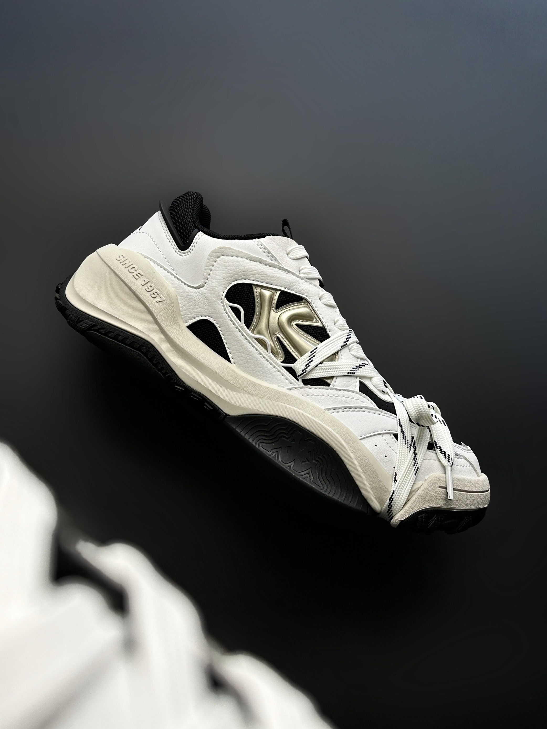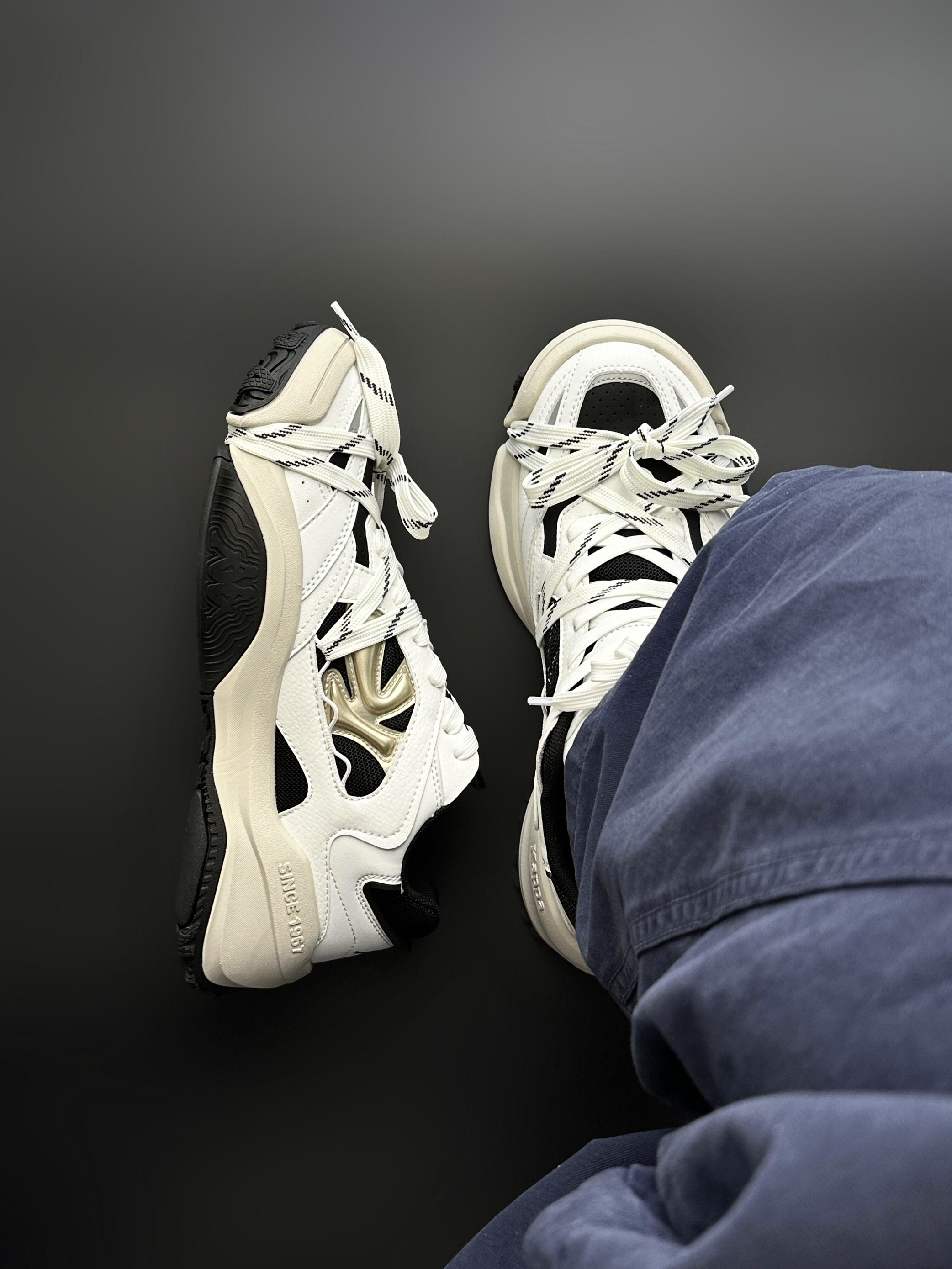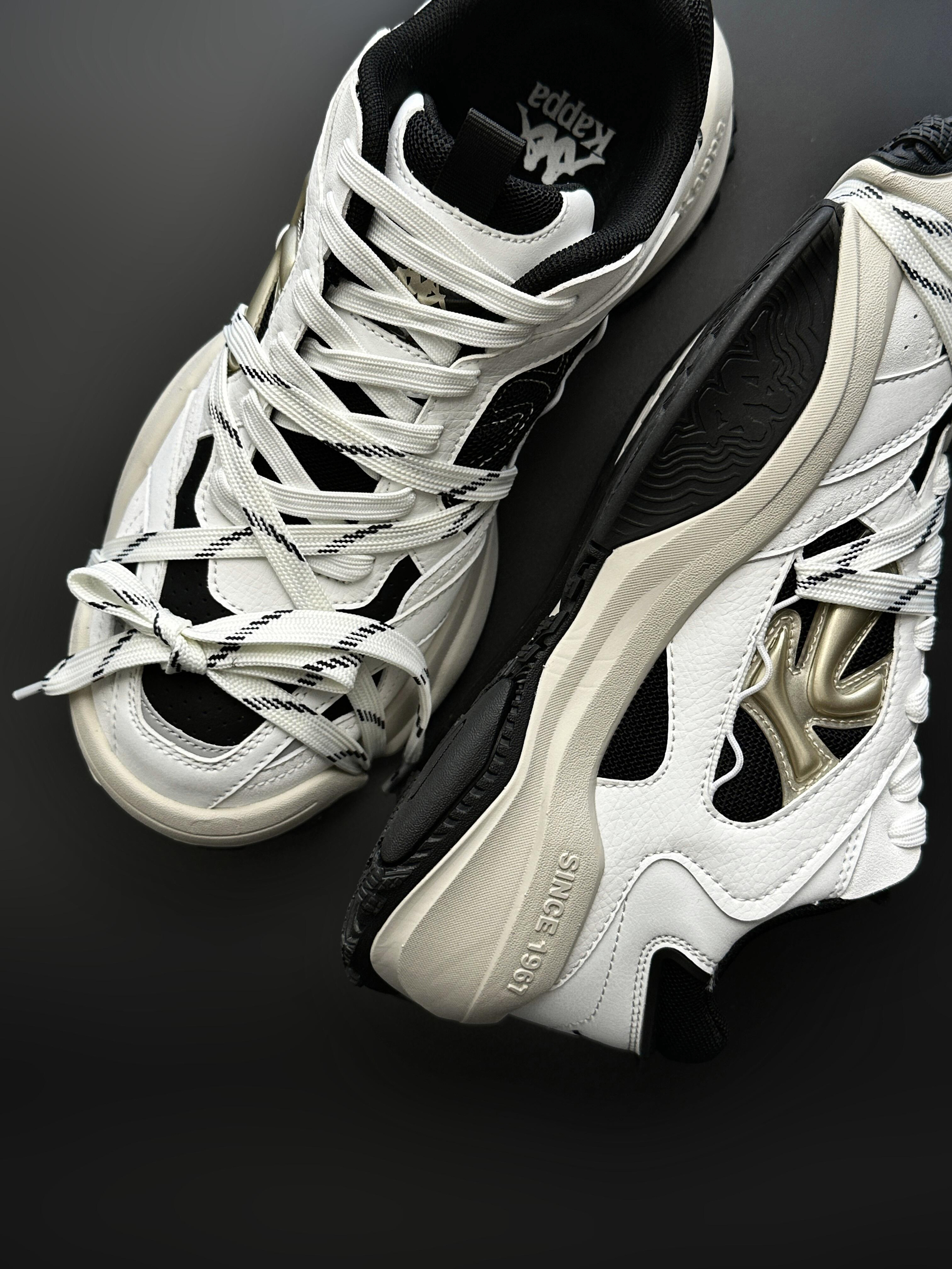 刚拆箱的Kappa方糖板鞋,第一眼就被鞋头的绑带设计拿捏了! 很有辨识度,给白黑拼色的鞋身添了不少层次感,再搭配鞋身的金色K字点缀,瞬间跳出普通板鞋的沉闷感。 鞋型是方方正正的厚底款,皮质摸起来软乎乎的,厚底踩上去很轻,一点不笨重。 侧面还有“SINCE 1967”的刻字,细节做的很到位,日常搭牛仔裤、运动裤都超适配。