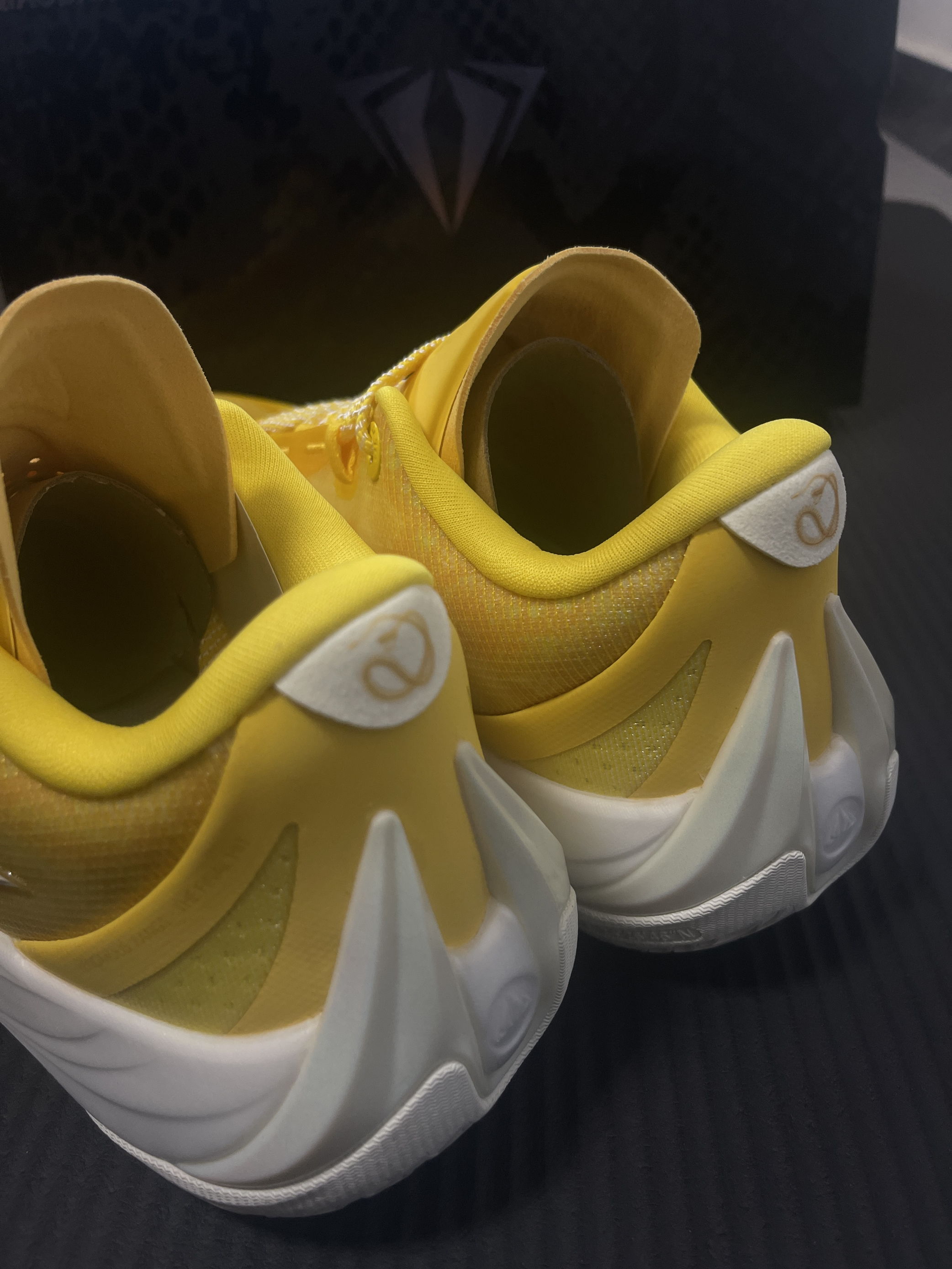 鞋面灵感来自蛇皮纹理,搭配亮黄色配色,视觉冲击力满分。鞋舌薄且有凹凸纹理,内里麂皮材质,穿着舒适不勒脚:鞋楦正常偏宽,适合正常偏宽脚型的球员,扁平足穿着也无明显不适!中底软弹,实战反馈好,单只约370g,日常穿搭或打球都很合适。鞋盒正面蛇鳞图案,细节满满,尺码偏大,建议选小半码哦! 保养:室外仅在平整塑胶场短时间使用,每次实战后用湿布擦拭外底纹路,避免沙粒嵌入加速磨损。