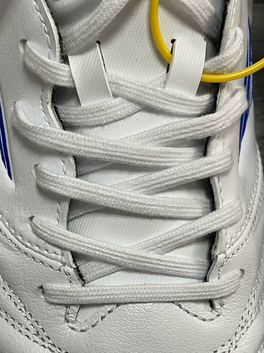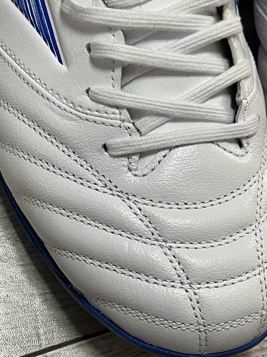 Mizuno Morelia Neo IV Pro AS 颜值:配色满分,白蓝粉搭配到位,但白色鞋面易脏,需在使用后及时清洗。 用料:袋鼠皮加人造皮革,但袋鼠皮并不是柔化的顶级,相比之下会硬些。中底EVA缓震层效果不错。 特点:鞋舌采用双防偏孔,后跟内衬麂皮防滑且贴合。 使用:球鞋总体还是非常轻盈,鞋楦适合宽脚即插即用。