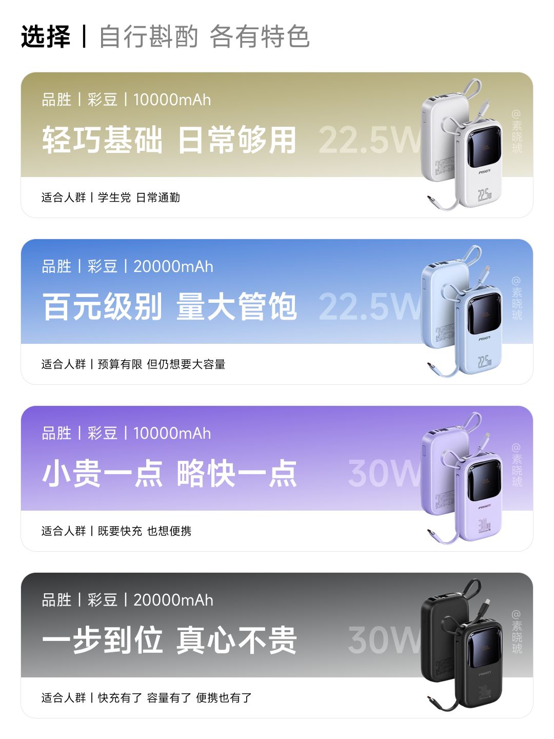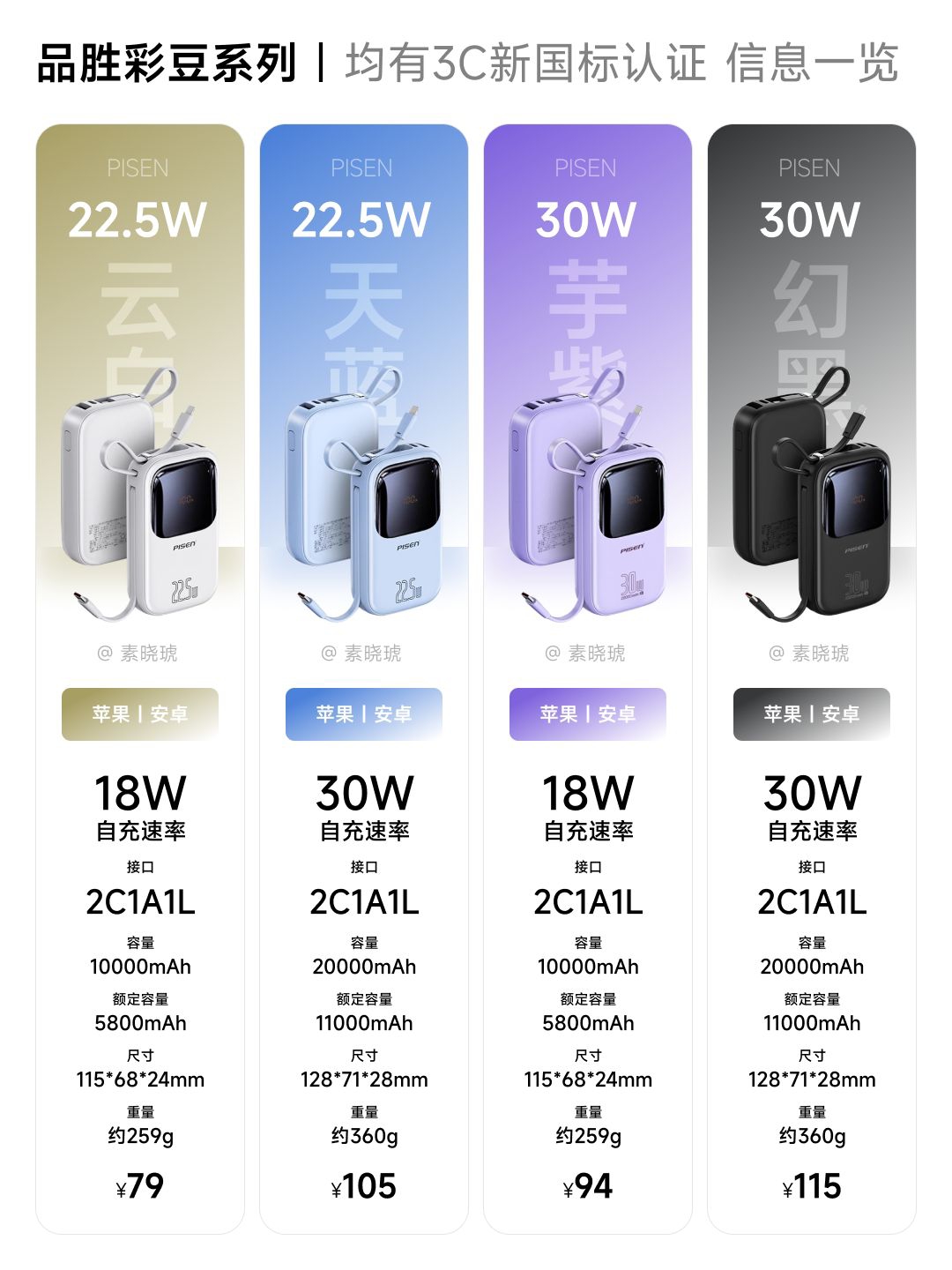 老话说的好,你大哥还是你大哥。 彩豆系列作为品胜的王牌充电宝,常年稳居其销量之首。它究竟有什么魔力,能得此殊荣? 其实很简单: 该系列的接口均为2C1A1L,轻松满足苹果、安卓的全部需求。而且都是自带双线,无需额外准备数据线,同时还是手拧绳。 容量则只有10000mAh、20000mAh两档; 输出功率也就22.5W、30W两档。 即可以满足追求轻巧便携,也可以满足量大管饱。 均有LED简...