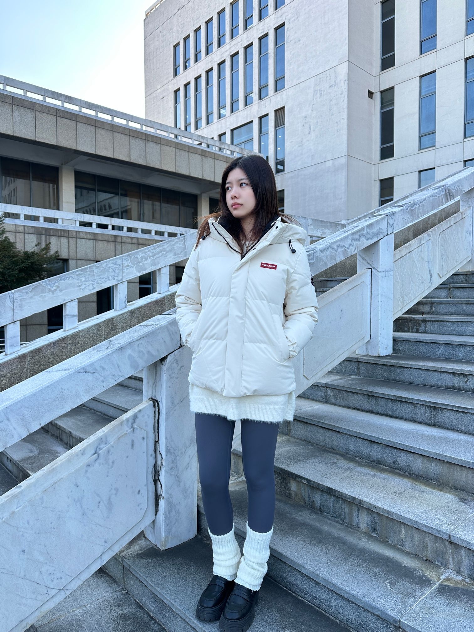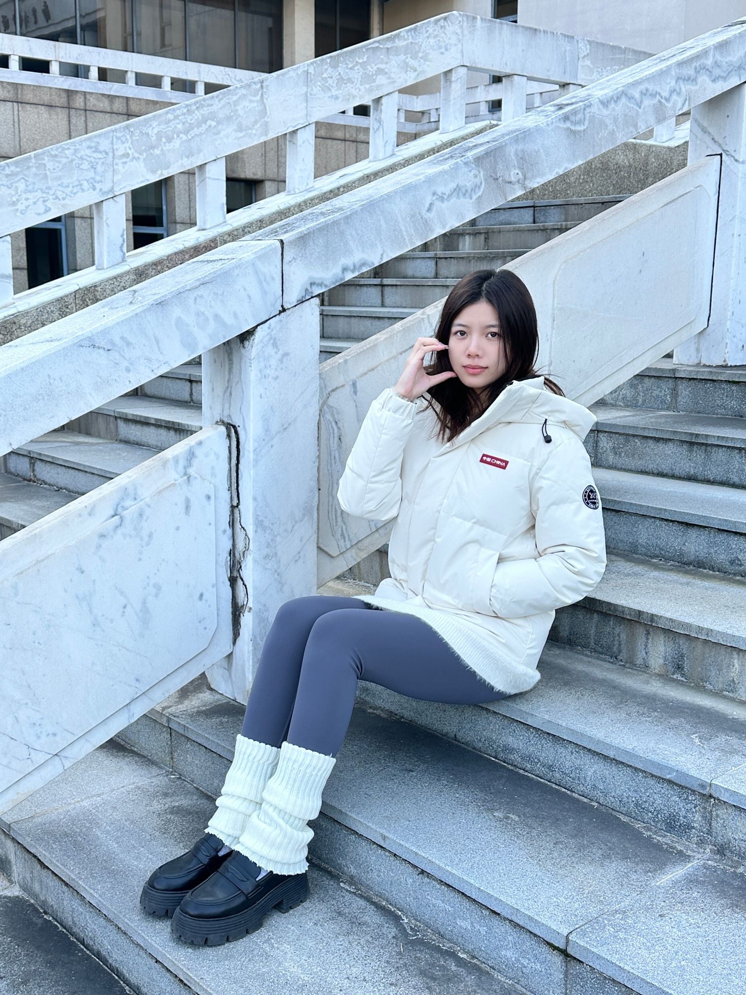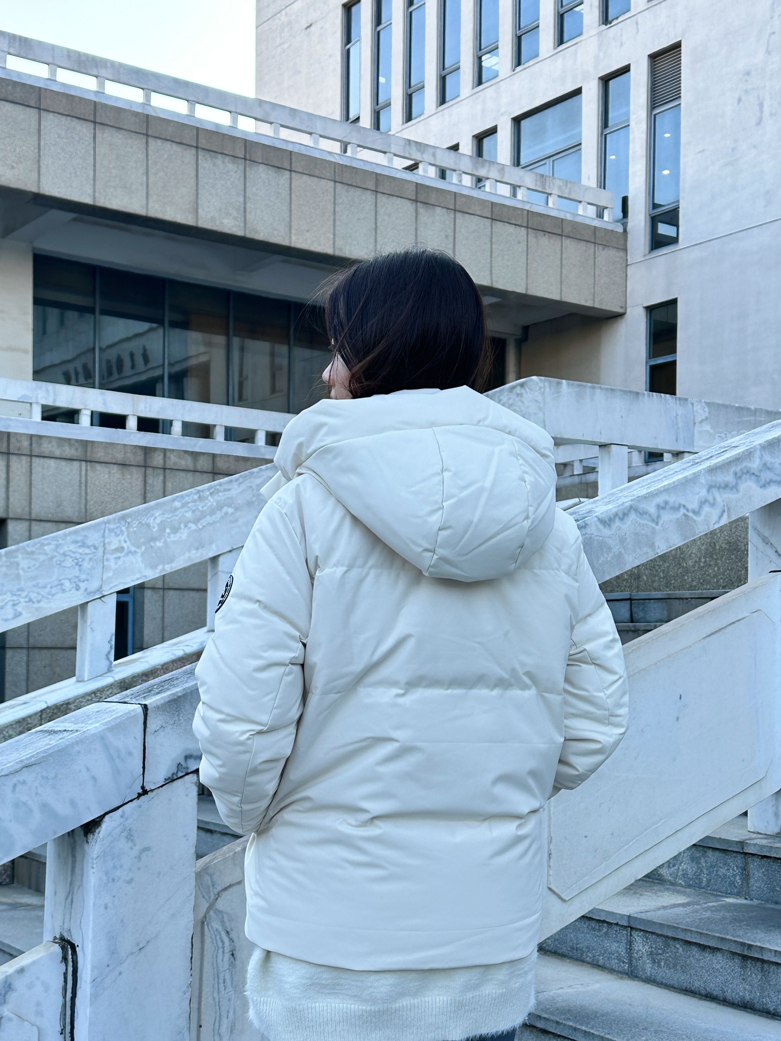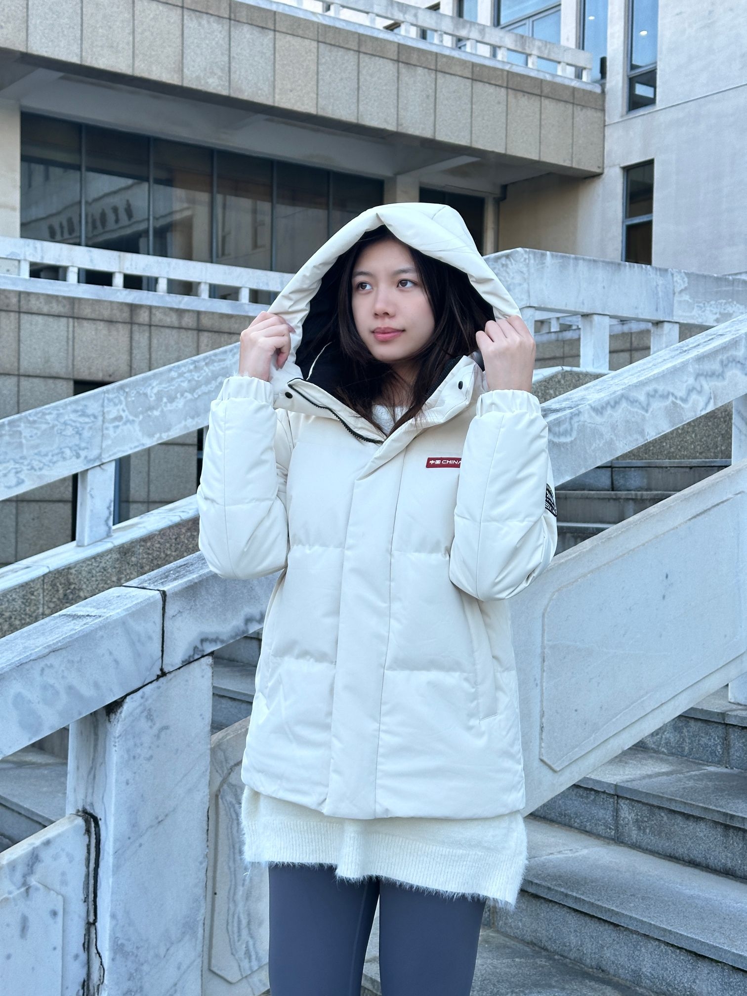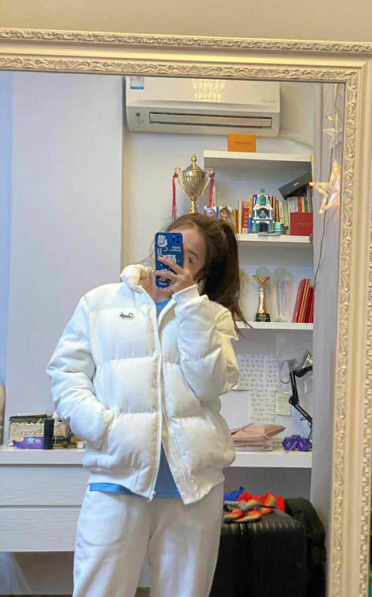 170/115 今日明星同款穿搭~ 🧥这件鸭鸭的米白羽绒服是孙颖莎同款~ 上身是舒服的宽松休闲感,我买的是M码,上身不会裹得像粽子~面料蓬松但不压肩,连帽内里的撞色设计还挺细节,今天出门取快递穿它,小风一吹也暖乎乎的。 搭毛绒内搭+leggings是随性休闲风,通勤或下楼散步都能穿,属于冬天随手抓来穿也好看的实用款~