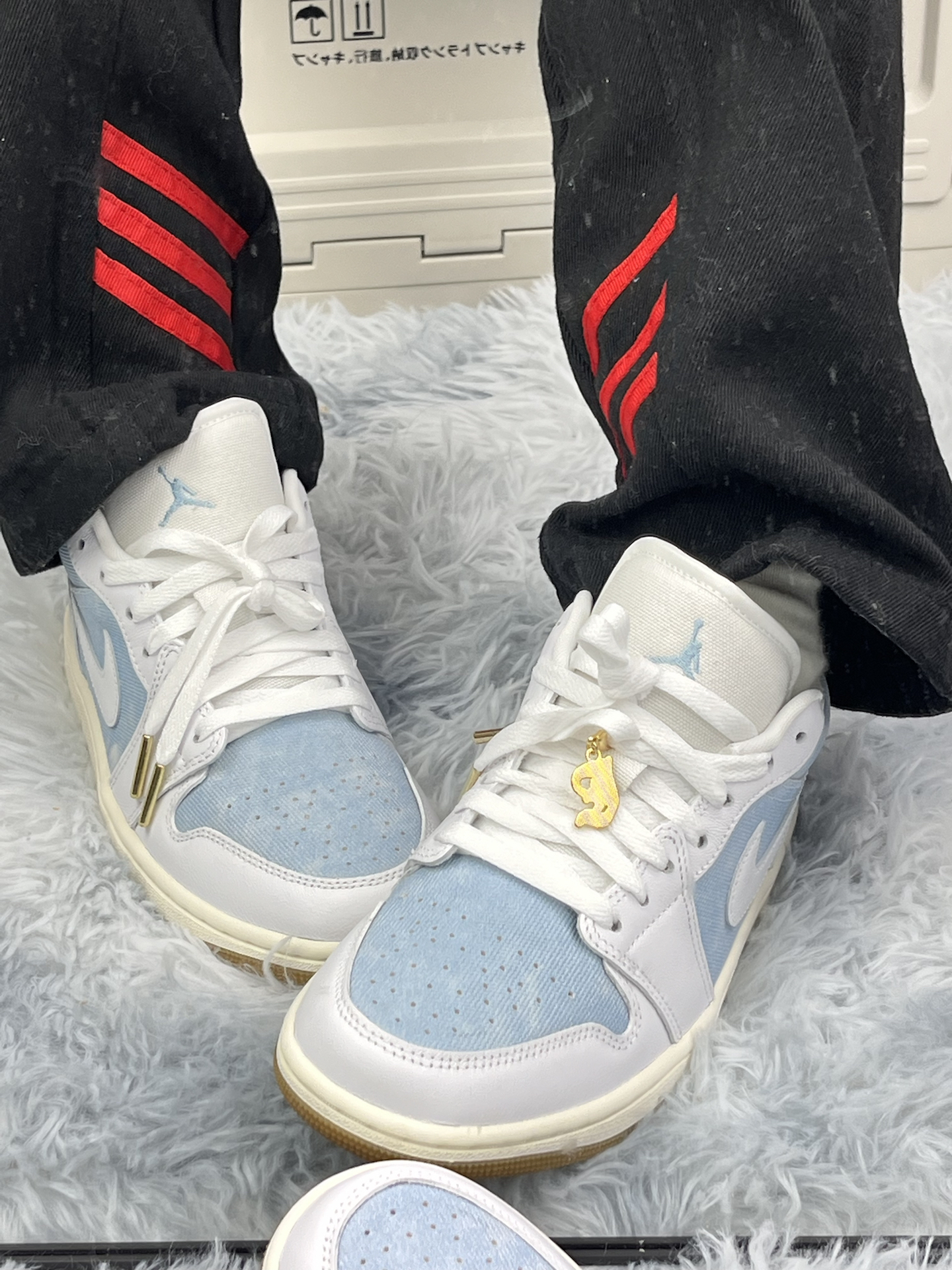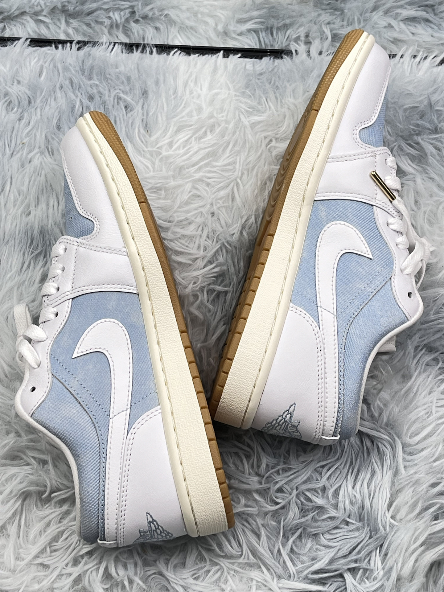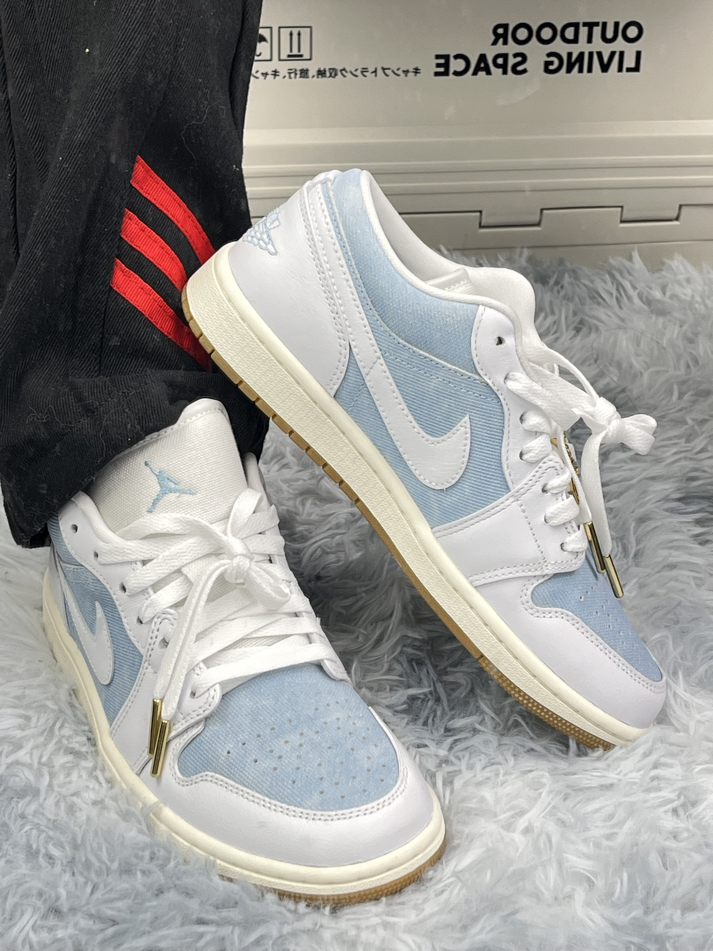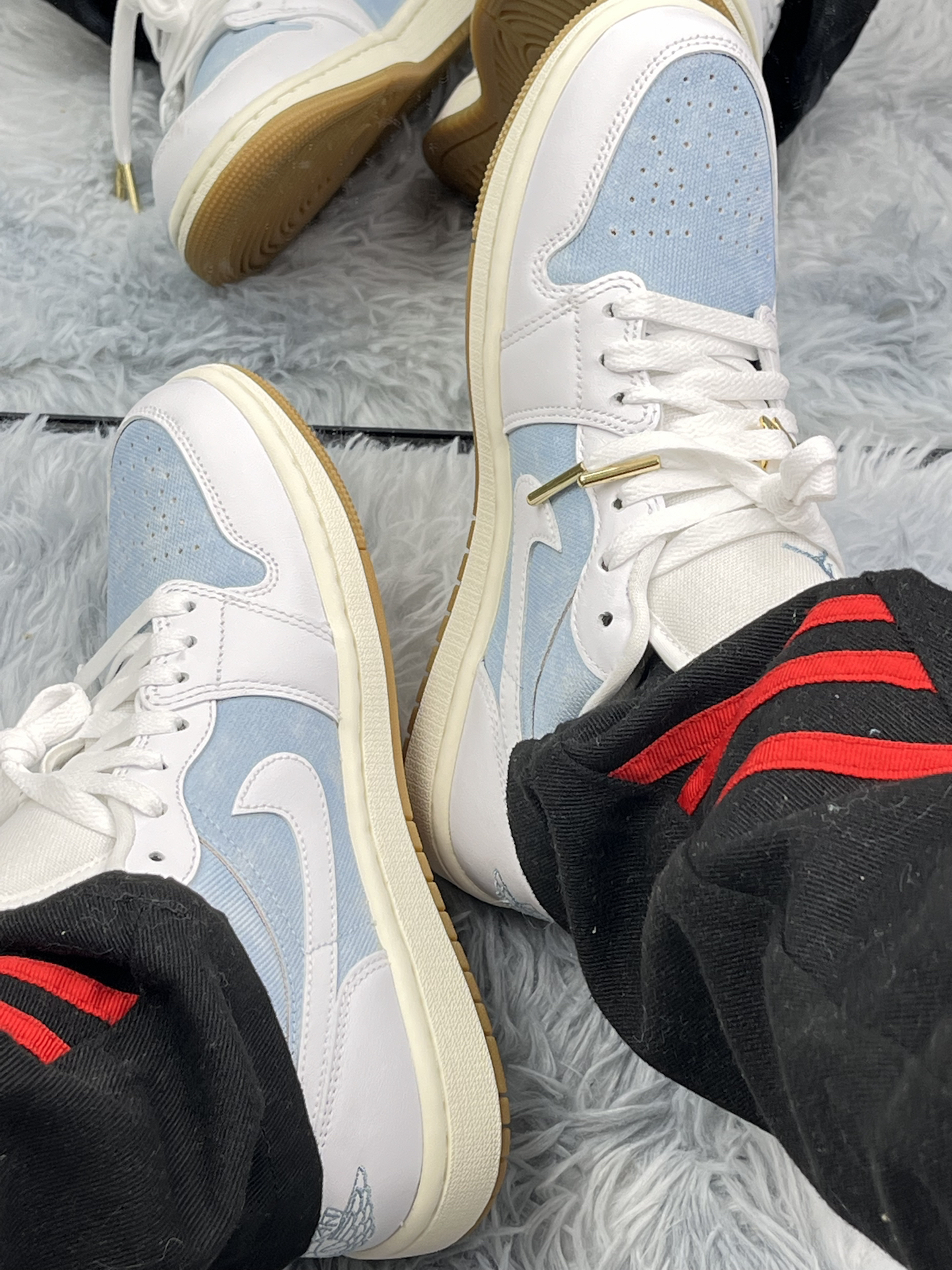 学生党打工人通勤鞋实测|这双浅蓝 AJ 没那么神 拿到手第一眼是真的清爽[爱心_blue],牛仔布拼皮质,搭校服裤、通勤西装裤都不违和 上脚踩教室、挤地铁一周,鞋型偏窄,刚开始前掌有点闷,穿两天就软和了鞋底耐磨,走石板路不硌脚,赶早八、追公交都够用 缺点也很明显:牛仔布面容易蹭毛边,放课桌下蹭两下就有点痕迹 透气孔看着多 夏天穿还是会捂脚,得配薄袜子🧦金属鞋带扣偶尔勾裤脚,蹲下来捡文件还得理...
