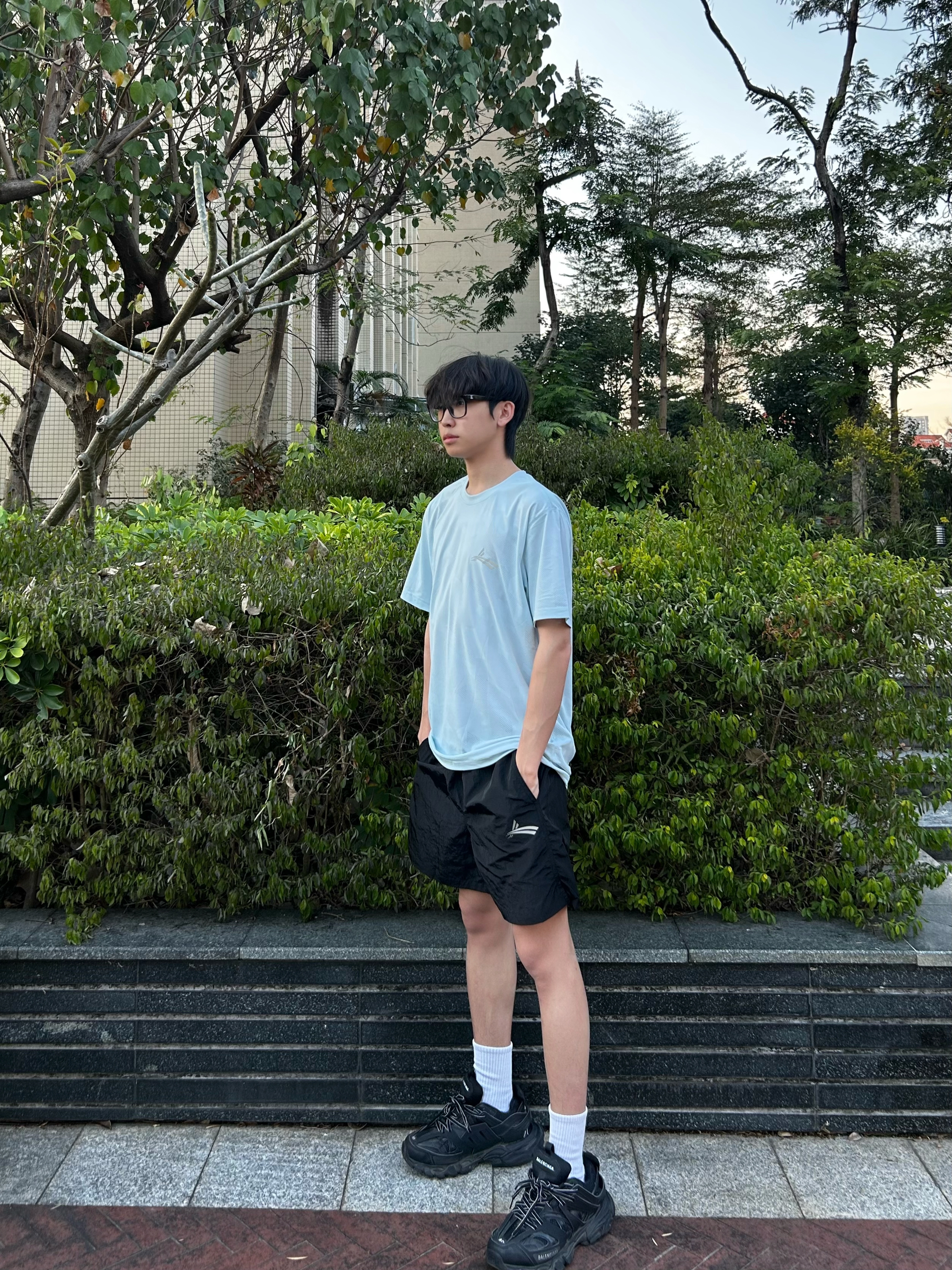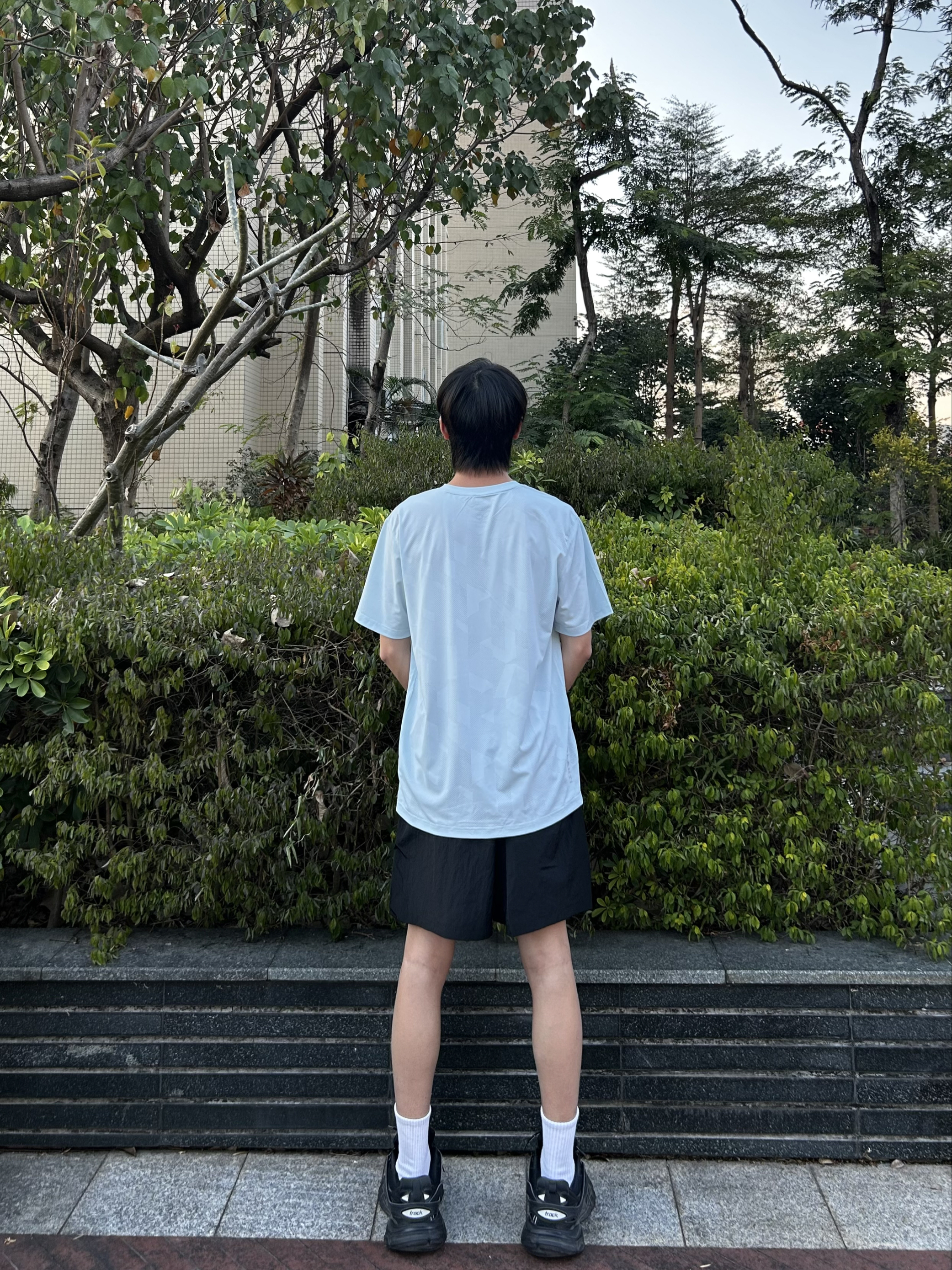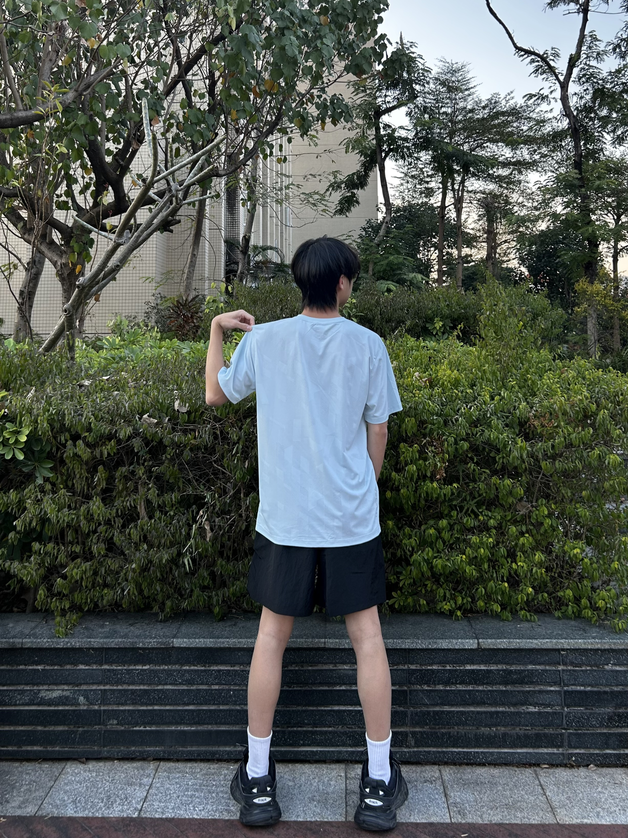今天穿的沃兰迪这套运动穿搭太戳我了!浅蓝速干T恤上身巨透气,出汗也不黏糊,版型宽松但不显垮,搭配黑色运动短裤刚好露出腰线,日常出街或体测都能打。鞋子虽然是板鞋鞋型,但脚感软弹,走一下午都不累脚~整体配色干净清爽,体育生这么穿真的很加分!