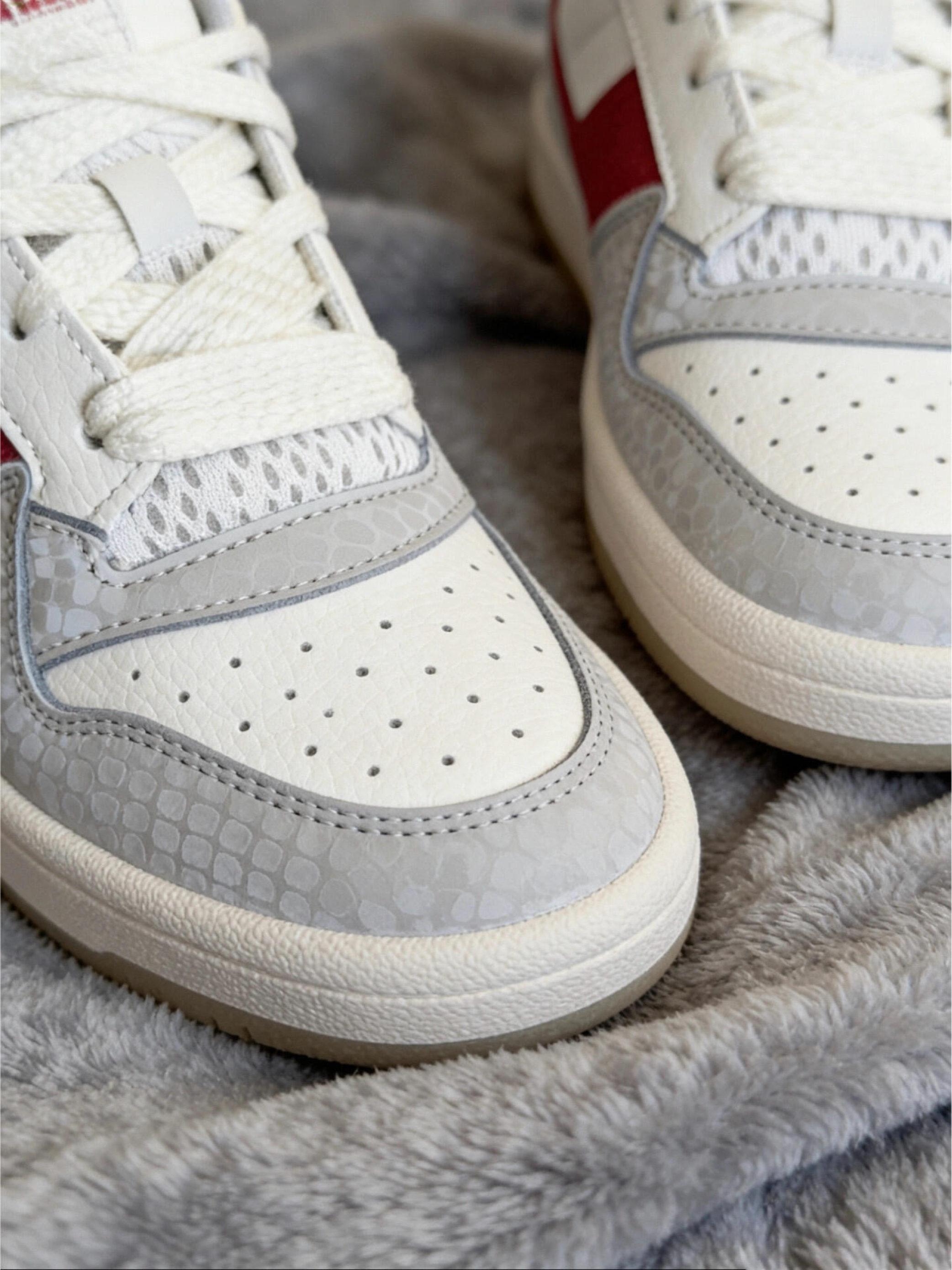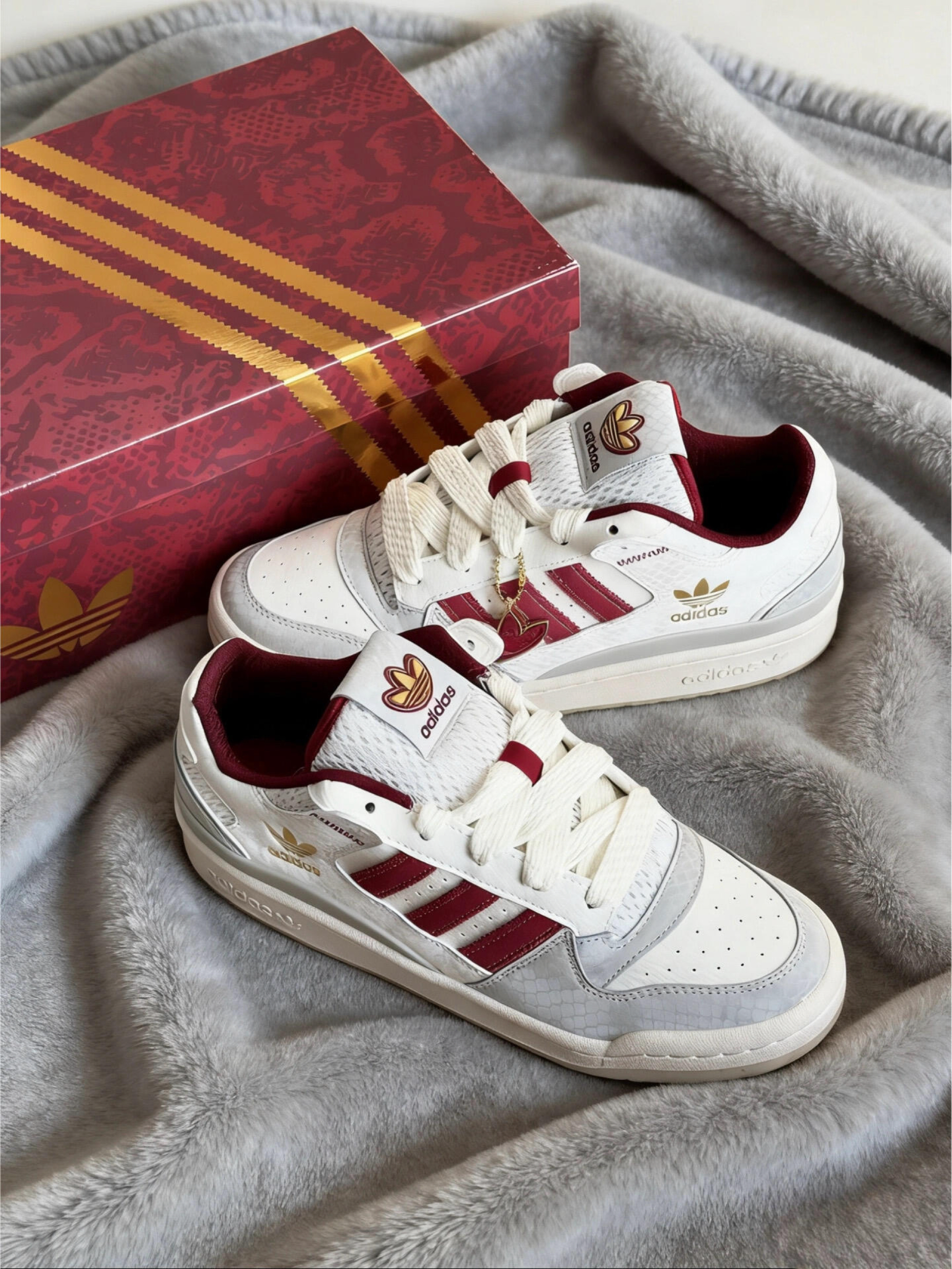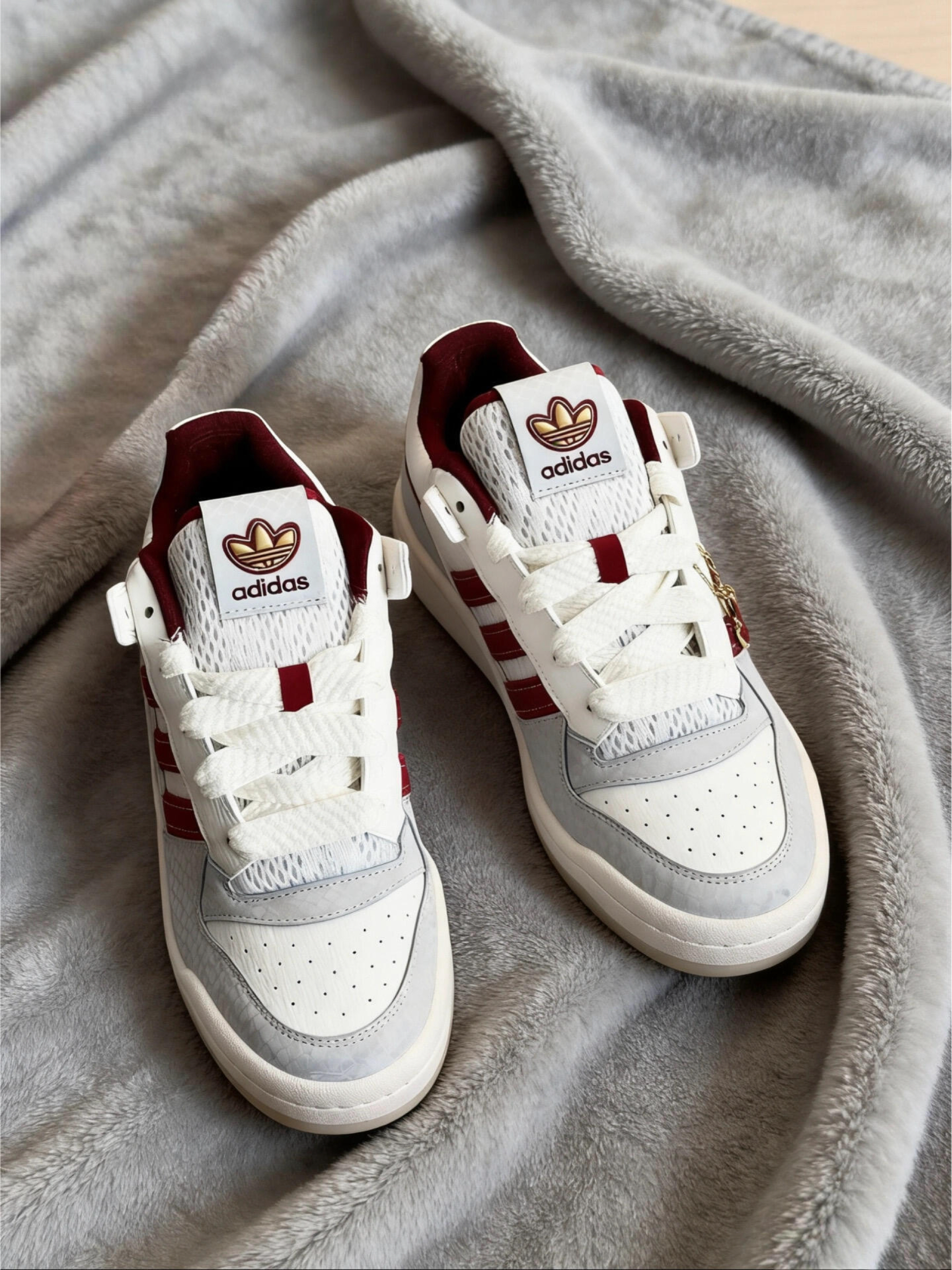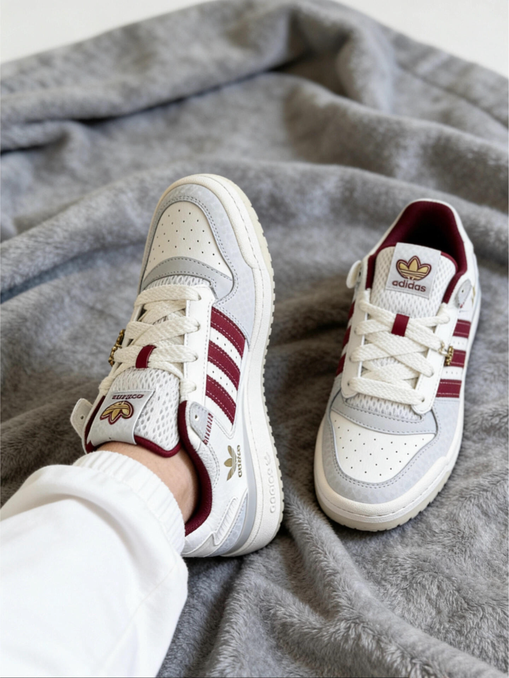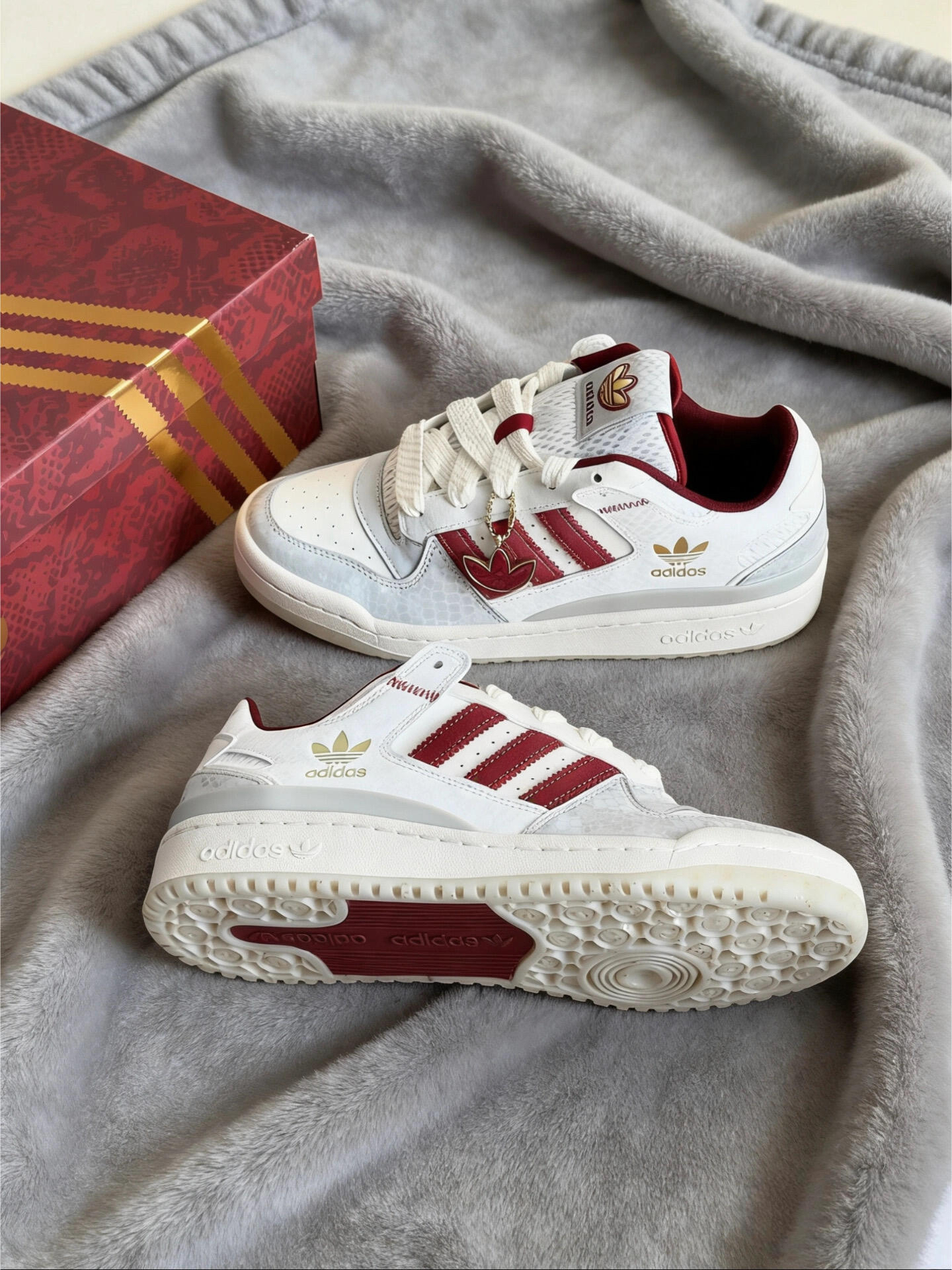 新年穿这双红白配色的阿迪三叶草Forum真的太搭了!酒红撞白+金色刺绣logo,细节里还藏了爱心挂坠,甜酷感直接拉满~ 鞋身的质感超绝,脚感也很软乎,日常搭牛仔裤、小裙子都巨好看,新年战鞋选它准没错!