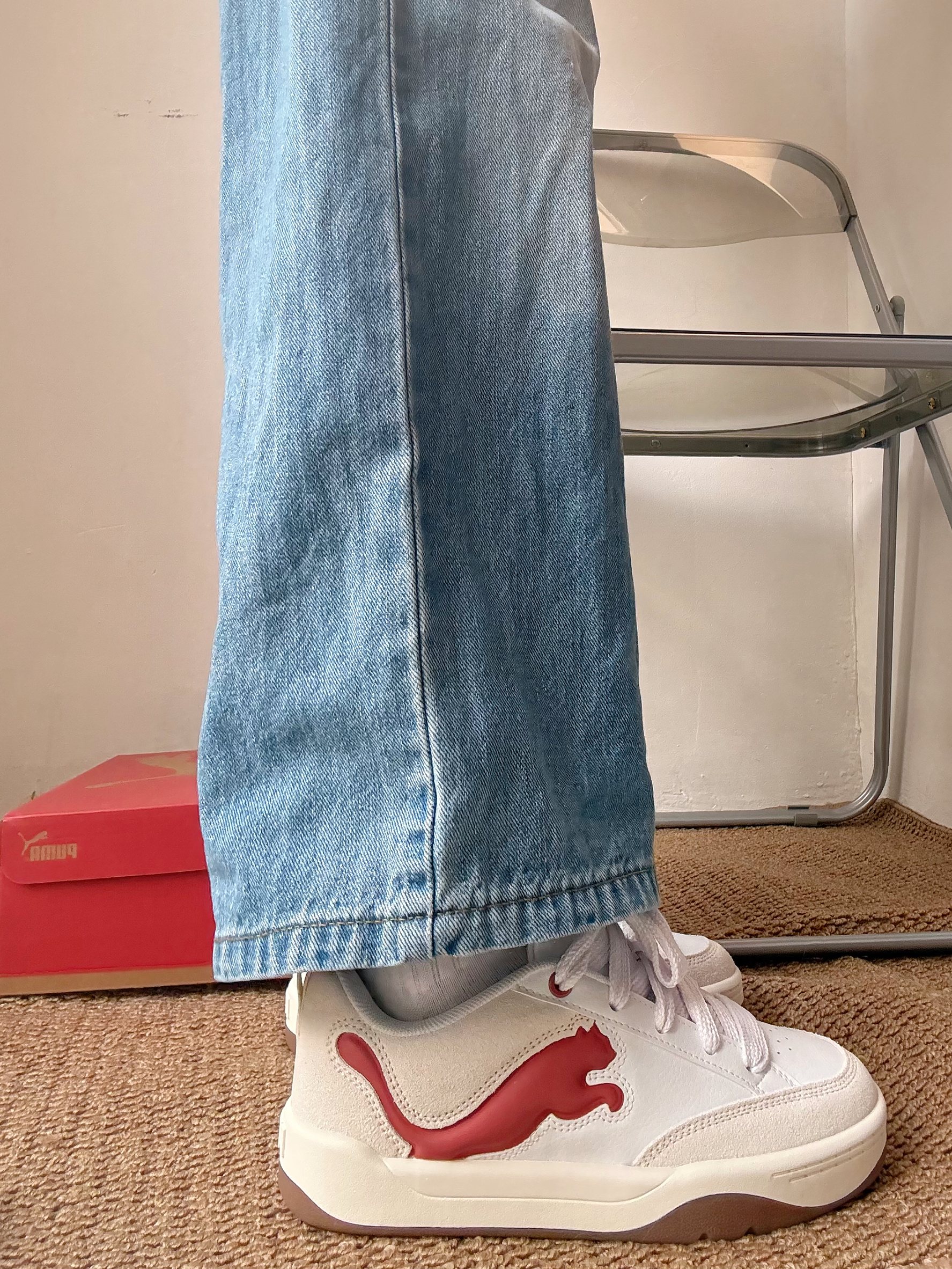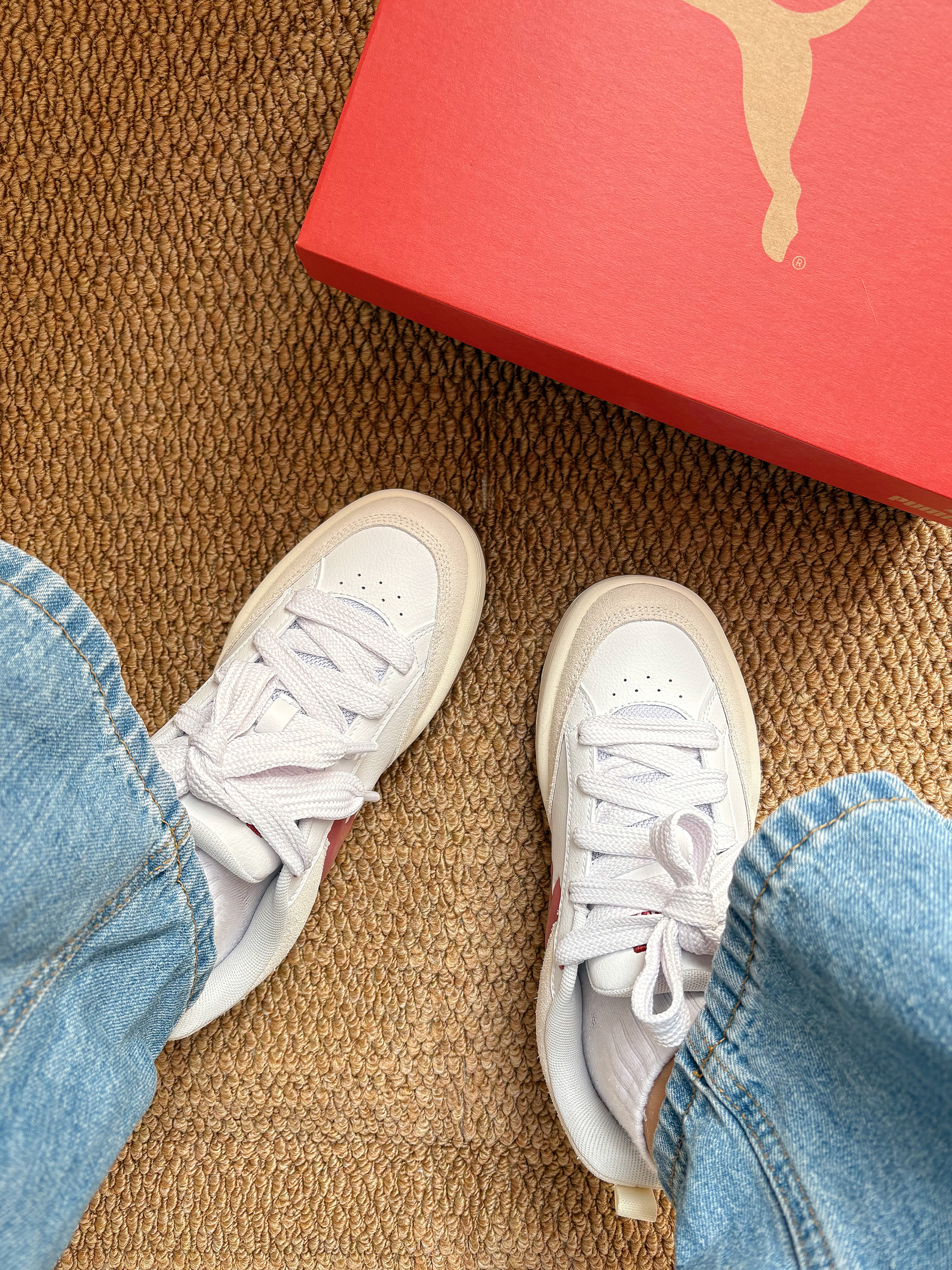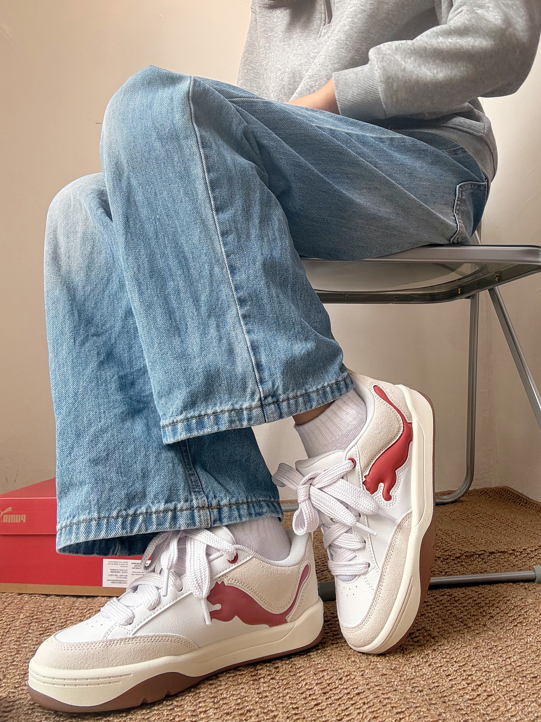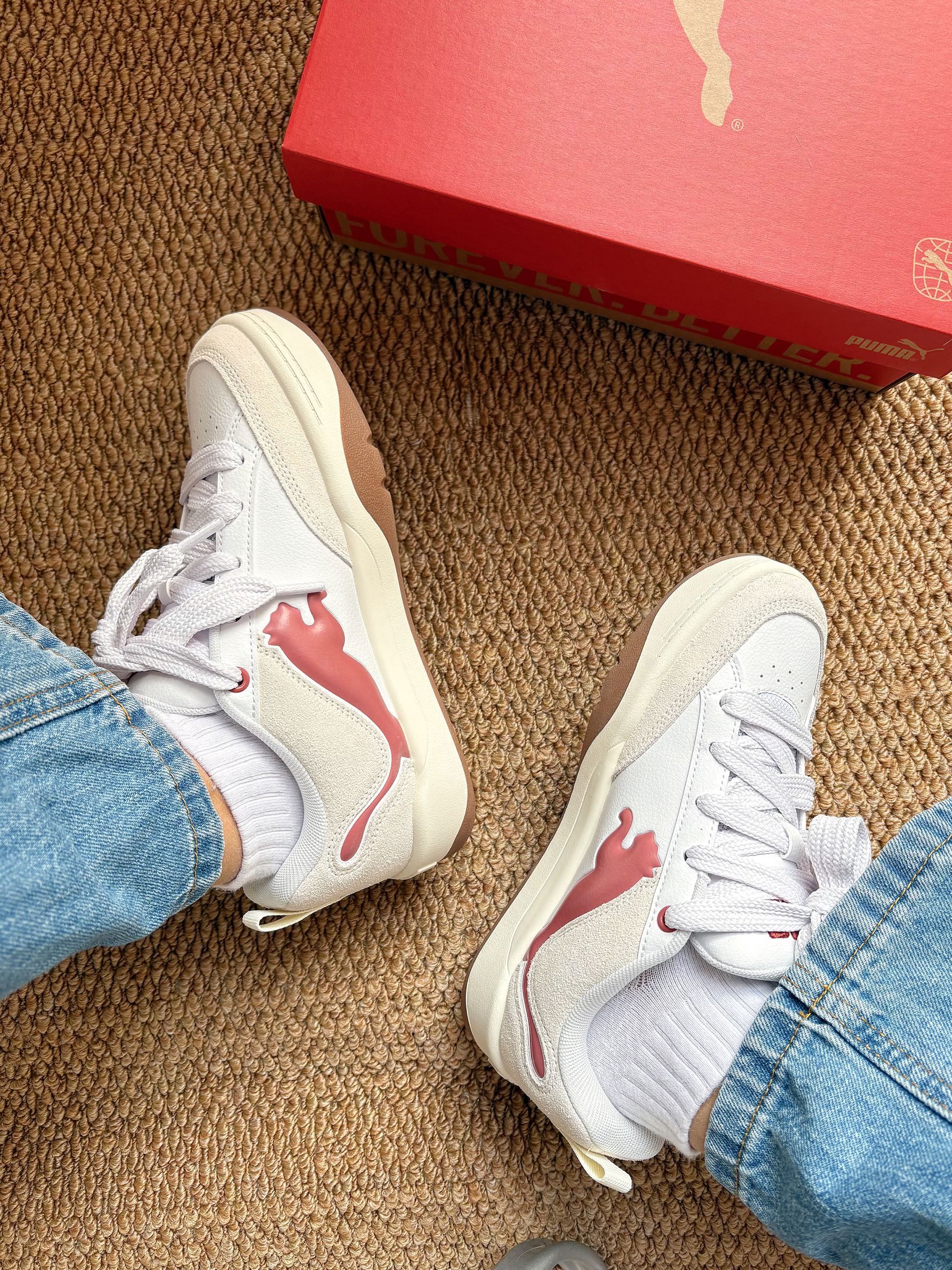 谁能拒绝这么可爱的PUMA板鞋啊! 奶白和豆沙红的组合,上脚巨显脚小,厚底还悄咪咪增高~ 随便搭条牛仔裤都很有氛围感✨