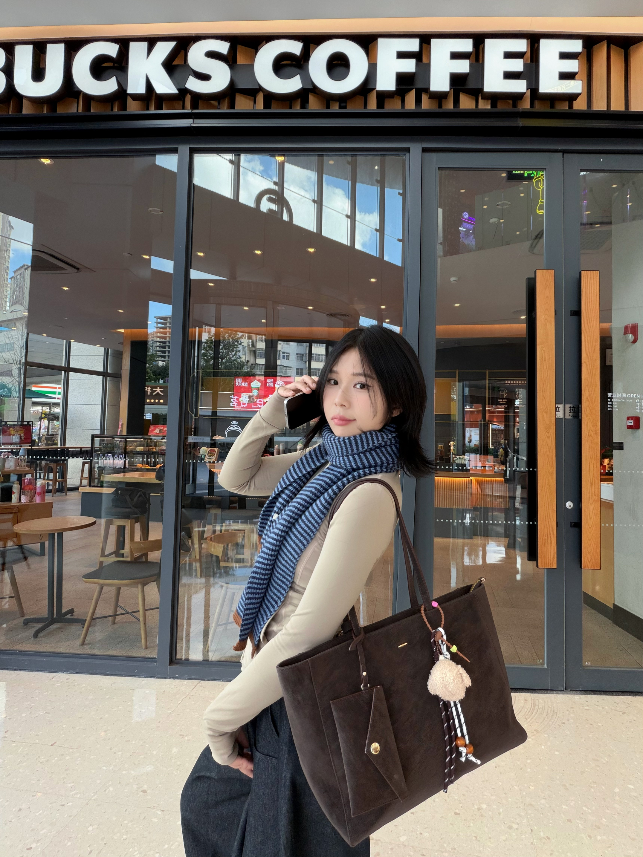 懒人通勤穿搭 就要简单干净 修身上身搭配阔腿裤 显高显瘦 加上蓝色围巾点缀 穿搭更耐看 通勤配饰上少不了一个百搭又实用的包包 今天背的是 IOIH 复古托特包 容量大 款式简约 解决的我日常背包的需求 日常出门 常用的笔记本和日用品都可以放下 自带零钱包和小挂坠整体更俏皮可爱,实用性也更高哦