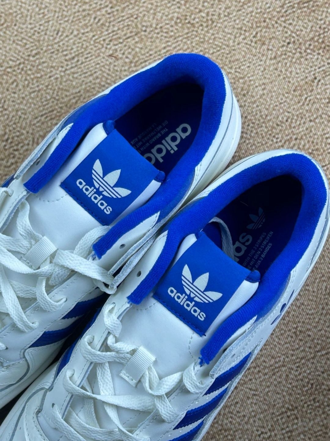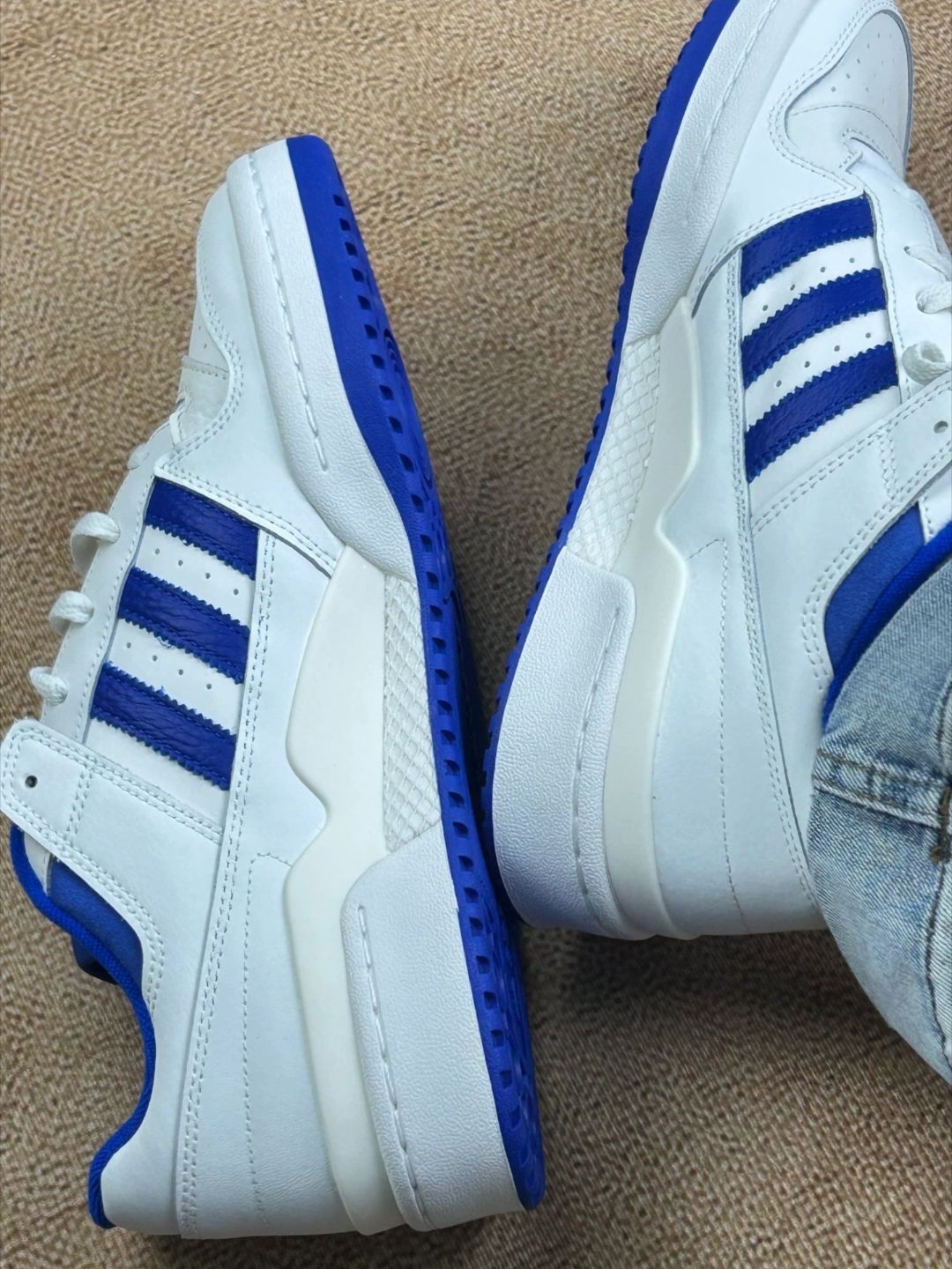刚上脚这双阿迪Forum Low白蓝款说下真实感受😶 脚感还算软和 日常走路逛街不累脚 搭配牛仔裤也挺百搭的 这点还挺满意 少年感十足 但缺点也很明显 鞋面包裹感有点强 还有鞋舌和鞋帮的蓝色绒布特别容易沾灰 得经常擦 另外鞋身皮质偏硬 新鞋磨脚踝 整体来说日常穿没问题 就是细节上的小毛病得适应适应