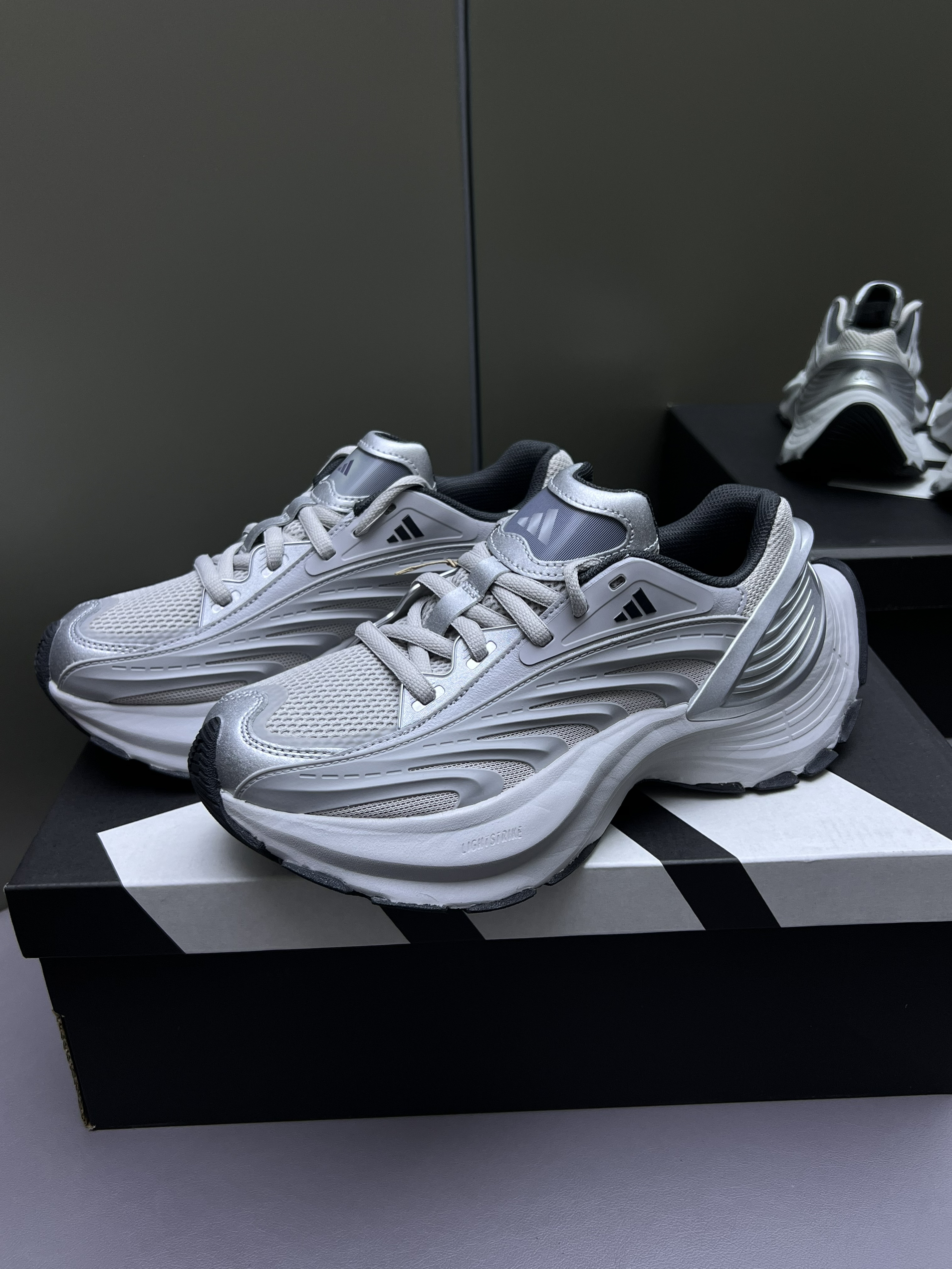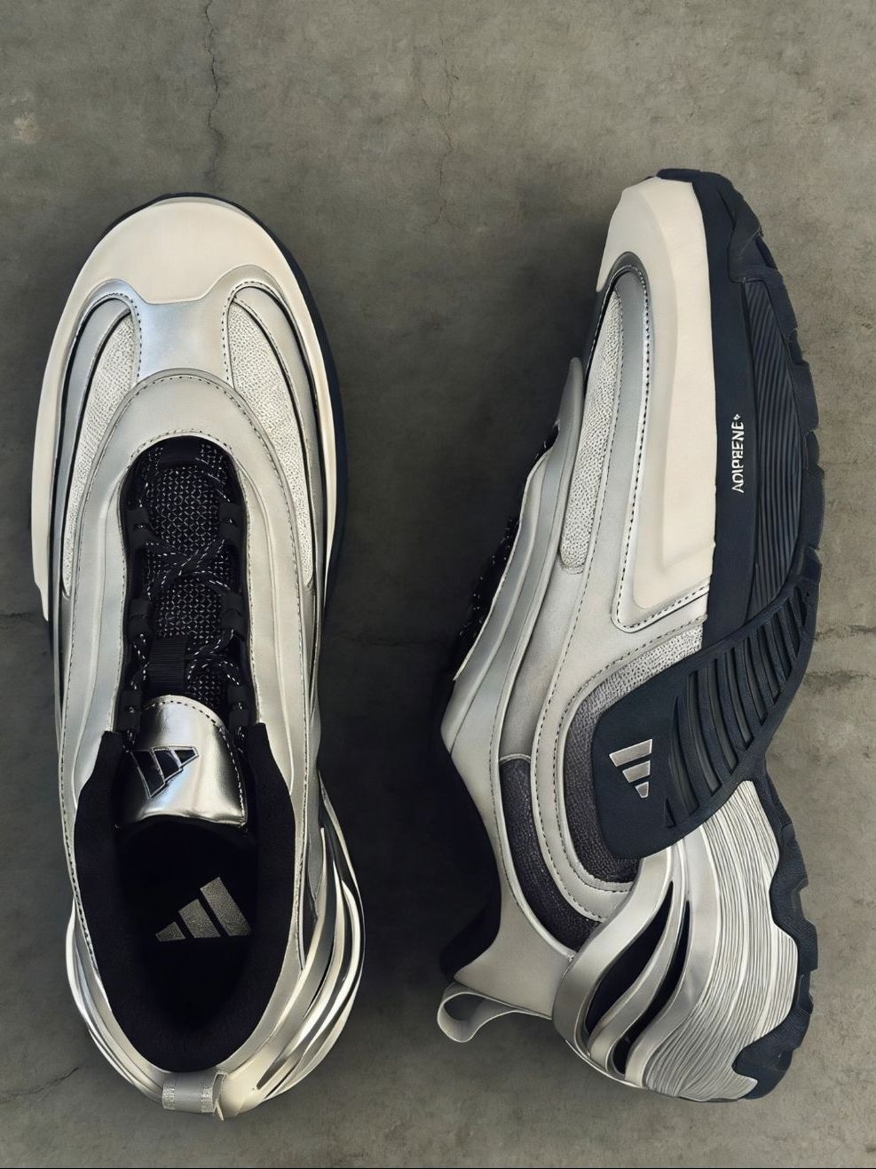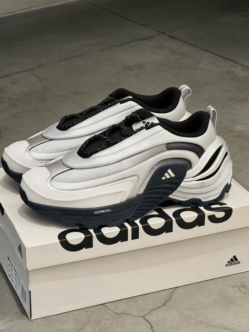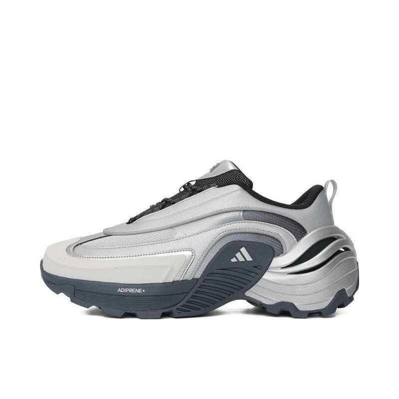 阿迪这双银白配色的老爹鞋直接把未来科技感焊在脚上了!!银灰色的金属质感鞋面搭配流线型的鞋身设计,像踩着银翼穿梭都市,视觉上超有冲击力。鞋身的分层结构和黑色撞色细节,让层次感瞬间拉满,ADIPRENE+缓震科技还保证了上脚的舒适度,暴走一整天都不累。不管是搭配工装裤走街头风,还是配休闲裙搭甜酷风,这双鞋都能成为造型C位,科技风爱好者真的可以闭眼冲,穿上它回头率直接拉满!