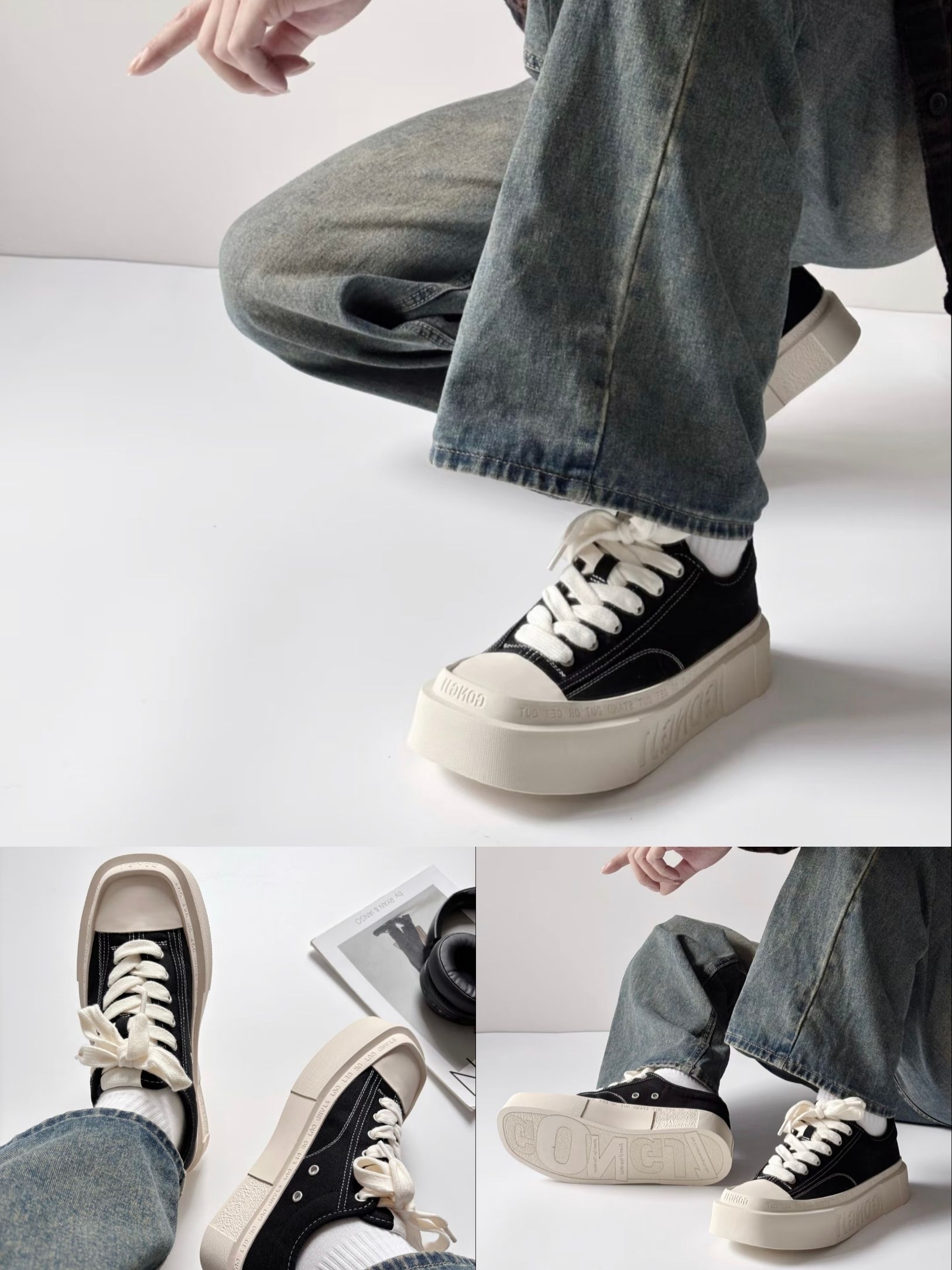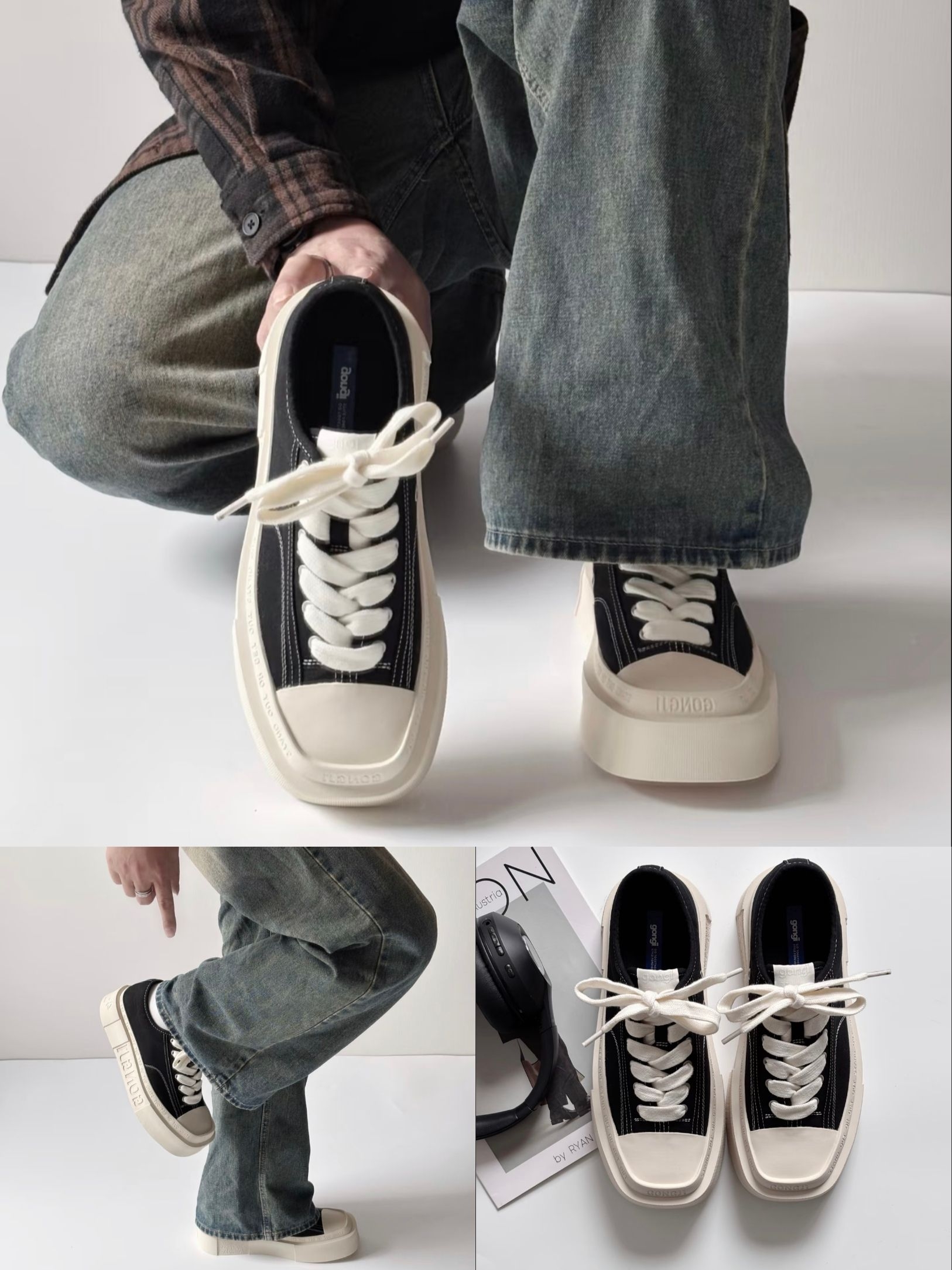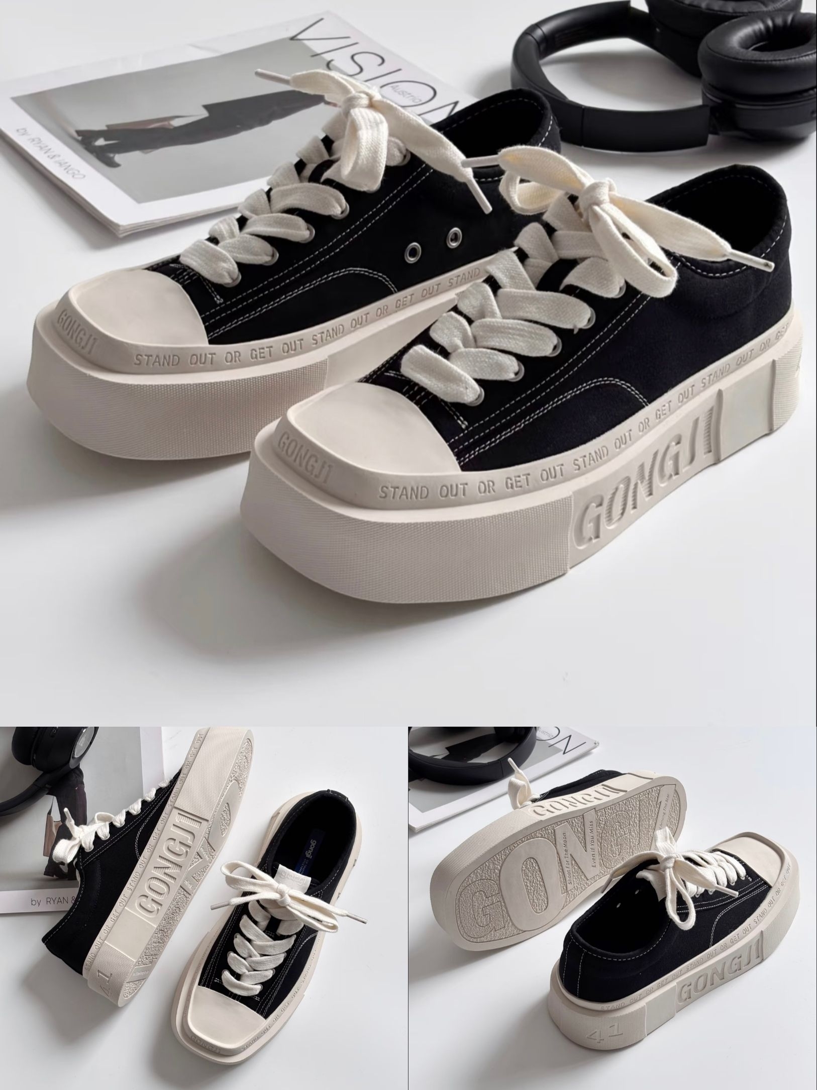 说实话,最初是被GONGJI这双“方寸之地”的设计戳中的。实物质感比图片更挺括,那种方头+厚底的廓形,一上脚就有种利落的复古感。我平时穿38码,这双按正码选刚好,鞋内空间对宽脚友好,不会挤。 最让我惊喜的是,它看着底厚,但实际很轻,走路时有明显的回弹感,通勤赶地铁也不累脚。米白大底搭配黑色鞋身,侧边的“STAND OUT OR GET OUT”标语是点睛之笔,让简单的黑白配色一下子有了态度。我试...
