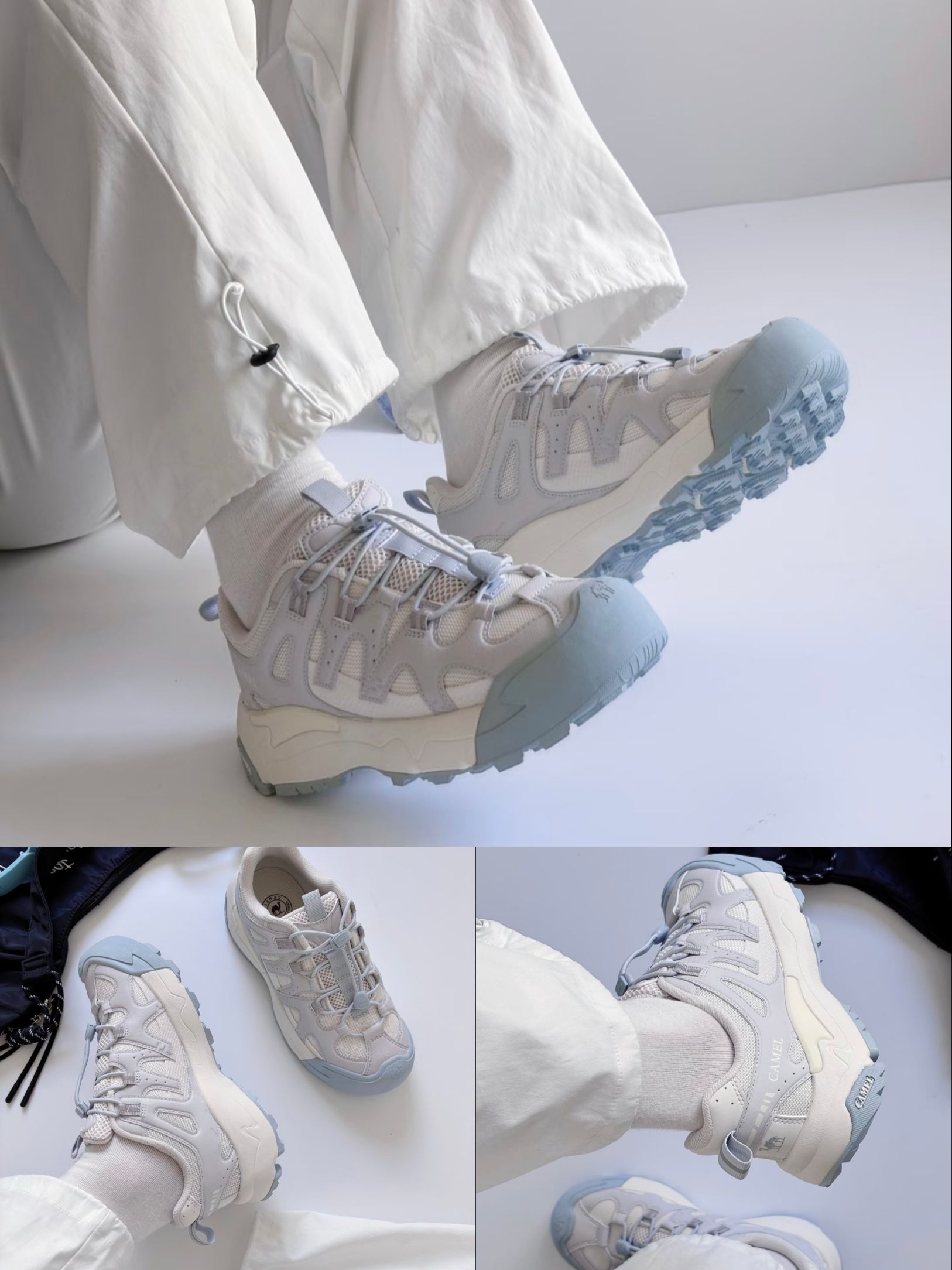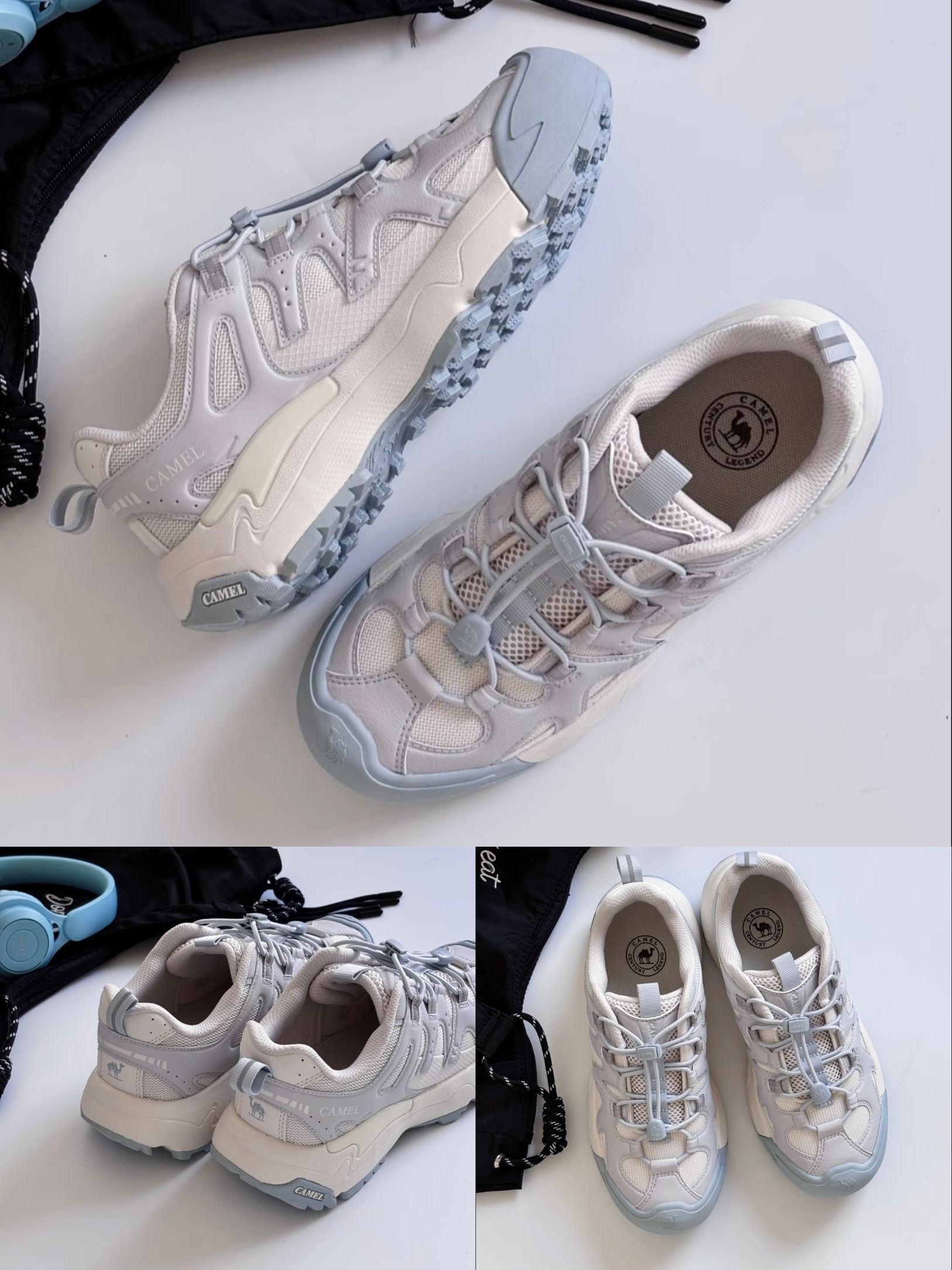 最近常穿这双骆驼云山2代,它给我的感觉是轻松、没负担。鞋面是透气的网眼布拼接,春夏穿不闷。浅灰搭配雾霾蓝的色调很柔和,像图片里那样,配白色阔腿裤和牛仔外套,简单清爽,适合日常通勤和周末出门。 关于尺码:我个人觉得尺码正,但如果你是宽脚面,或徒步时习惯穿厚袜,可以考虑选大0.5码,前掌会更舒适。鞋身是低帮修长版型,不显笨重,搭配九分裤或束脚裤很利落。 它的轻便和百搭是最大亮点。橡胶鞋底抓地稳,纹...