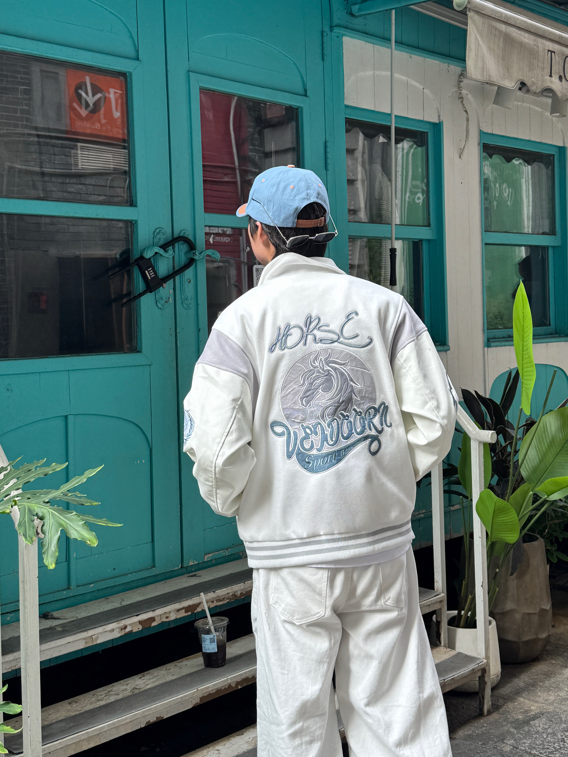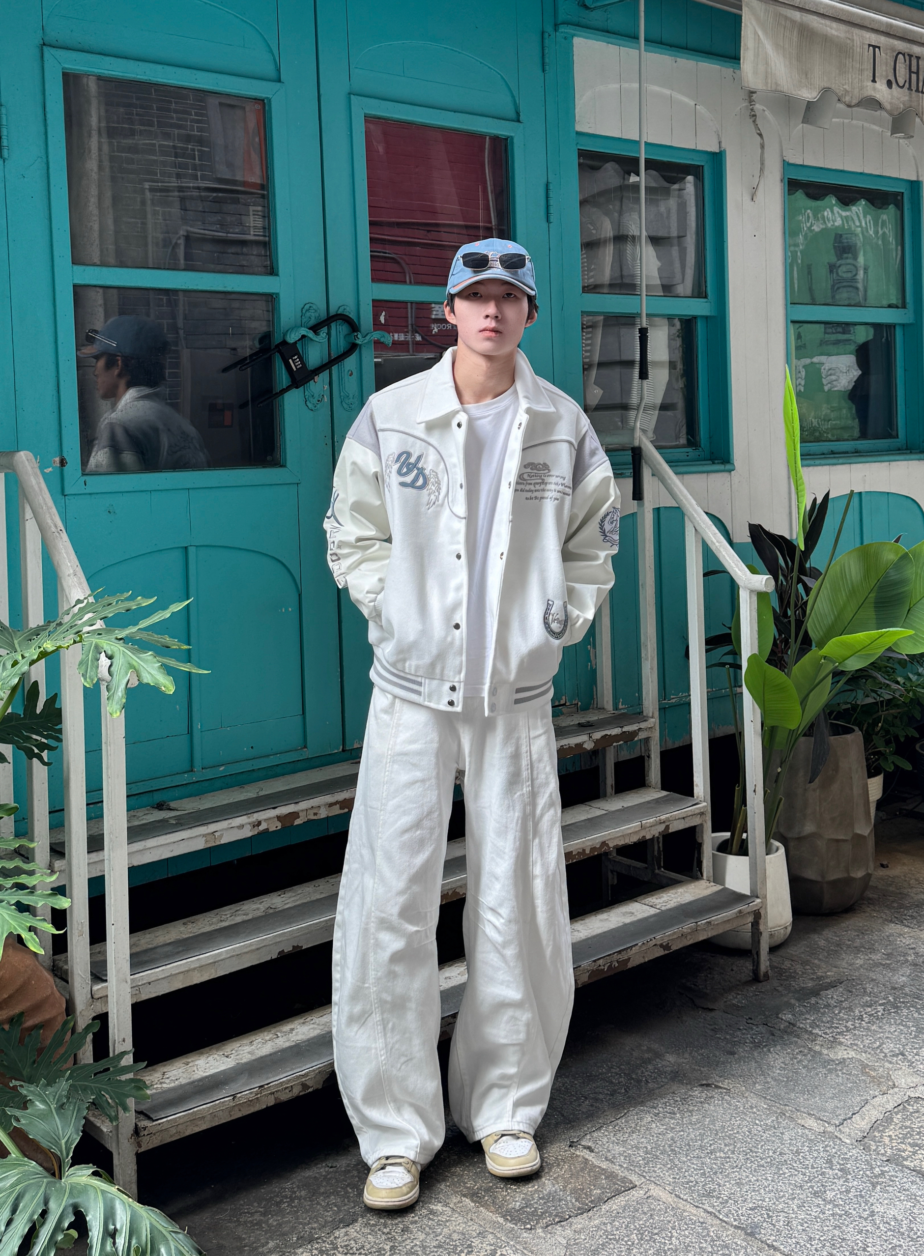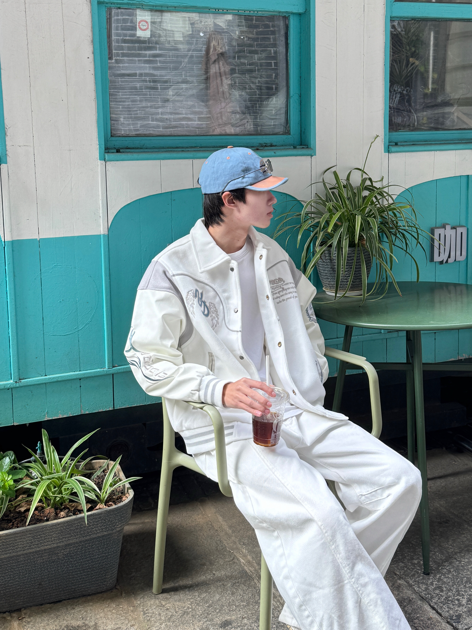 这身清爽到像自带滤镜 一顶天蓝色棒球帽瞬间点亮整体🧢 元气又清新 白色棒球服内搭同色白T 简约有层次 版型宽松不挑人 下身是标志性白色弯刀阔腿裤👖 独特剪裁和垂感走路带风 全身蓝白配色干净又治愈 像把好天气穿在了身上 舒适又亮眼~✨