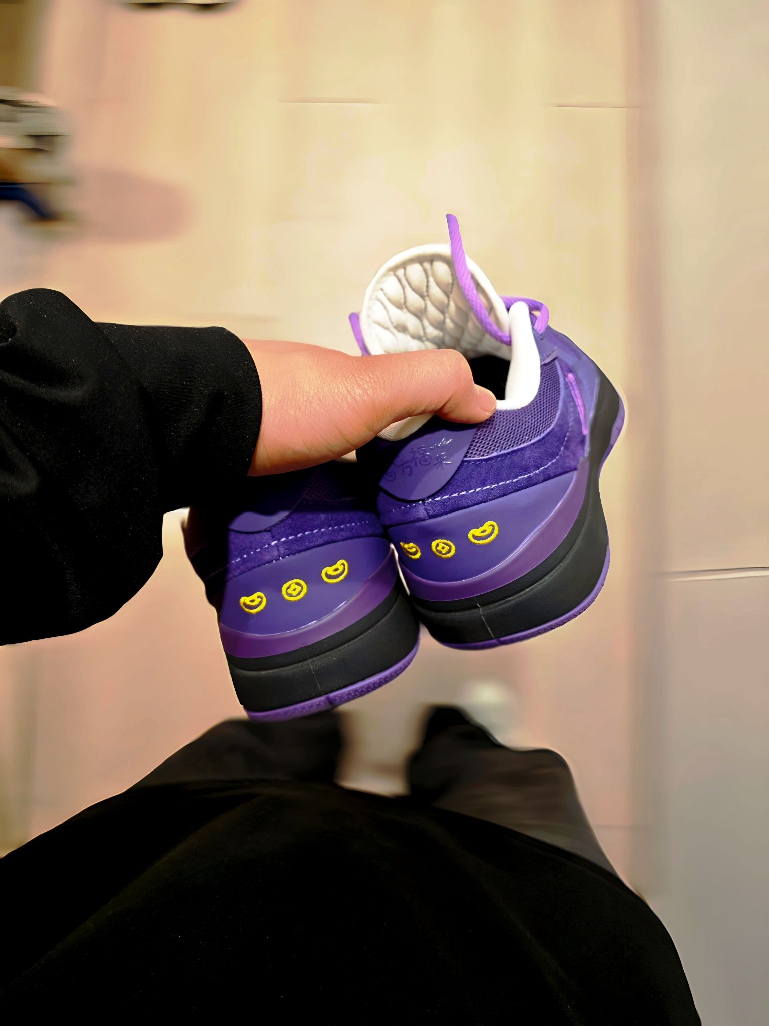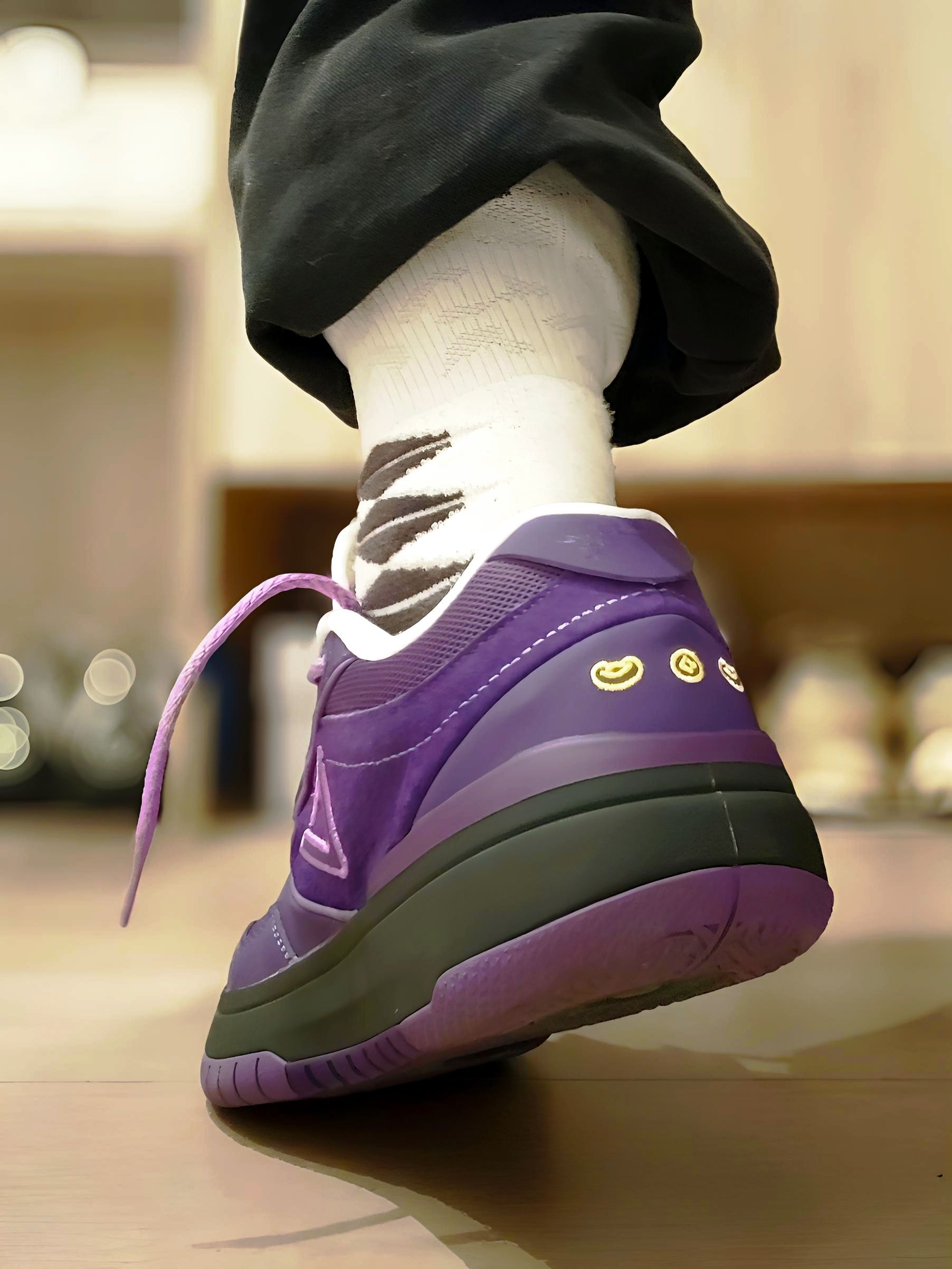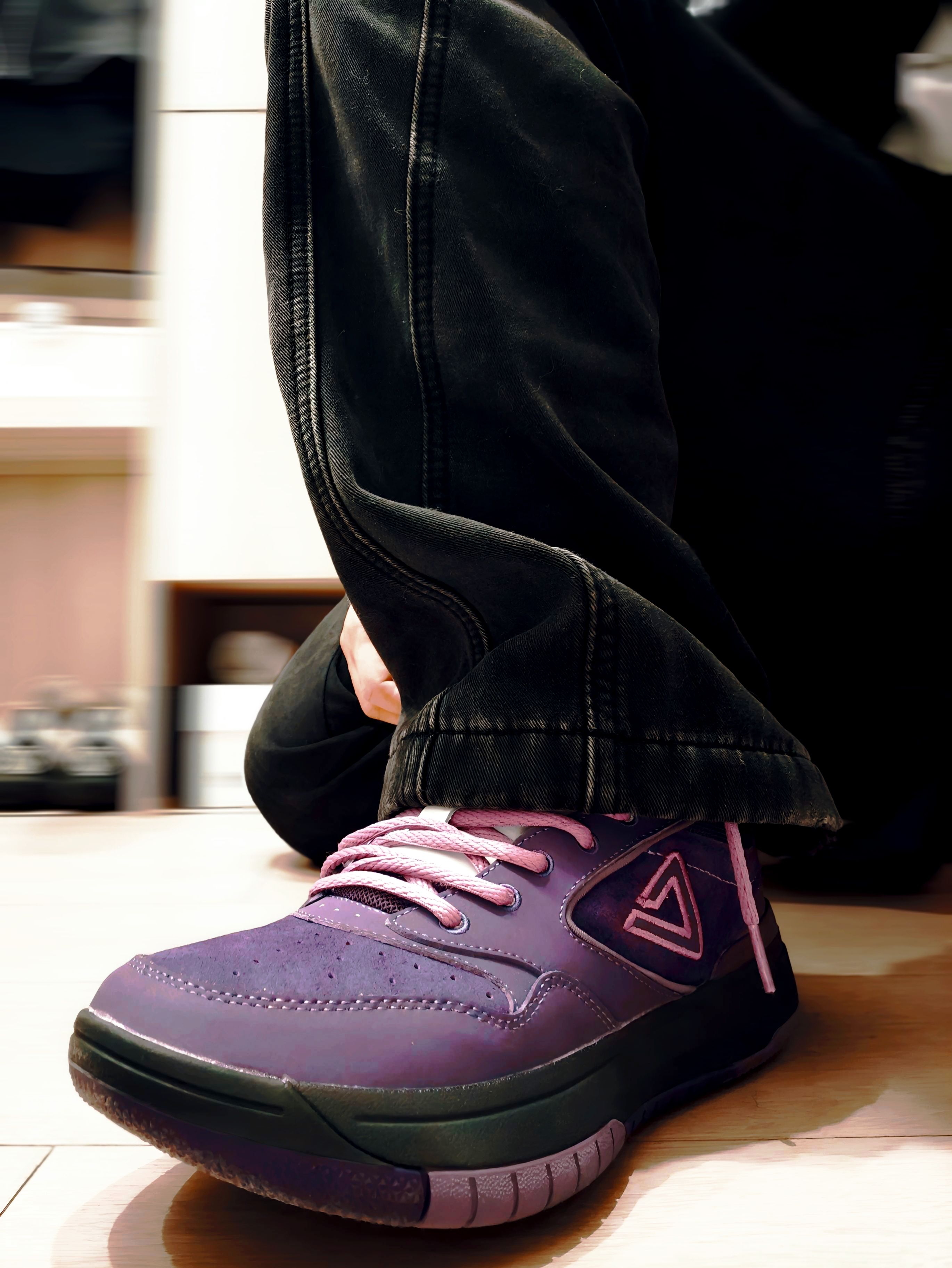 入手这双匹克态极紫色球鞋后,总忍不住多拍几张记录它的质感。 深紫的麂皮材质在光线下泛着细腻的光泽,后跟的黄色刺绣是点睛之笔,和紫调撞出了俏皮的反差感。搭配黑色束脚裤和花纹长袜,日常出街的氛围感直接拉满 上脚的脚感也很惊喜,态极中底不管是走路还是打球都很舒服。 把喜欢的球鞋穿在脚下,连平凡的日常都多了几分专属的仪式感,这大概就是球鞋爱好者的小幸福吧~