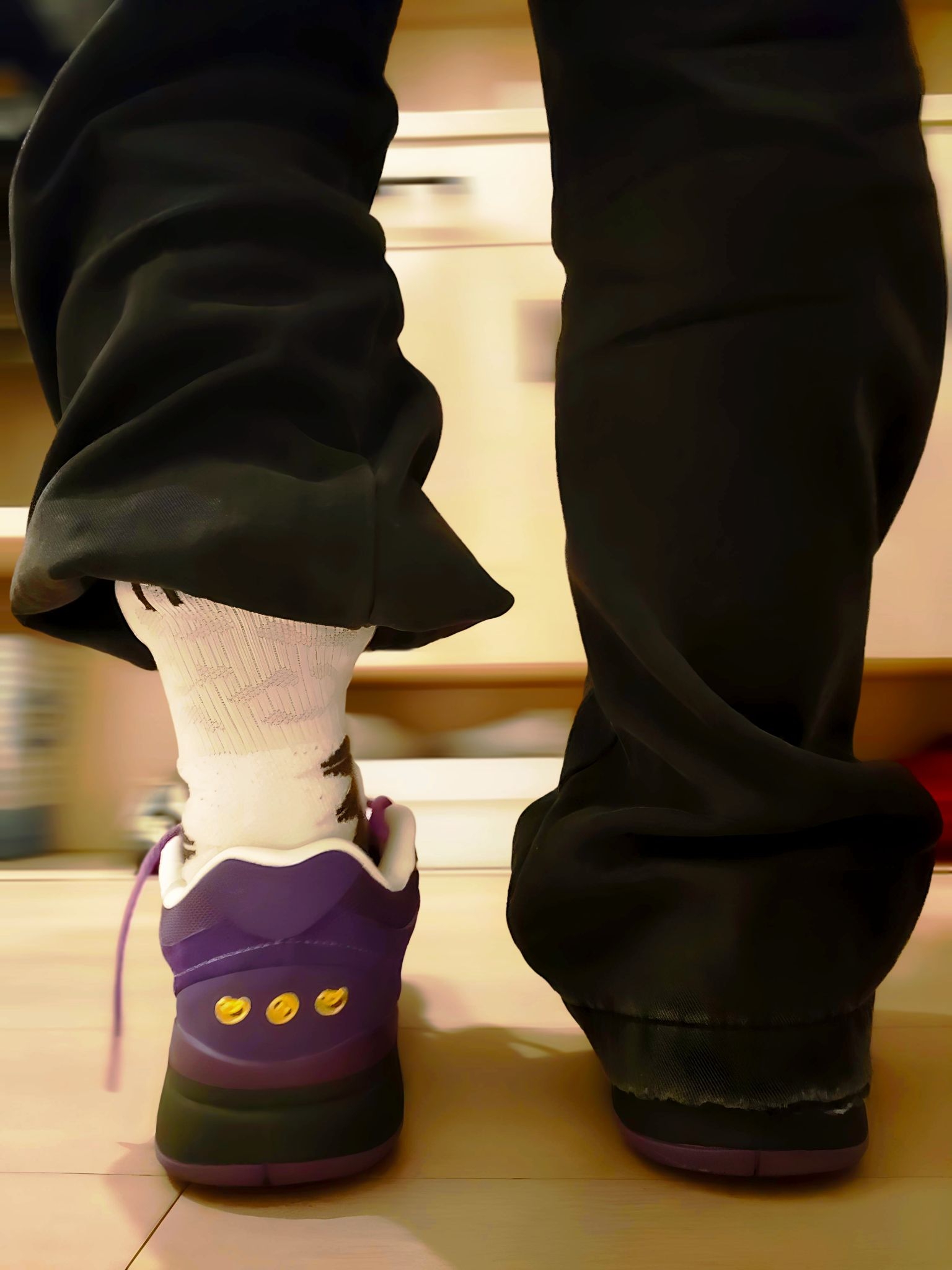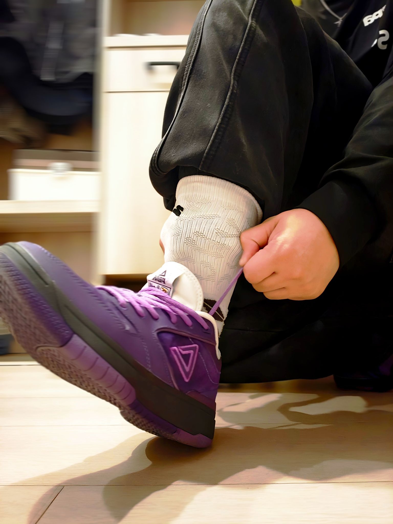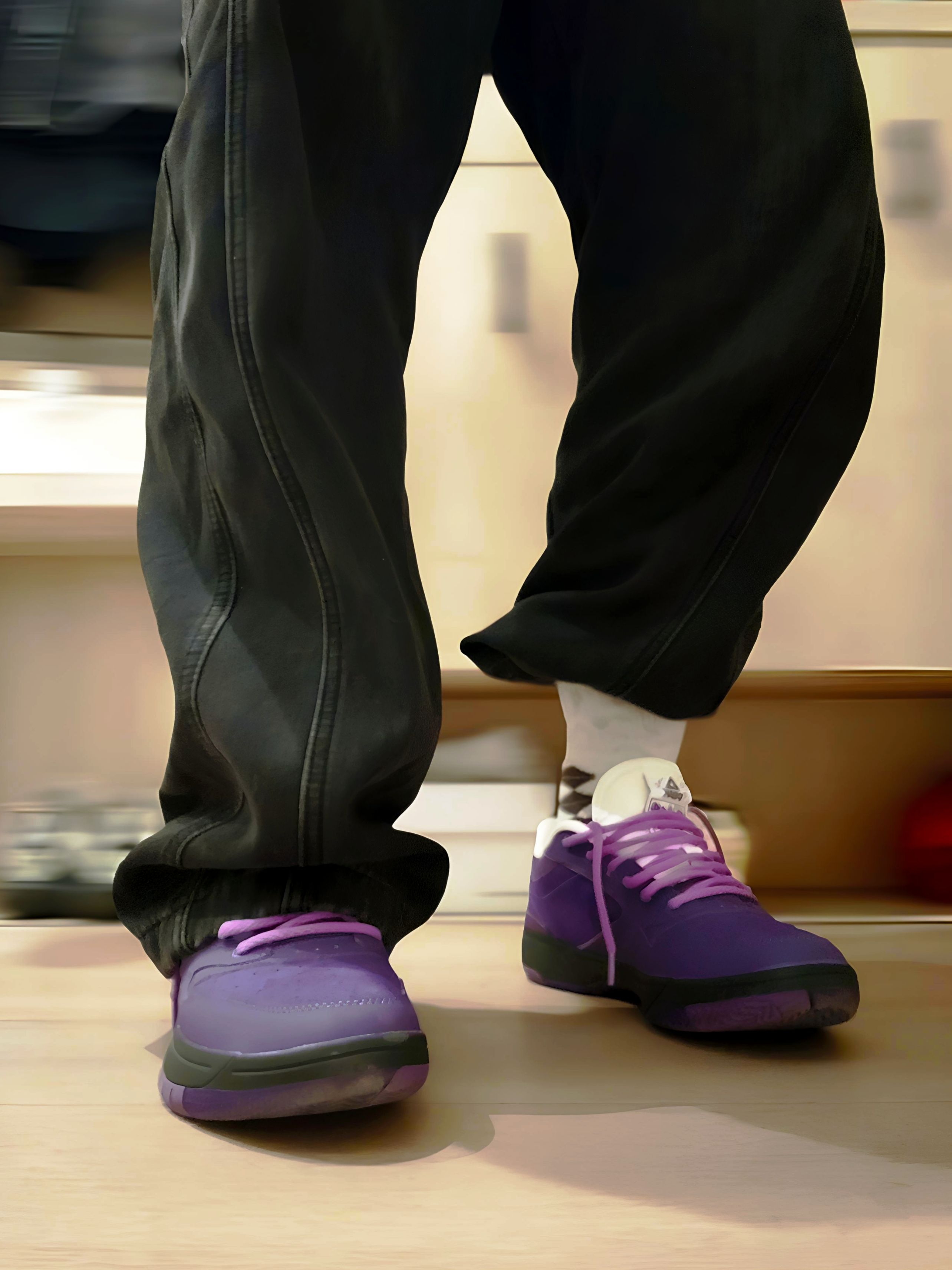 入手这双匹克态极紫色球鞋后,总忍不住多拍几张记录它的质感。 深紫的麂皮材质在光线下泛着细腻的光泽,后跟的黄色刺绣是点睛之笔,和紫调撞出了俏皮的反差感。搭配黑色束脚裤和花纹长袜,日常出街的氛围感直接拉满 上脚的脚感也很惊喜,态极中底不管是走路还是打球都很舒服。 把喜欢的球鞋穿在脚下,连平凡的日常都多了几分专属的仪式感,这大概就是球鞋爱好者的小幸福吧~