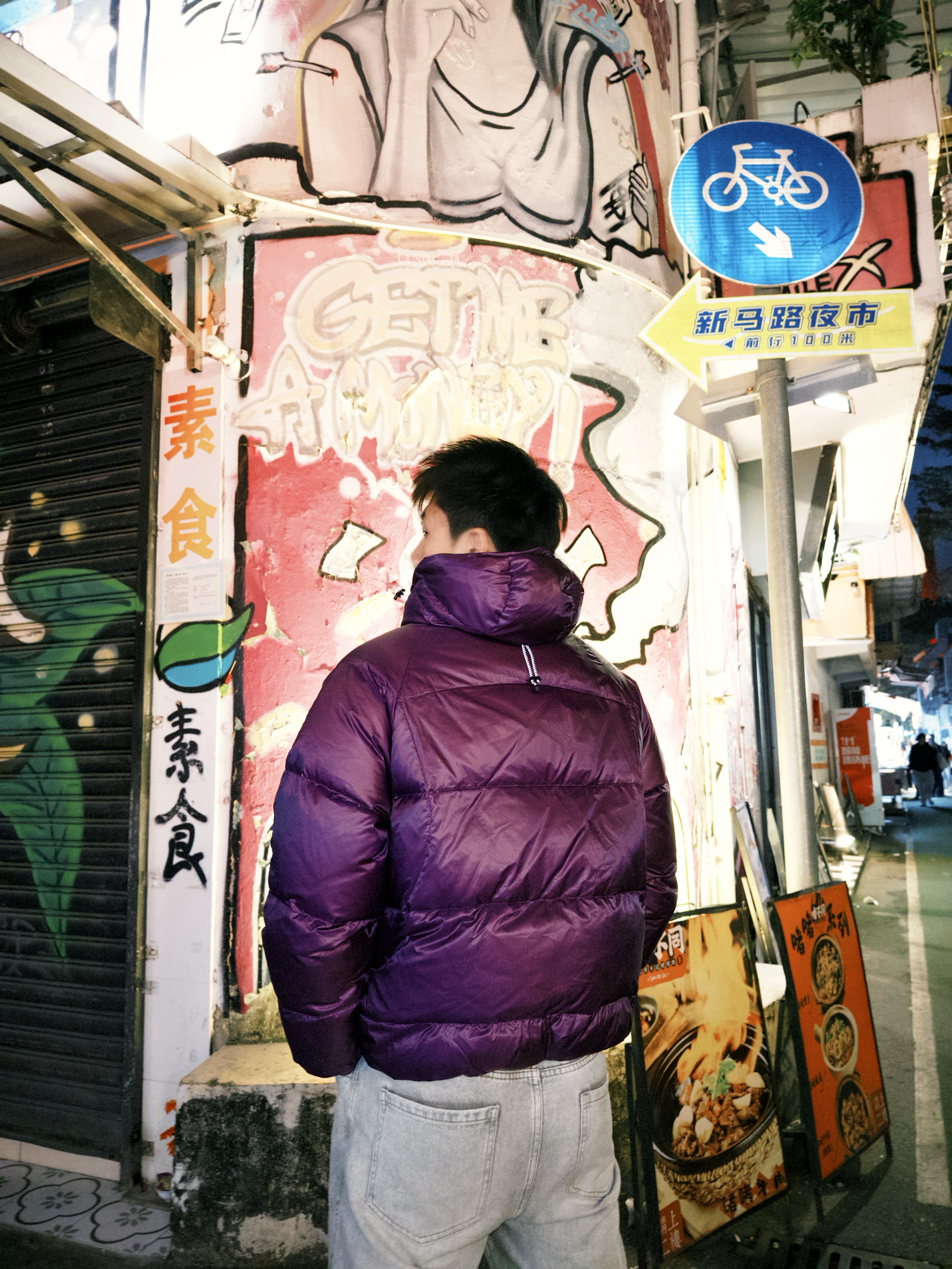 “这件江南先生的电光紫羽绒服真的是炸街神器! 亮面的紫色在澳门街头的涂鸦墙前拍照,回头率直接拉满。90%的白鸭绒填充裹着巨暖和,三防面料碰点小雨也不怕,连帽的面包廓形穿着还特别松弛,配条牛仔裤就很有街头感。 你们觉得亮色羽绒服搭浅色裤还是深色裤更好看?评论区说说~”