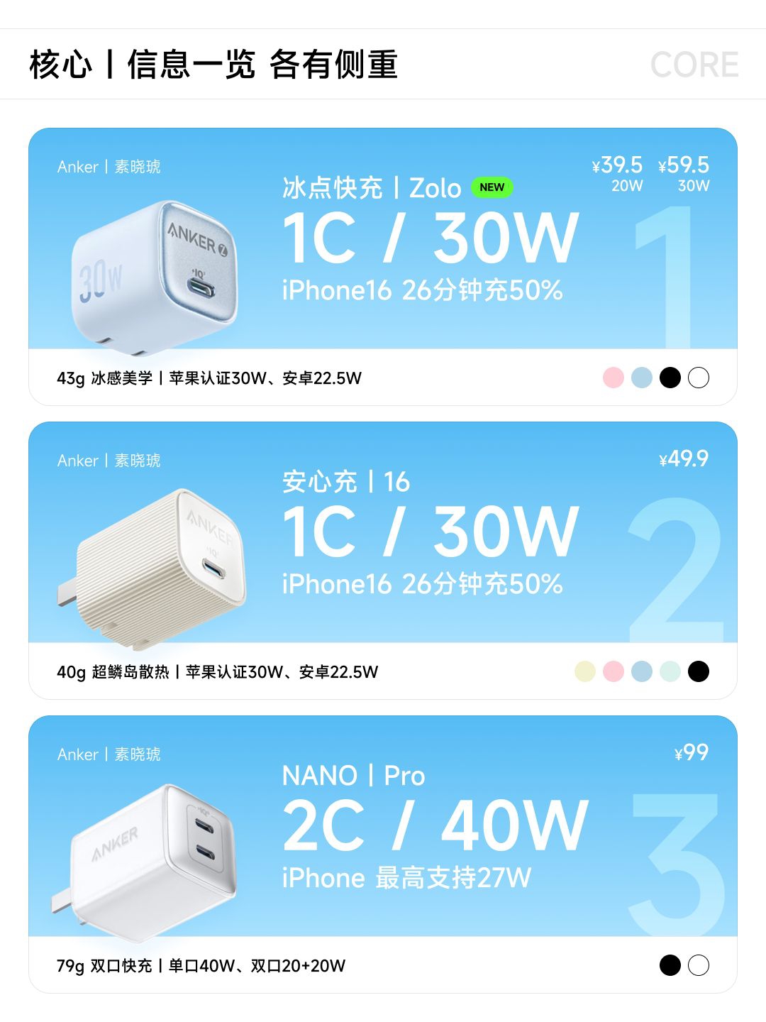 你们要的安克「充电器」合辑,来了。 Anker的特色:处处体现与苹果🍎的强绑定。 这一点,从产品的整体设计风格,就可见一斑。 但多年积累发布的产品繁杂, 为了方便大家查阅,我精简为了目前各位看到的6款。 涵盖了单口、双口、三口、四口。 老样子,看图参考,自行斟酌。 如有帮到,还望各位不吝仨联~多谢🙏🍀
