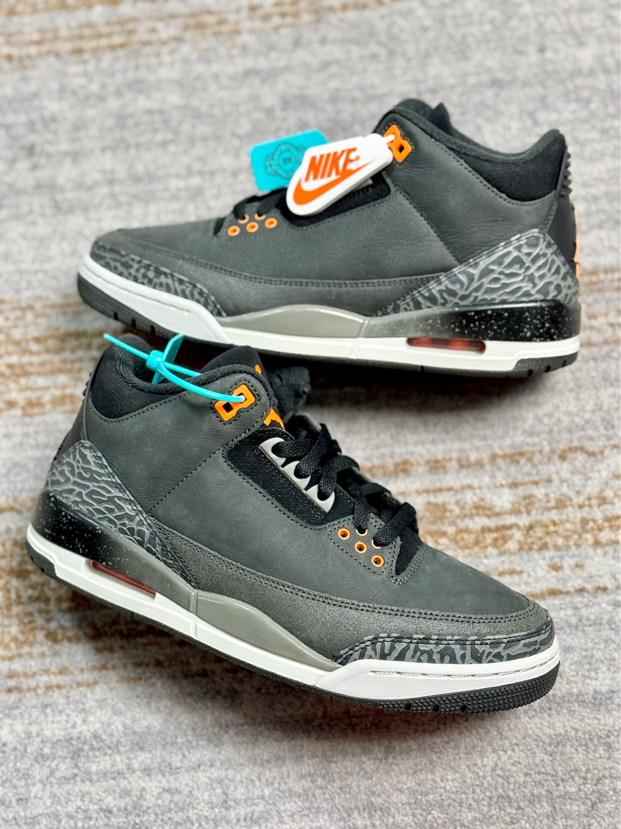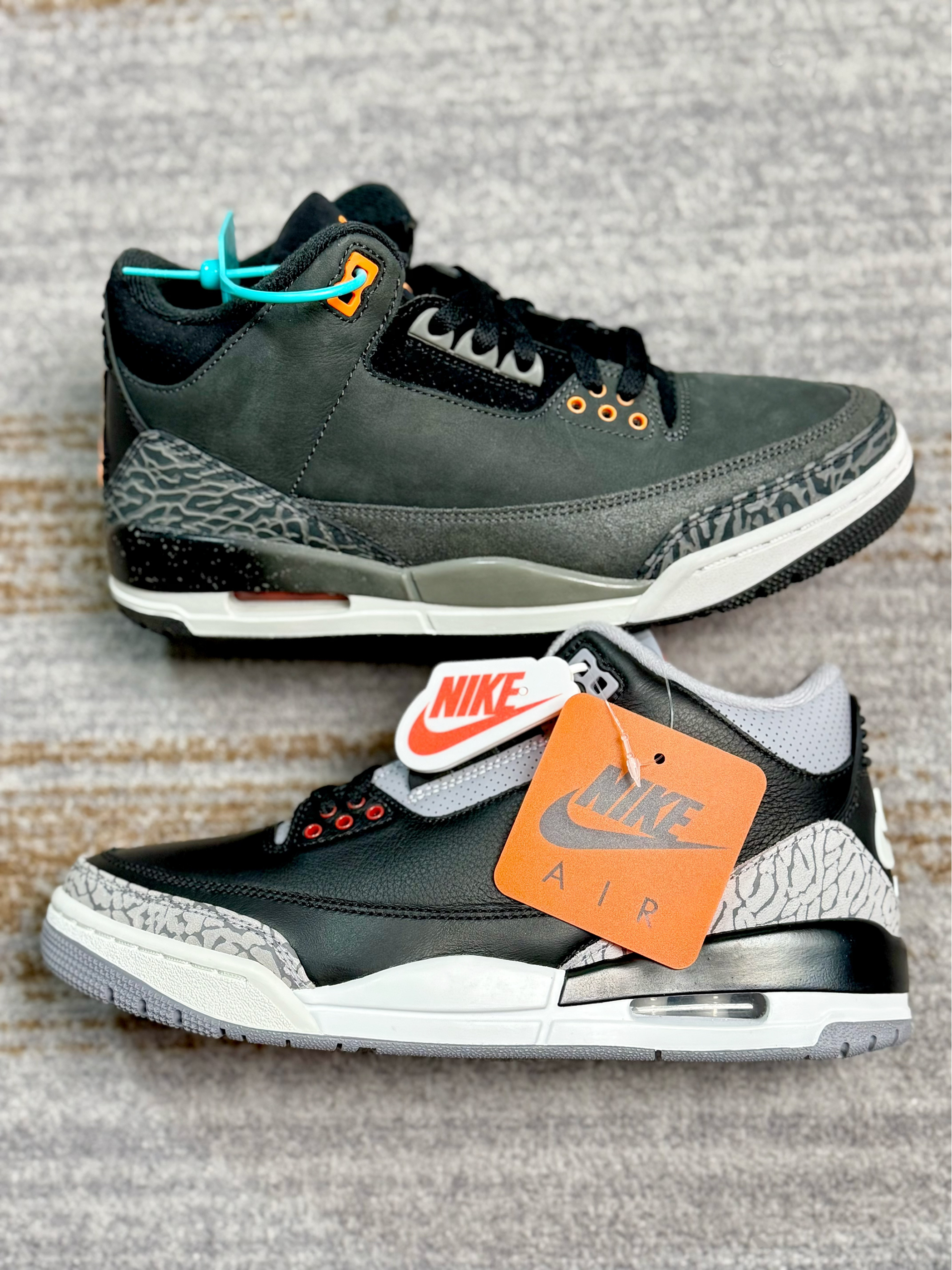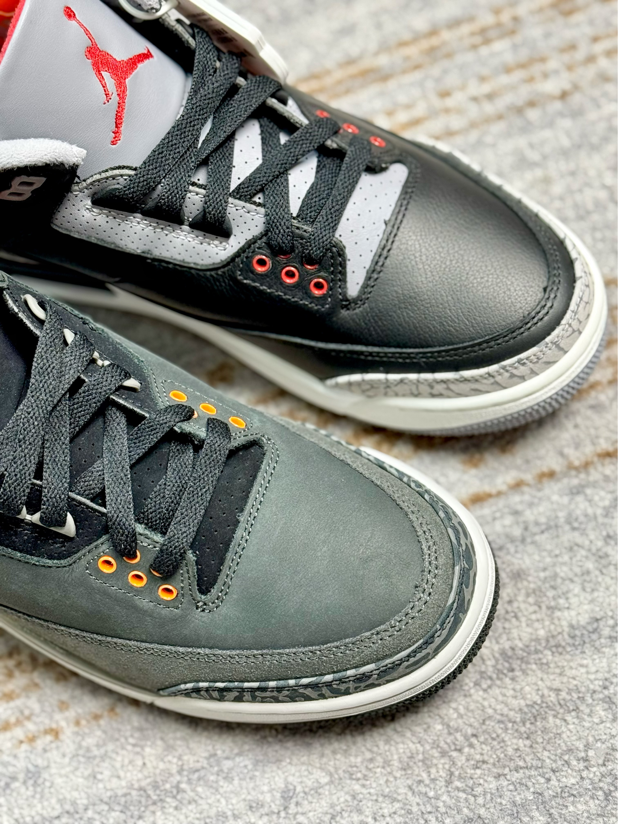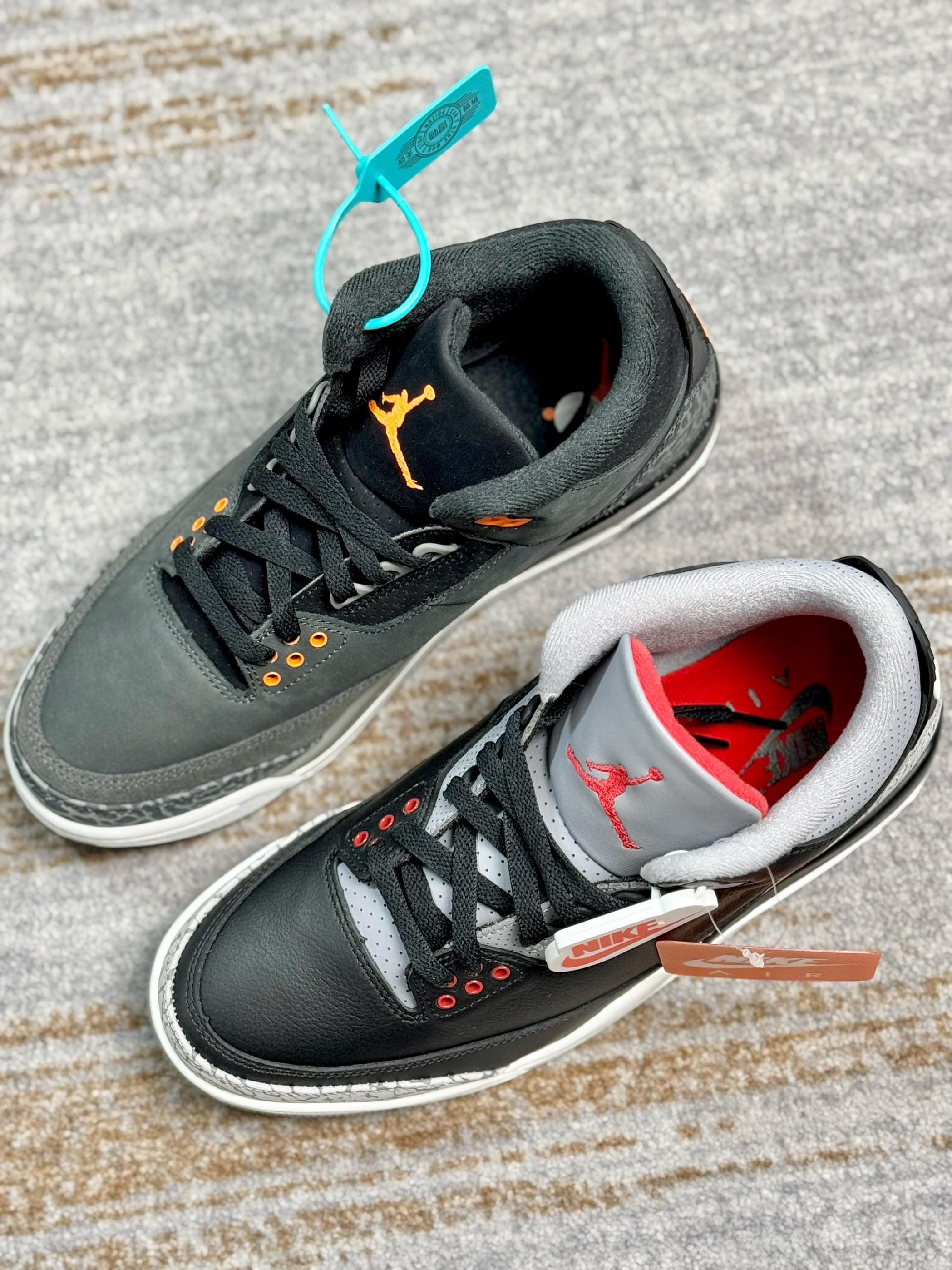 作为AJ3系列的经典配色,还挺难抉择的 一双的黑水泥复刻,另一双是恐惧复刻 两双颜值都相当的高,也蛮适合冬季穿搭 不过黑水泥是皮革材质,相对好打理些 恐惧的质感显高级,尤其喜欢鞋身的橙色点缀 尺码方面两双都不偏码,正码选择即可 预算有限的情况下,大家会优先选择哪一双?
