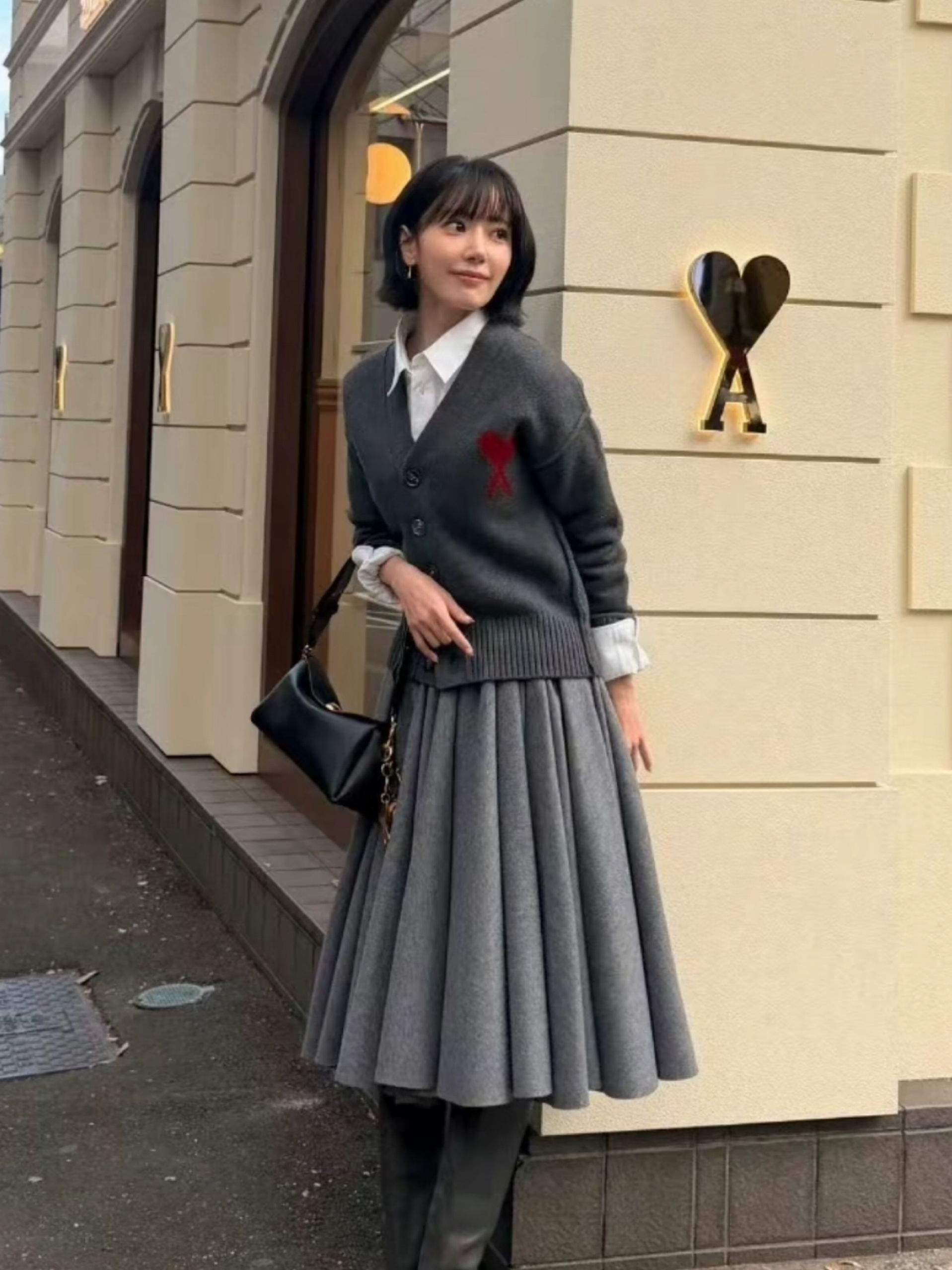 小樱花这套格雷系穿搭把温柔和利落揉得刚好~ 同色系针织开衫配百褶长裙,自带松弛的书卷气。而灰色长靴是点睛之笔,它让灰调的柔和里多了几分酷感,既延续了整体的沉稳,又用硬朗靴型平衡了裙子的飘逸,让格雷系的温柔多了些飒爽,日常又耐看。