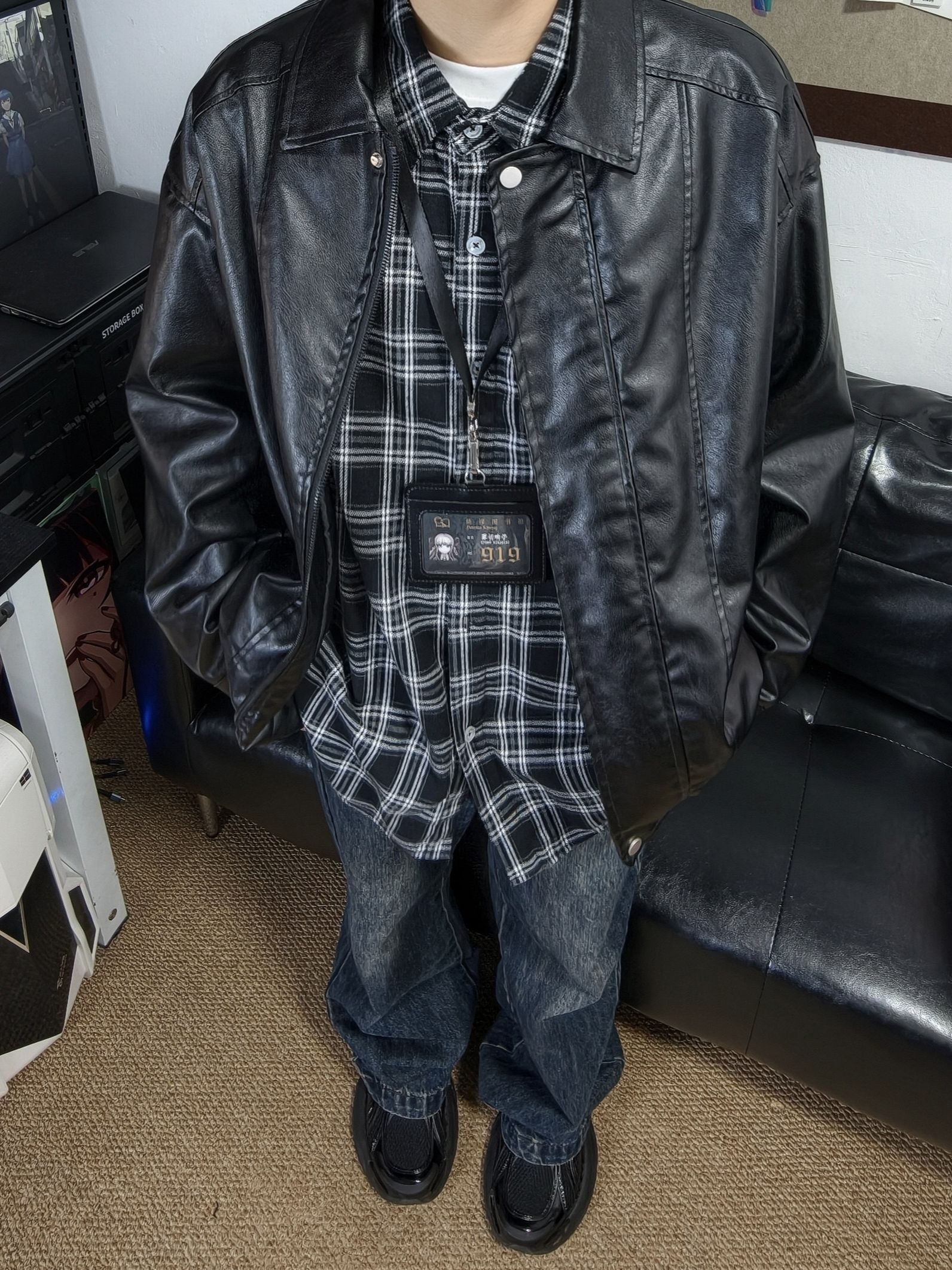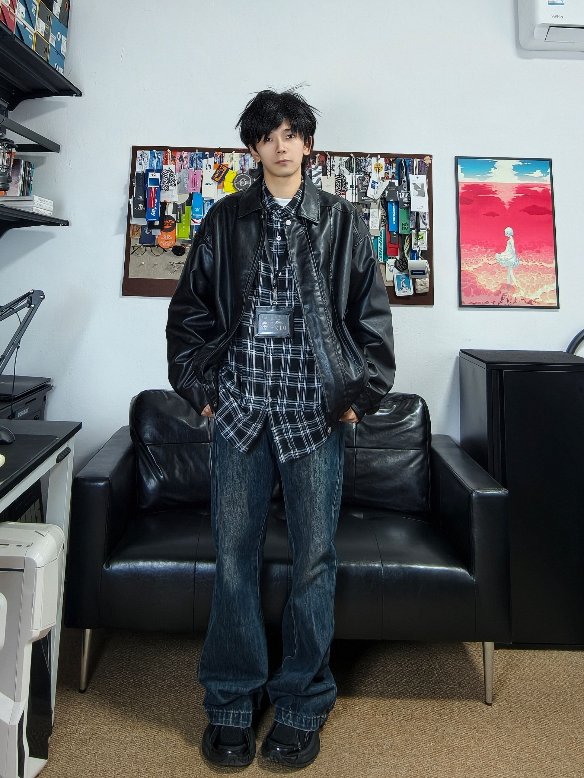 皮衣叠穿衬衣就很有日系的味道 加上一条复古的牛仔裤跟老爹鞋 妥妥的帅男耶