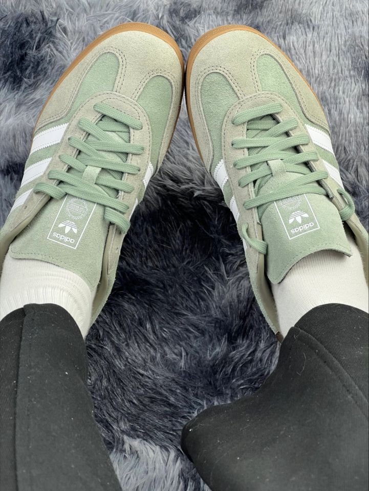 薄荷绿adidas实测:脚宽星人狂喜,但这“祖宗皮”我伺候不动了🌿|||分享下这双Adidas Gazelle的上脚感受👟 拿到手是低饱和的薄荷绿麂皮,摸起来软但不塌,配浅棕后跟还挺耐看的[强_blue][强_blue]。穿了一周,鞋型偏宽对我这种脚略胖的很友好,不挤脚趾,走个万步也没磨后跟。 生胶底看着复古,实际防滑还行,就是走瓷砖地会有点轻响。麂皮确实显质感[亲亲_blue]...
