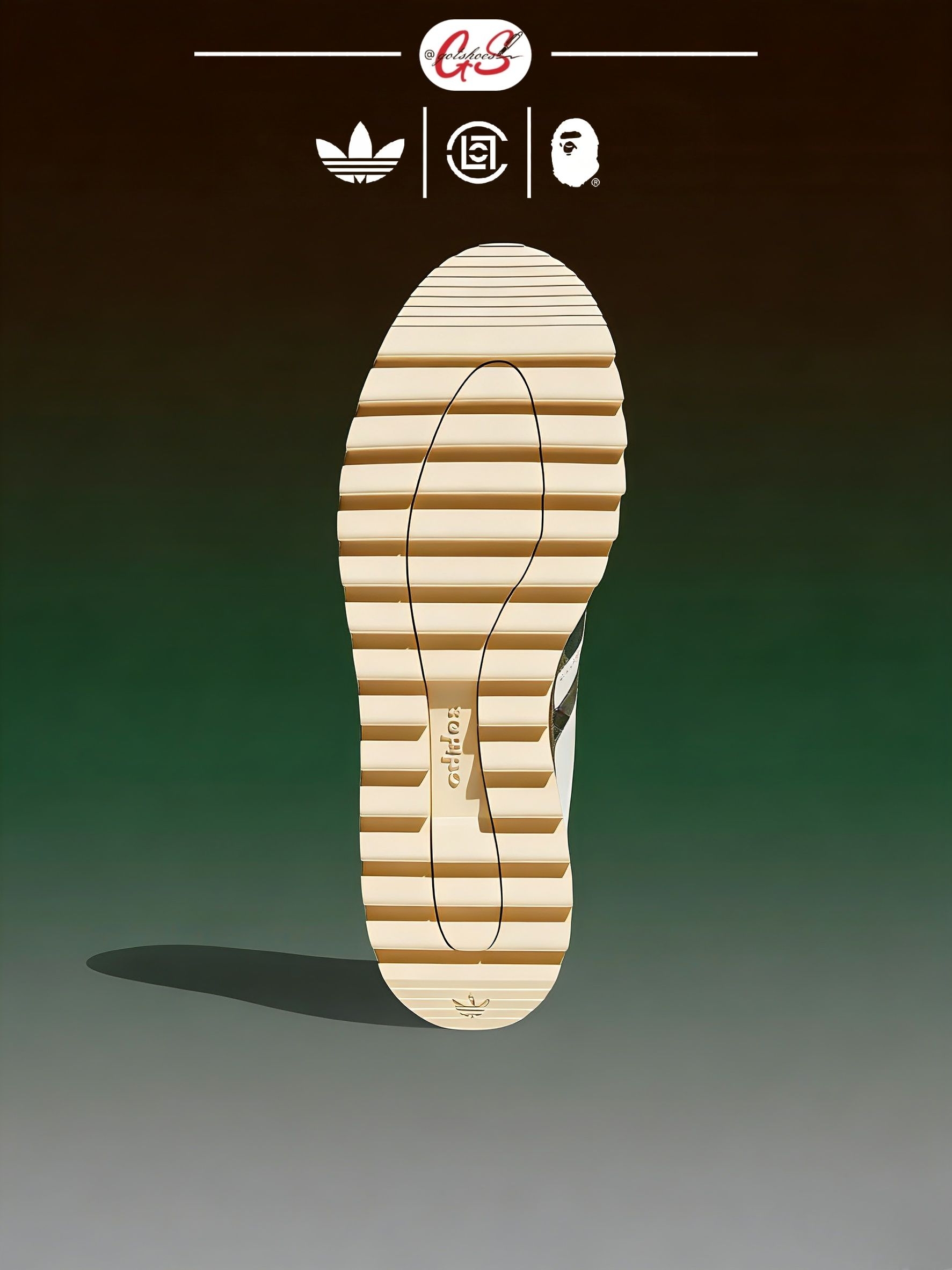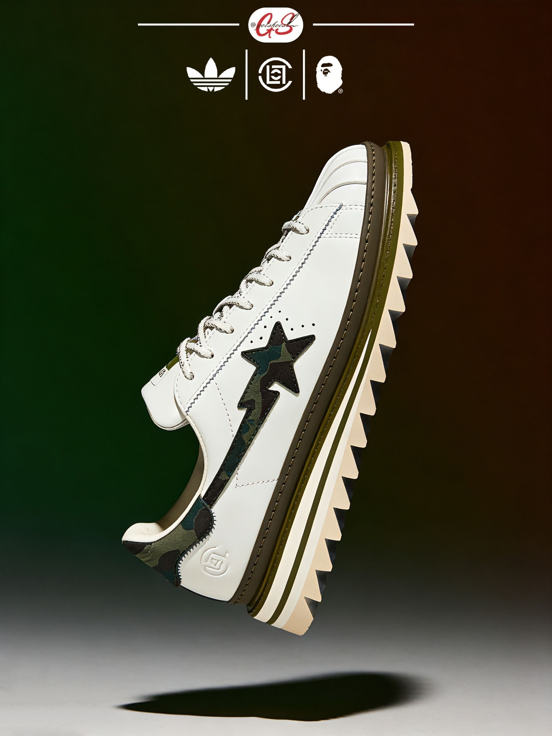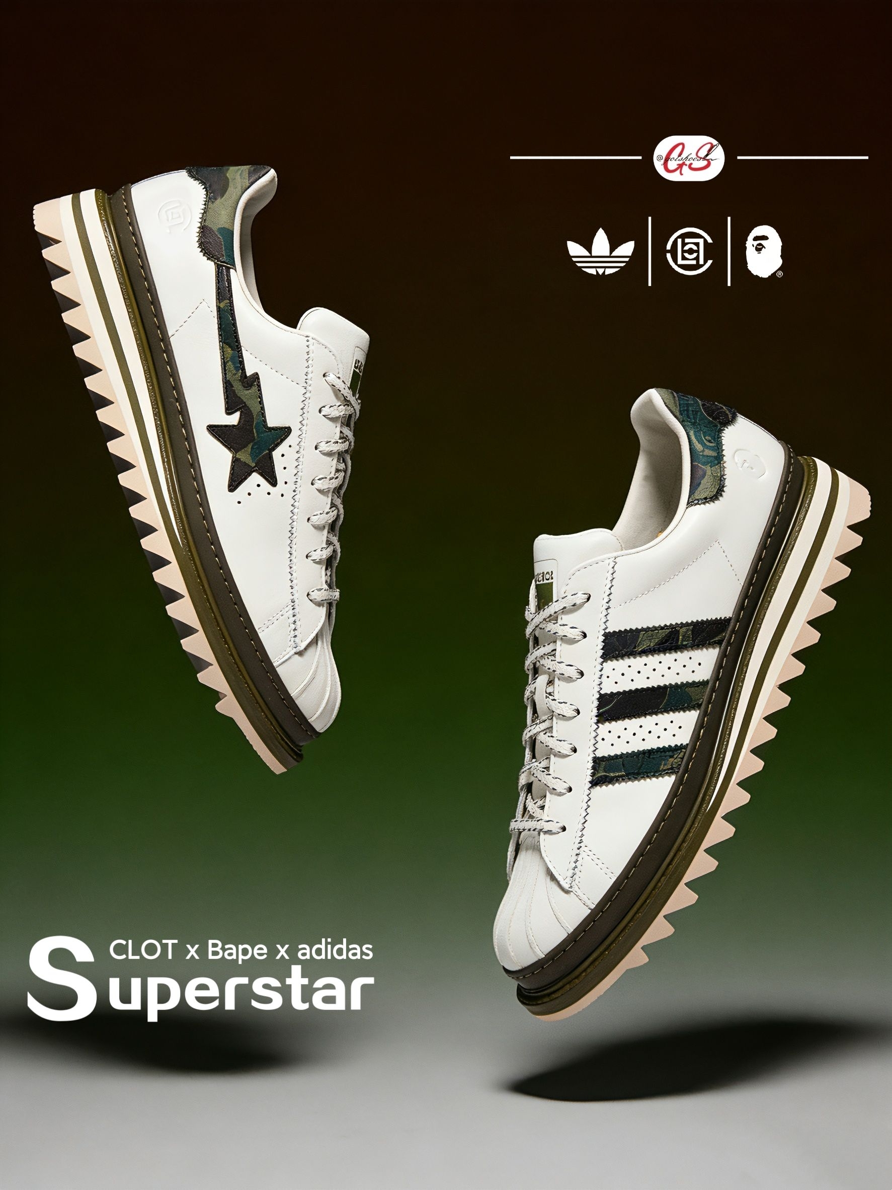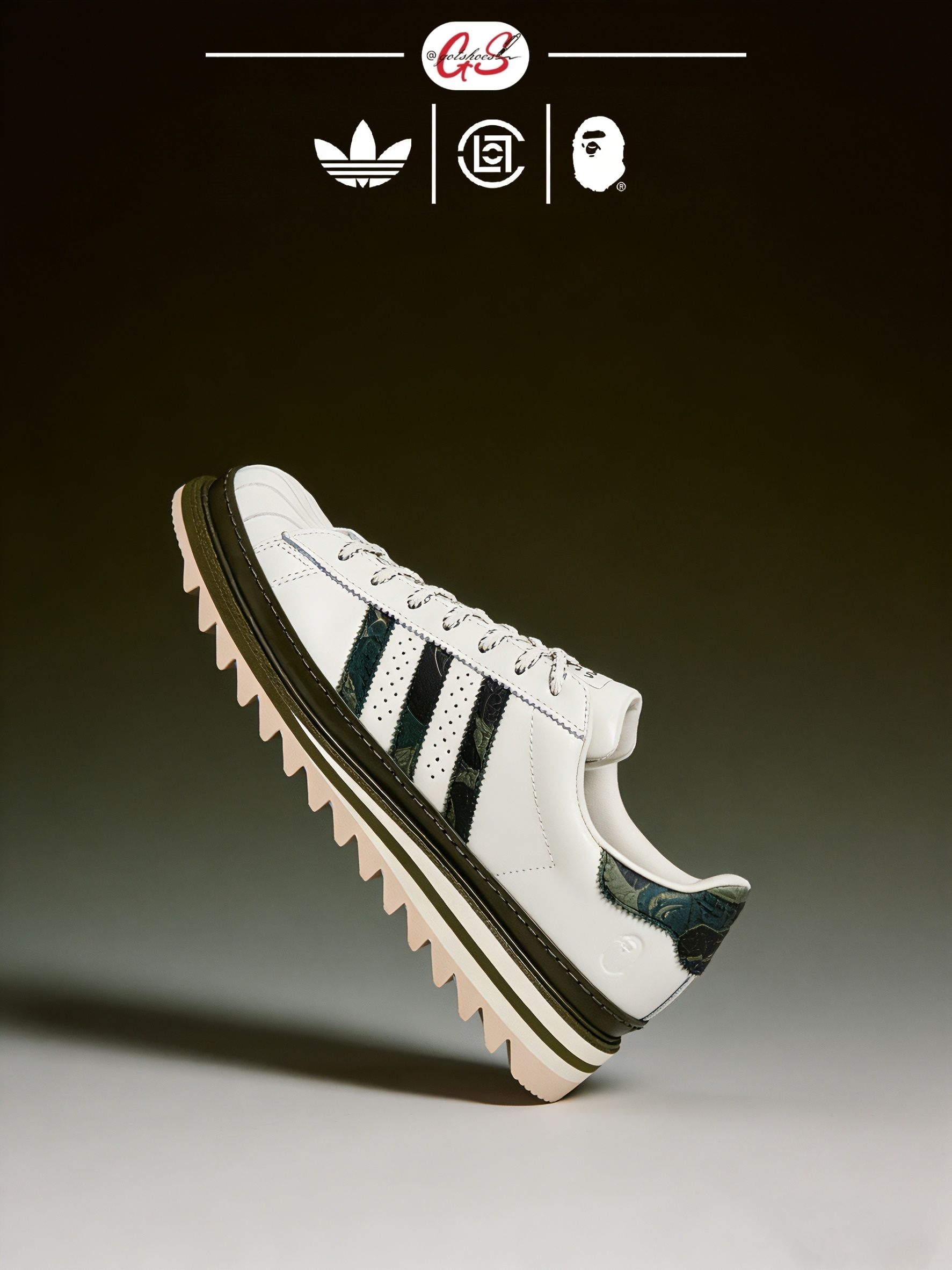 这款由CLOT、BAPE与adidas三方联名推出的Superstar鞋款,采用纯白皮革鞋身结合棕绿色鞋底线条设计。鞋面延续了不对称的鸳鸯风格,侧面同时呈现BAPE STA Logo和adidas经典三条纹,并融入Bape绿色迷彩图案与Clot中国风丝绸元素的压印标识。鞋舌及鞋垫上均点缀有三方联名标志,鞋带则搭配金色CLOT和BAPE金属扣饰,后跟处分别饰有BAPE和CLOT品牌Logo,突显其...