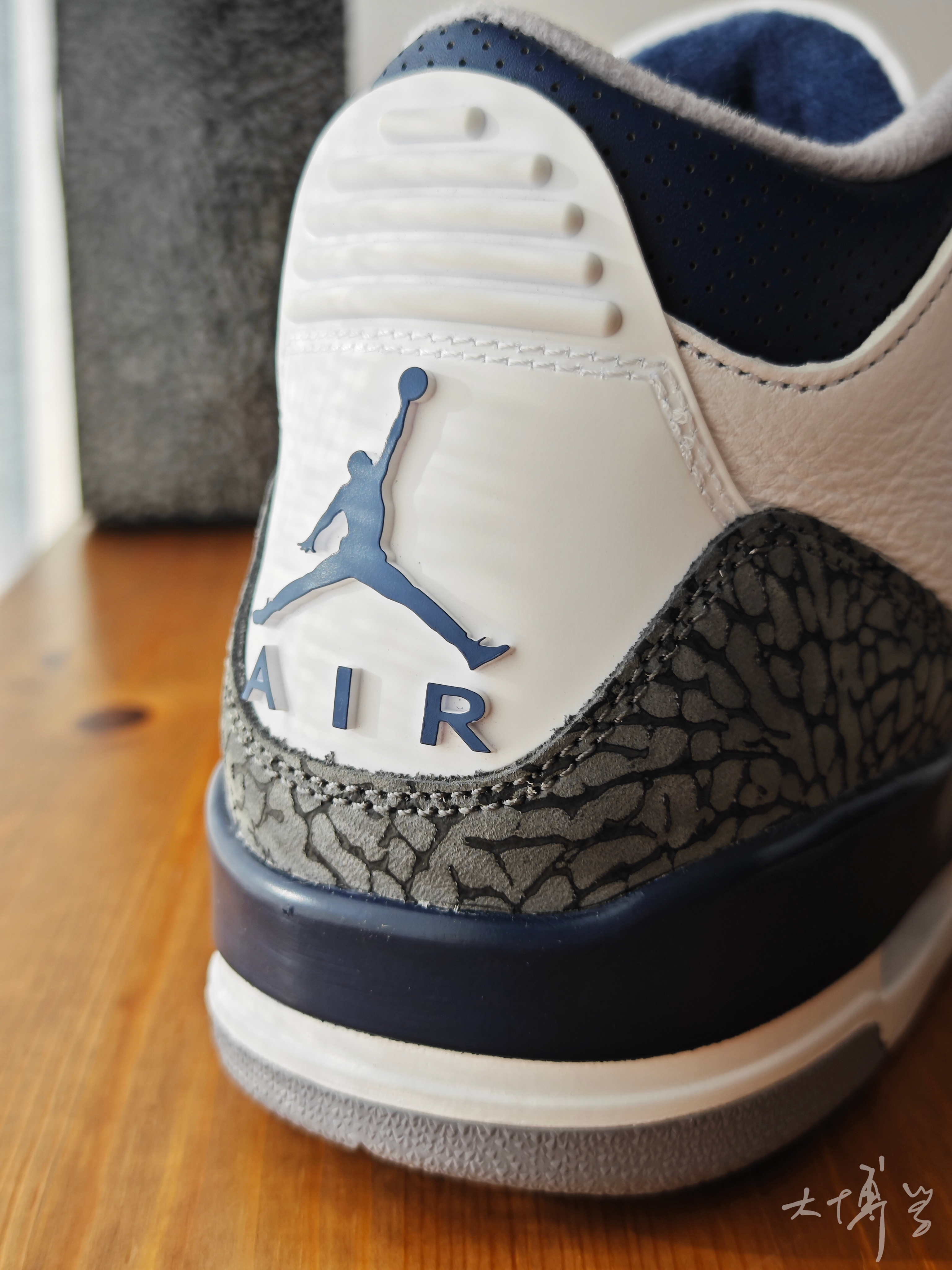 一款配色很干净的AJ3 在我印象里海军蓝和白色搭配的AJ 很少有翻车的 大面积白色搭配蓝色点缀 经典爆裂纹元素装饰鞋头和后跟 灰色内衬和鞋舌形成层次搭配 鞋跟可视Air Sole气垫,脚感偏硬
