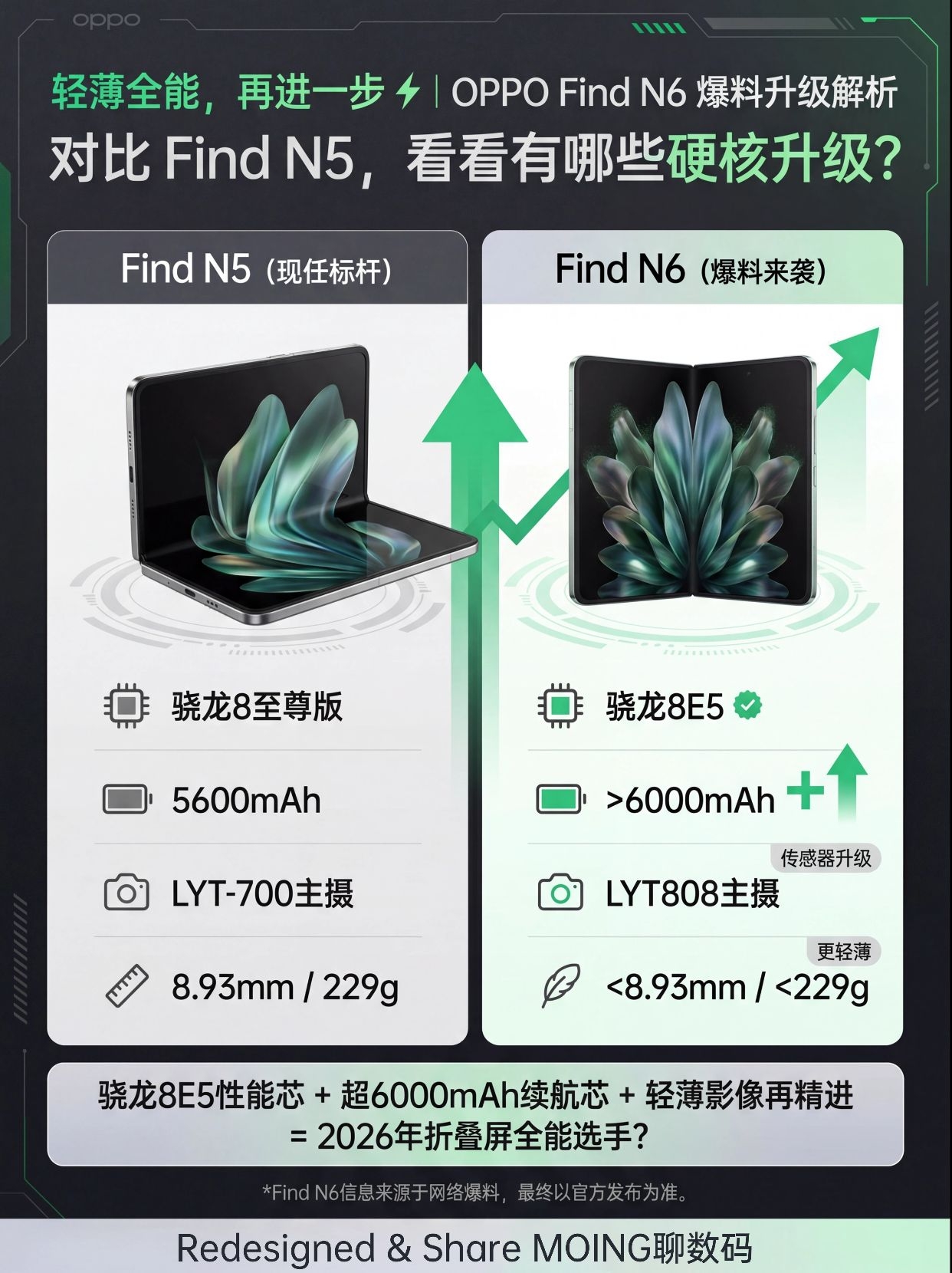 朋友们👋 作为数码钉子户,最近又被一波新机爆料刷屏了,主角就是传说中的 OPPO Find N6! 📱 看完感觉,折叠屏市场2026年可能真要变天了……简单说,它好像要在 「轻薄」 和 「续航」 这两个死对头之间,强行握手言和了!😂 1️⃣ 最大痛点,有解了? 💡现在的折叠屏,不是板砖就是续航焦虑。但爆料说,Find N6合起来可能 不到9mm,但电池居然敢做到 6000mAh以上!还支持...