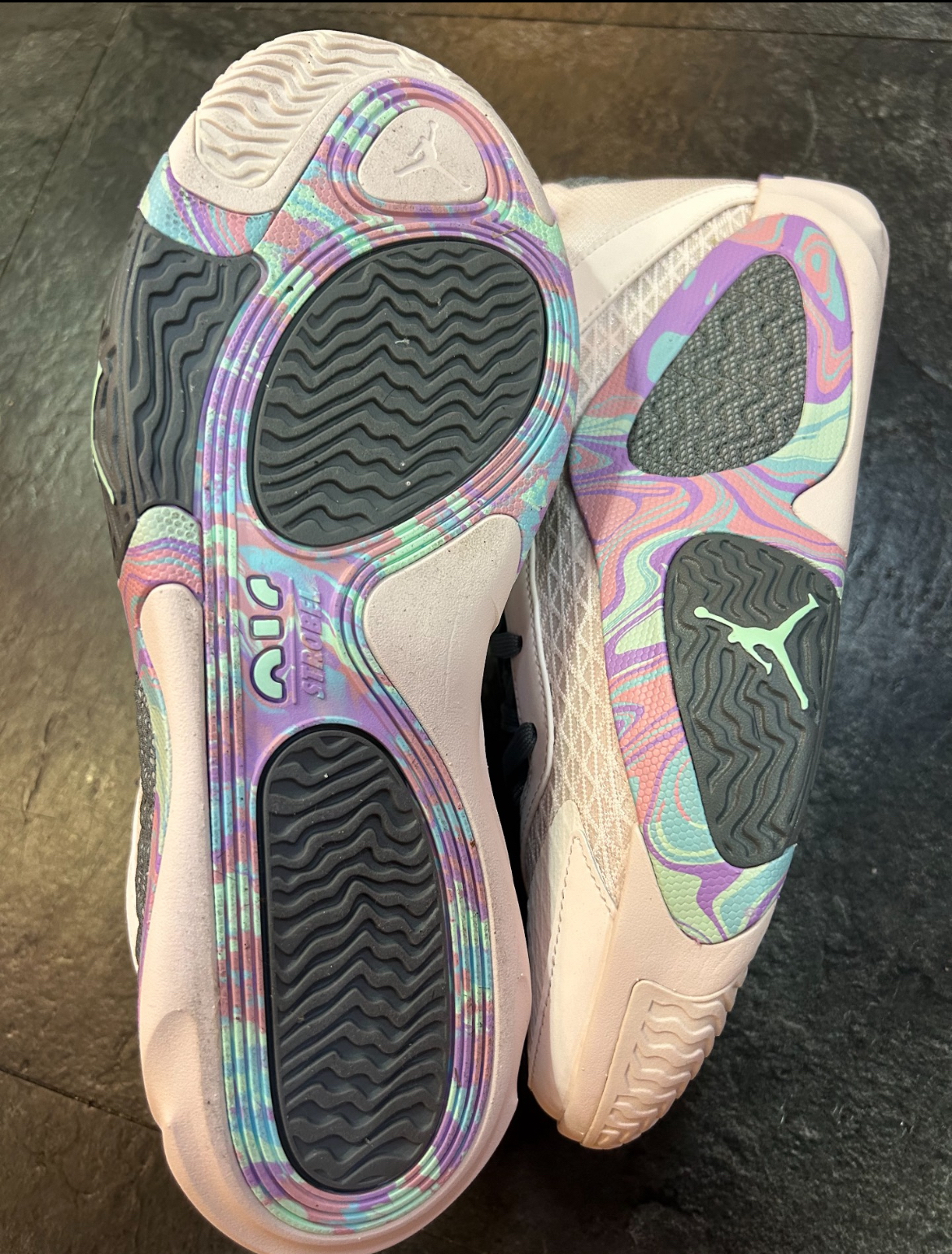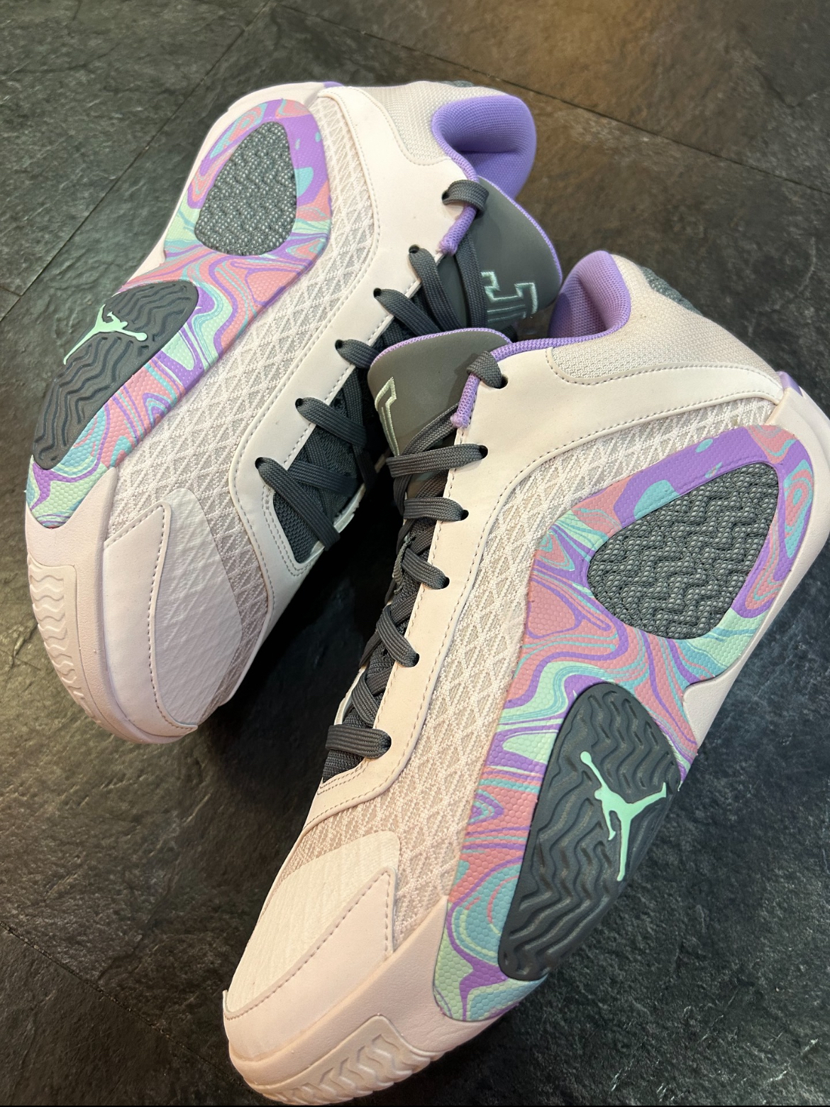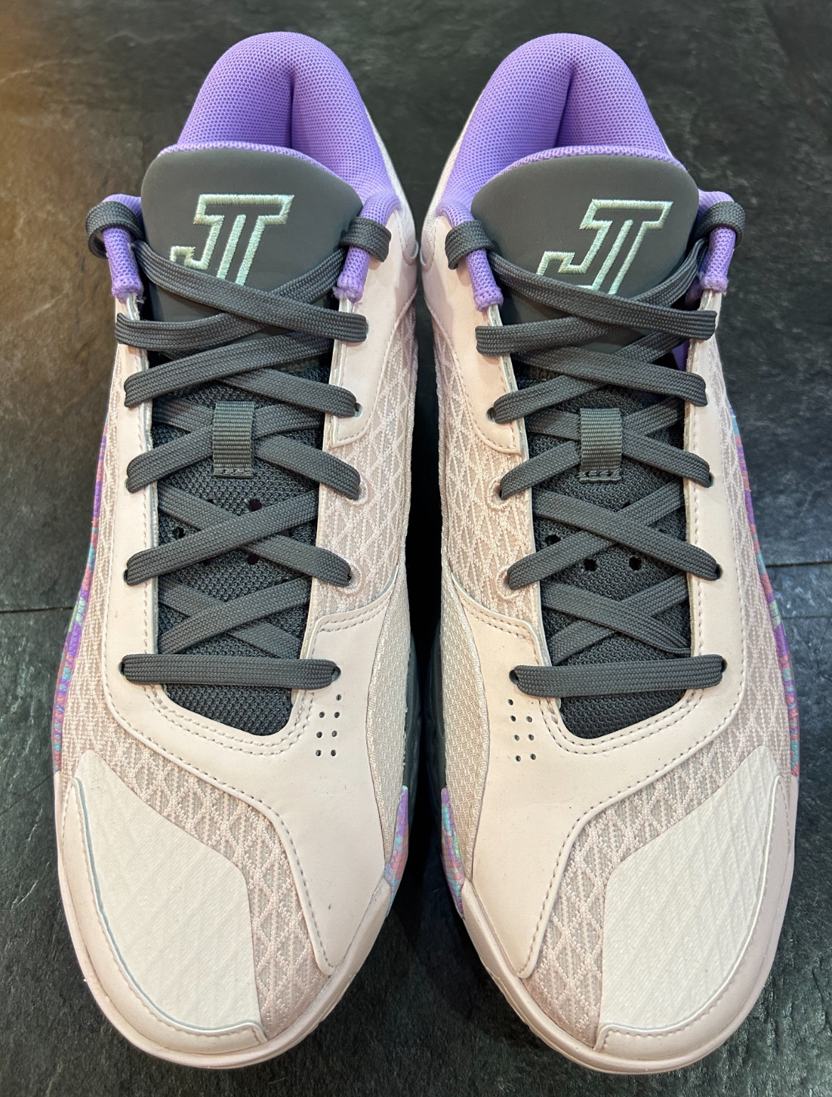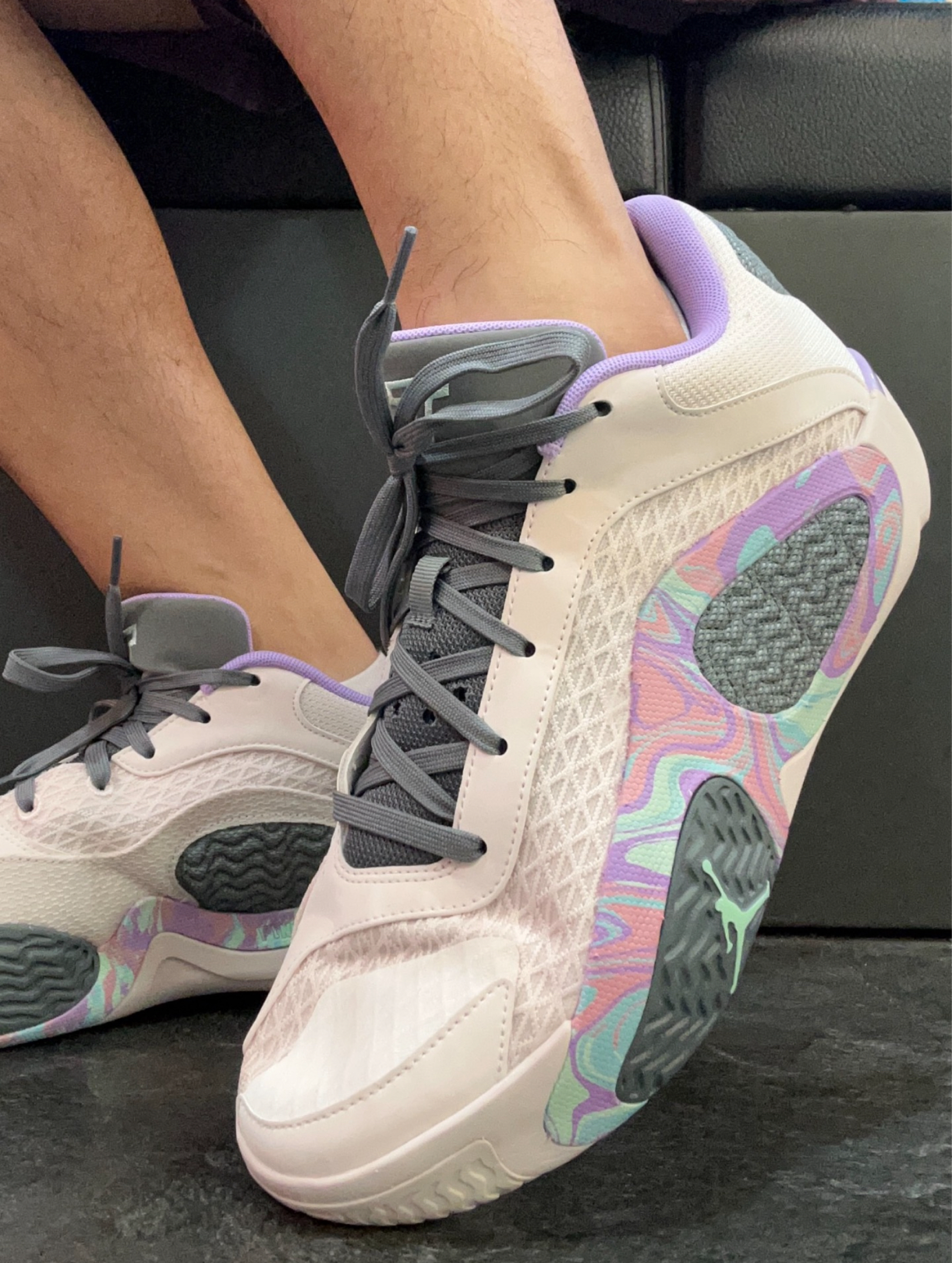 今天与大家分享上脚拍摄的球鞋是Jordan Tatum 2 "Easter"全明星复活节配色,这双鞋的配色属于第一眼就能够拿捏住人心的颜值,配色的应用恰到好处颜值极高,虽然Tatum2本身亮点不多配置方面也只采用了全掌Air气垫,但实际所带来的上脚感受还是非常不错的,再加上配色也是拯救了这双鞋的颜值,所以有着依然不错的人气。