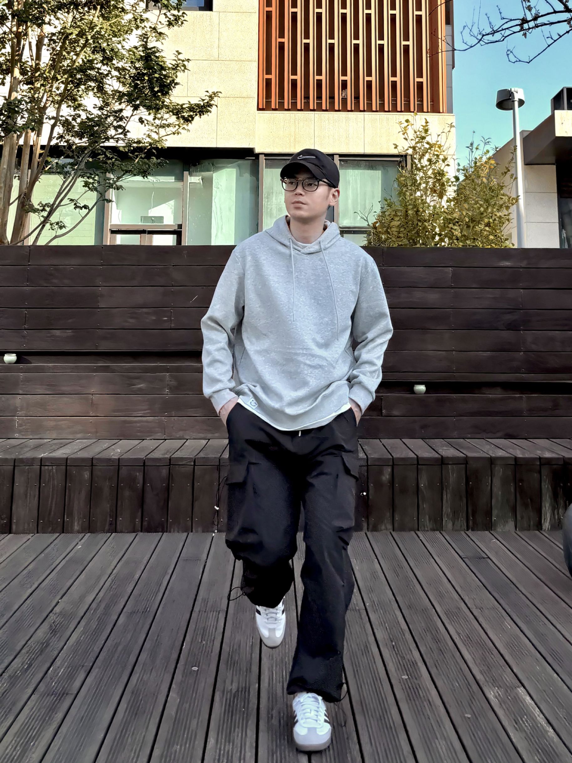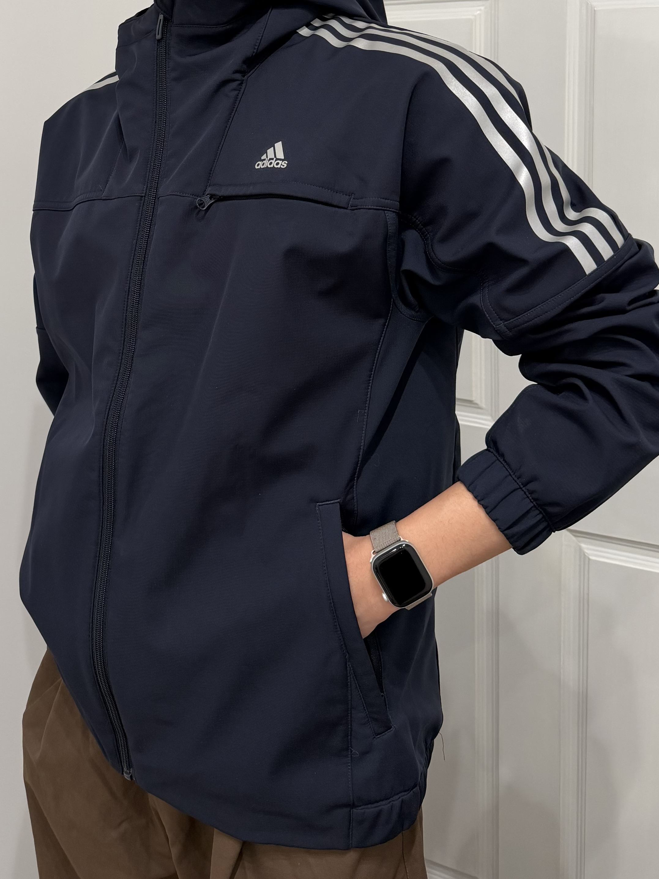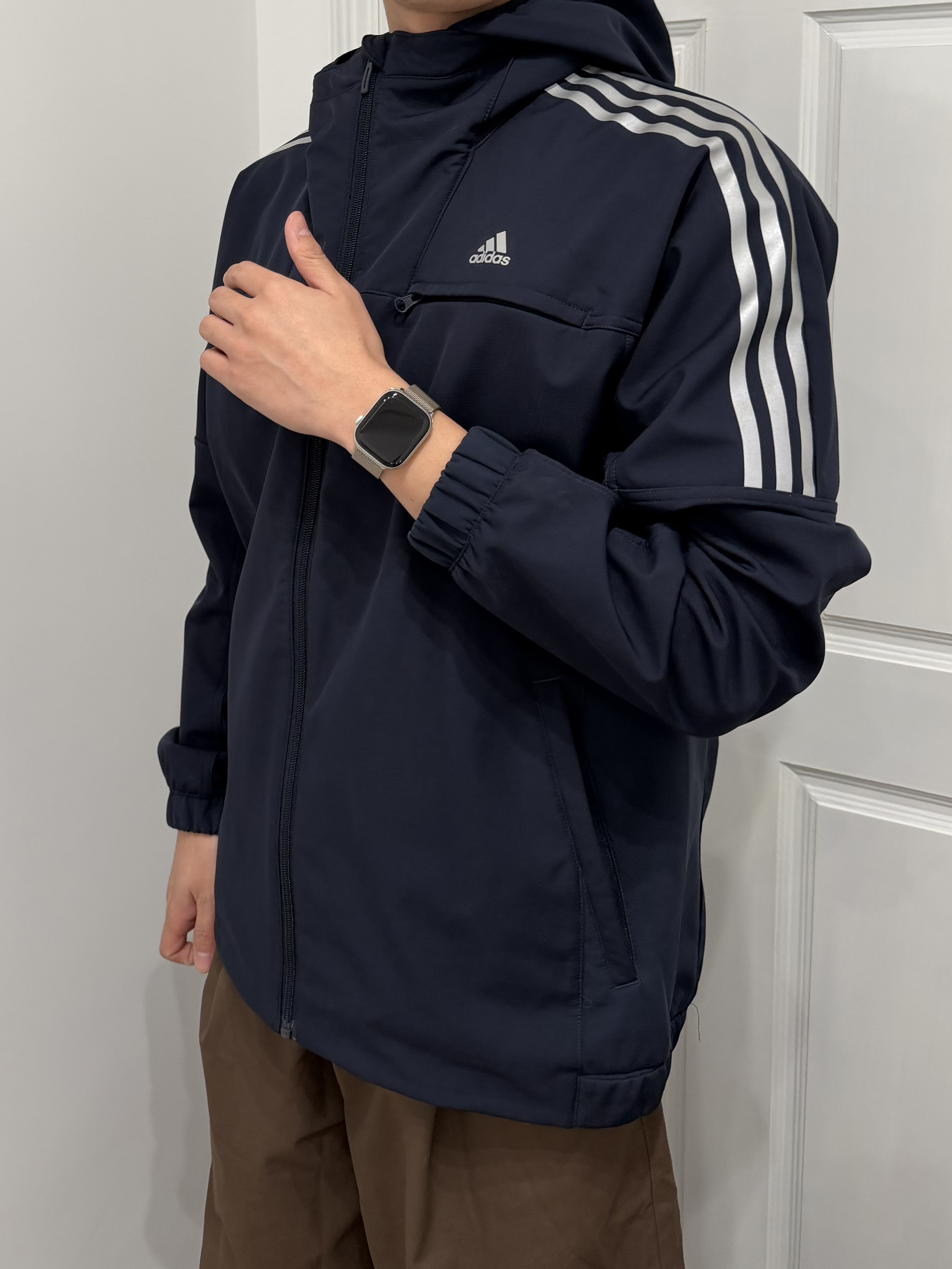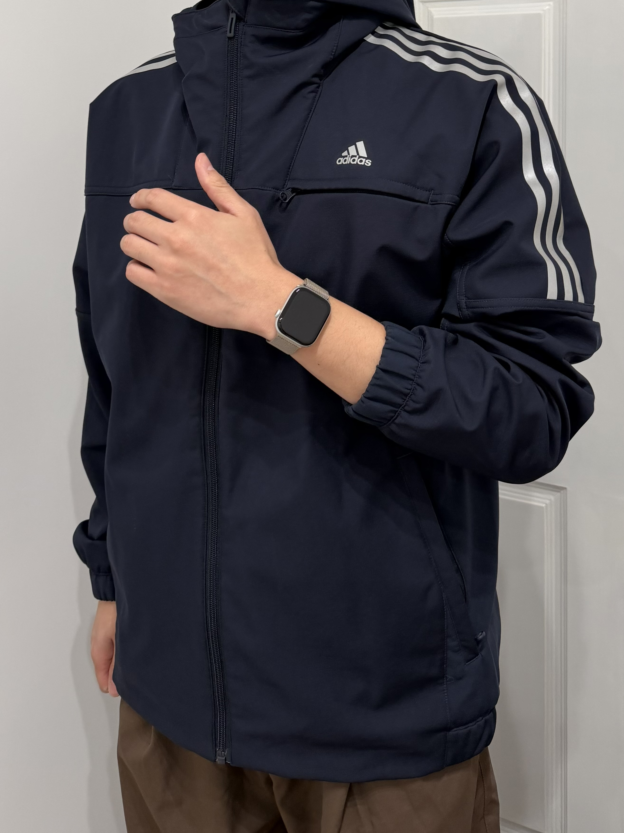 阿迪的运动外套 蓝色➕条纹设计非常经典 带上iwatch 记录运动的轨迹 下身一条休闲裤 非常好搭 整体就是休闲的运动风格
