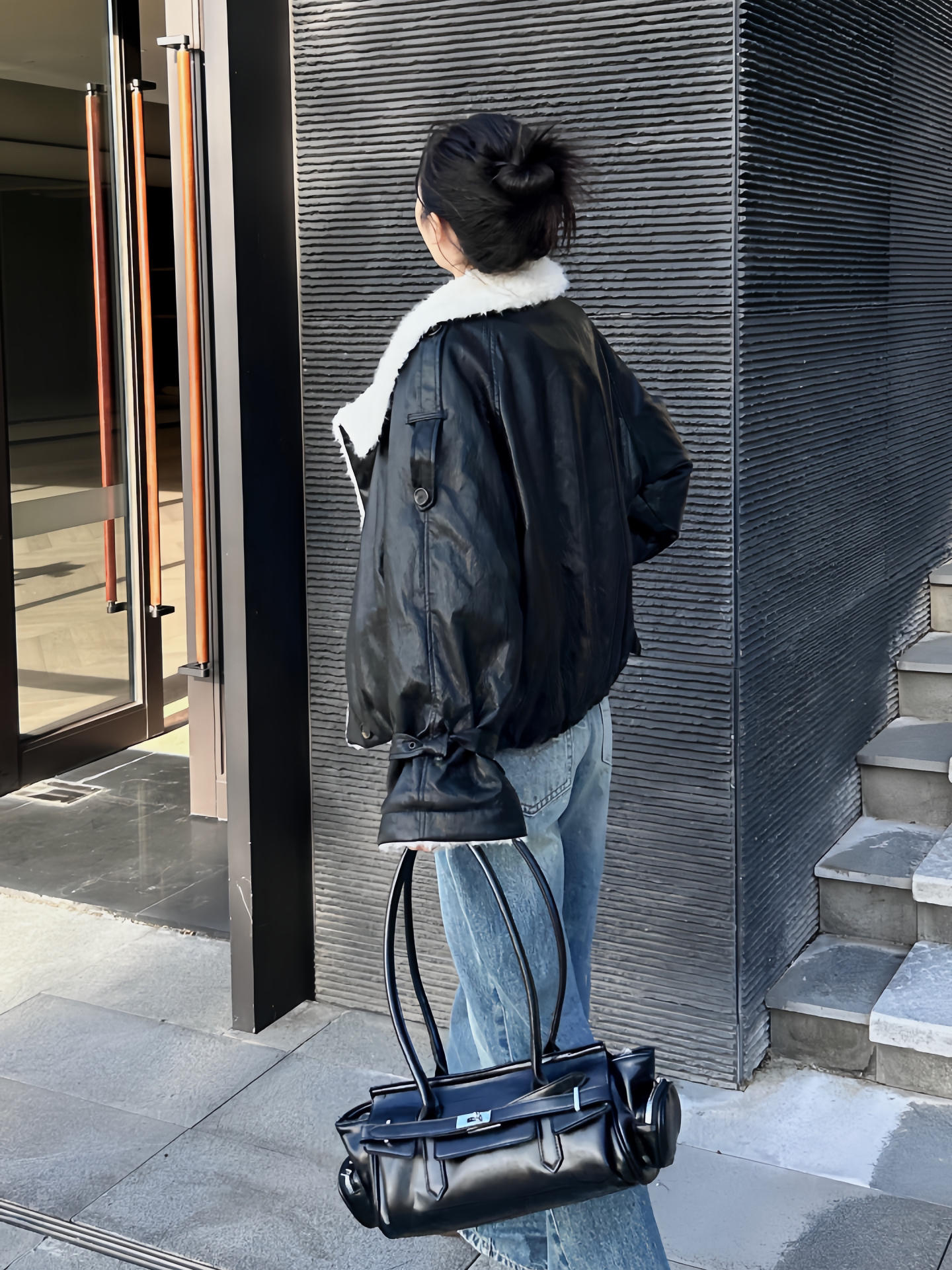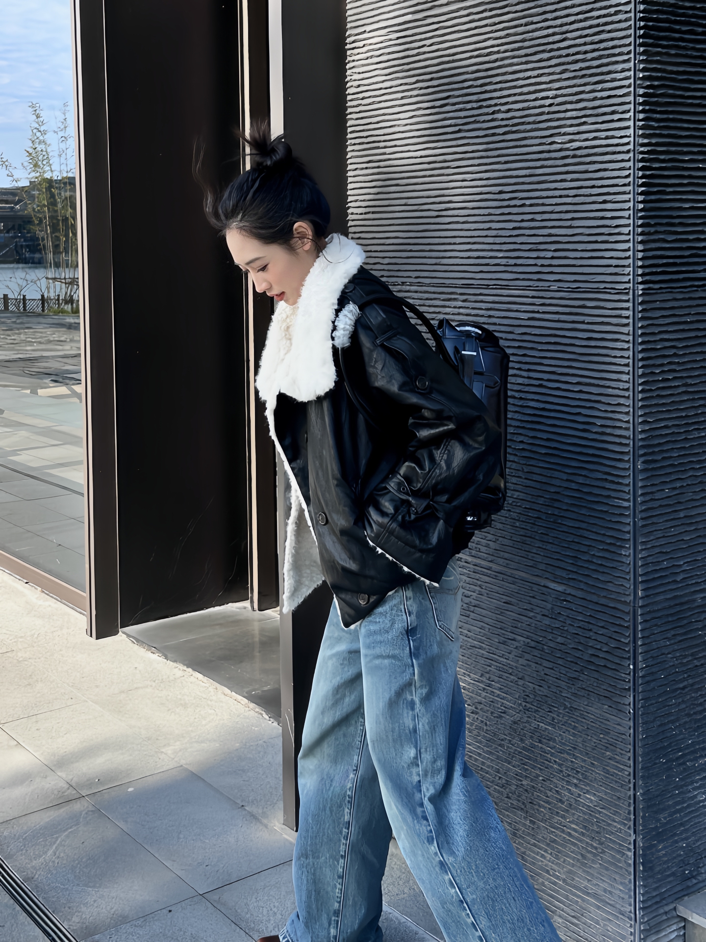 亮面黑外套裹着圈奶白绒毛领,像给冷飒裹了层棉花糖; 做旧牛仔阔腿裤松松垮垮,把利落感揉得软和; 往建筑墙边一靠,光影里全是“刚柔掺半”的好看,连抬手都带着不费力的时髦~