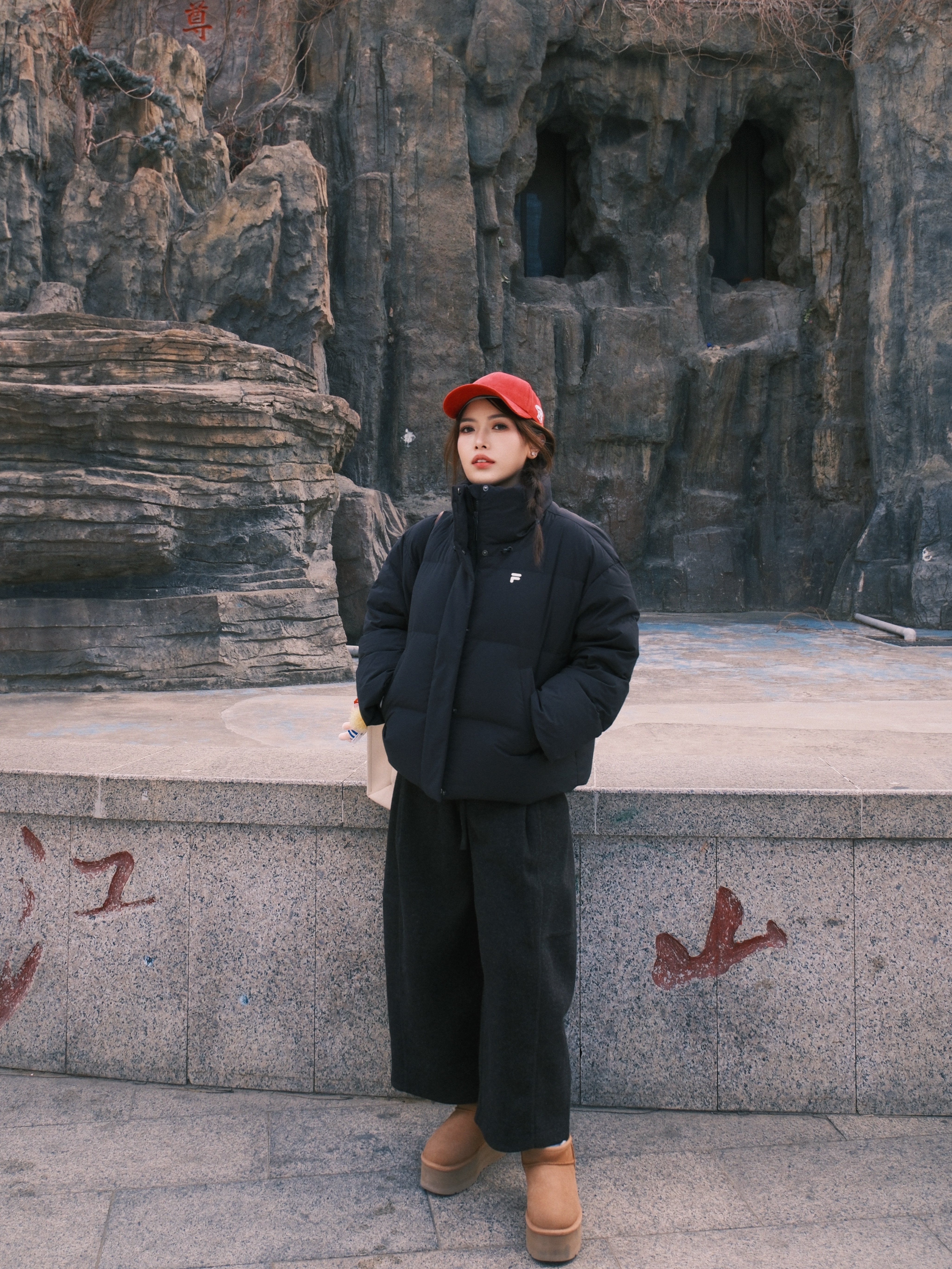 穿搭公式:FILA FUSION黑色短款羽绒服+黑阔腿裤+红帽红围巾,暗调里跳点红巨显白。 羽绒服是75%鸭绒绒子含量的,超轻超蓬松,oversize版型裹得暖,结合短款设计不显臃肿,配厚底雪地靴刚好中和“面包感”,得物入的质感很抗打,日常通勤/逛公园穿都舒服又出片~