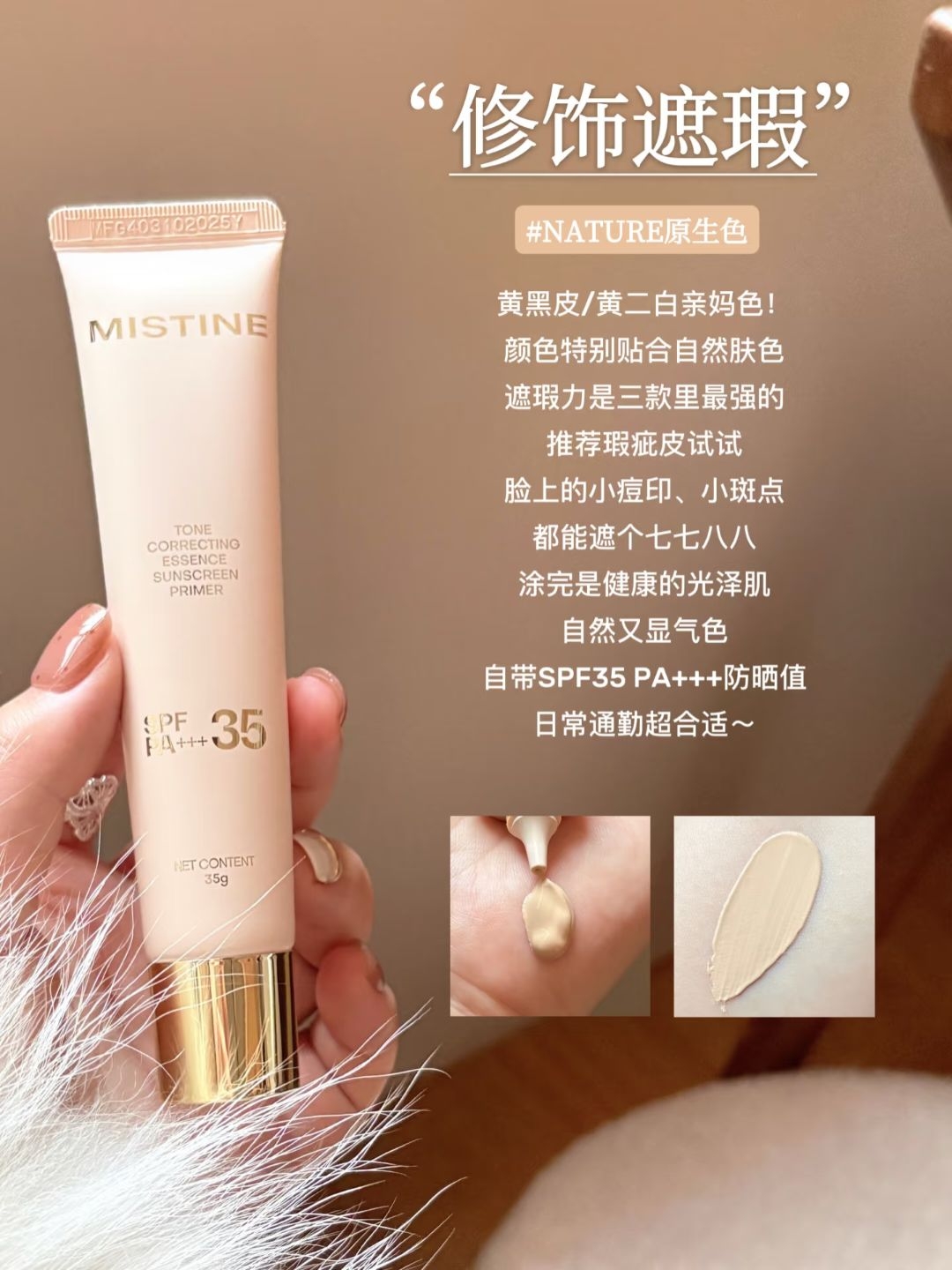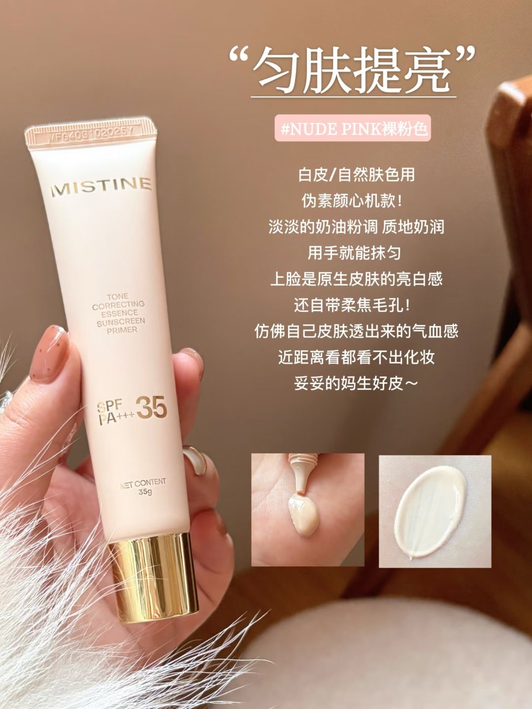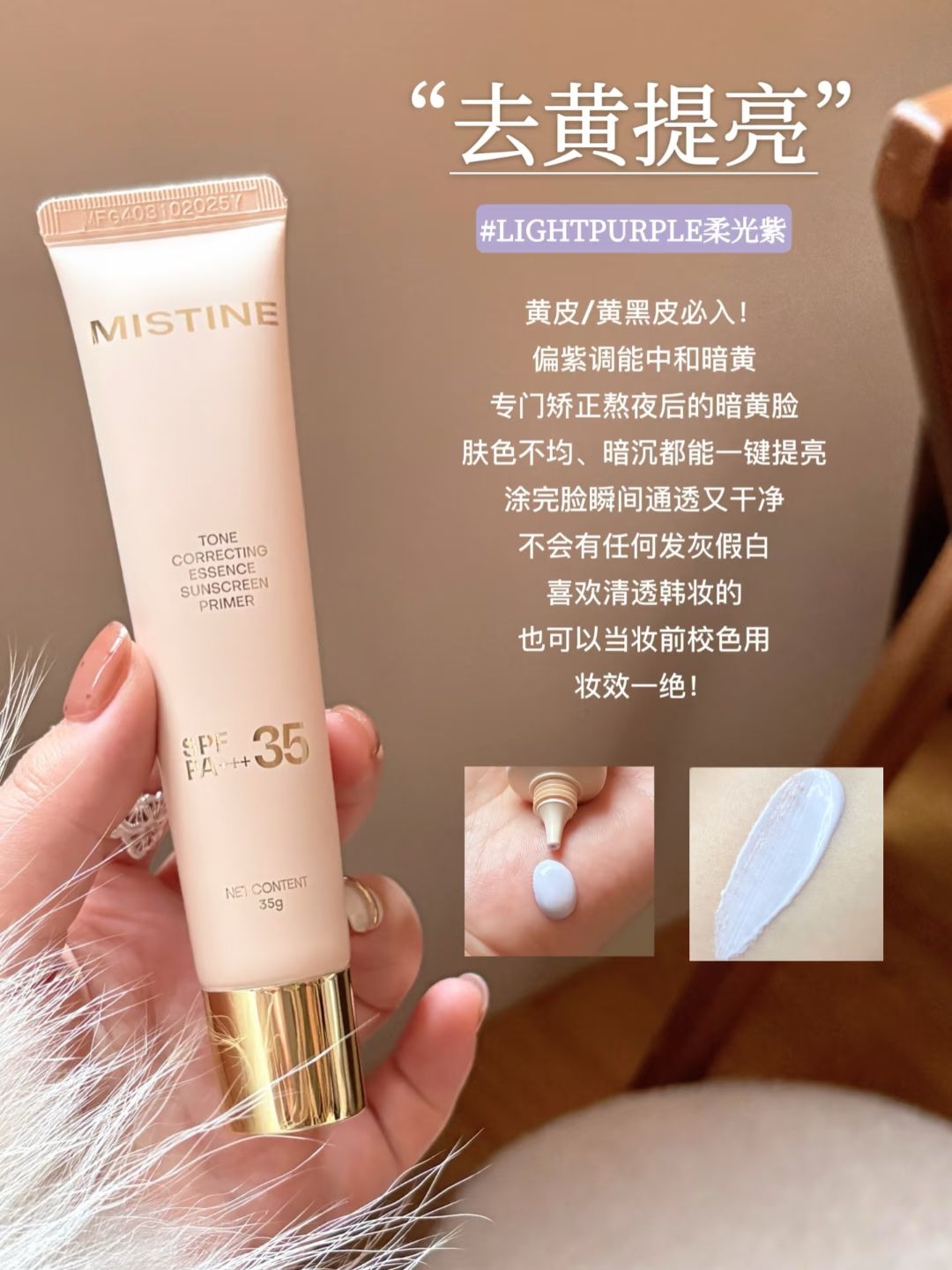 本篇笔记关联了Mistine/蜜丝婷 润色精华防晒妆前乳 提亮匀肤隐毛孔保湿养肤磨皮 35g 02柔肤紫 偏黄、暗沉、不均匀肤色、Mistine/蜜丝婷 润色精华防晒妆前乳 提亮匀肤隐毛孔保湿养肤磨皮 35g 01裸粉色 自然/偏白肤色等商品,为用户提供真实的使用体验和购买参考。