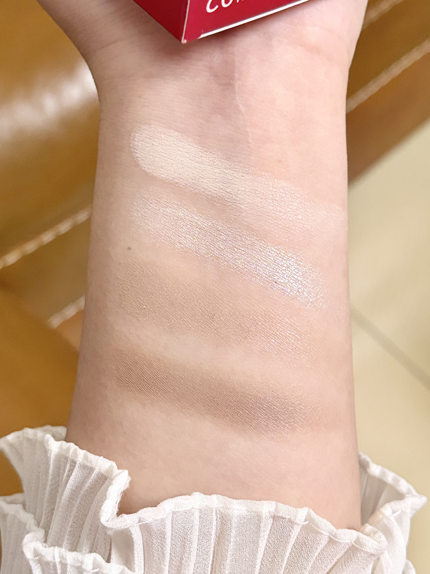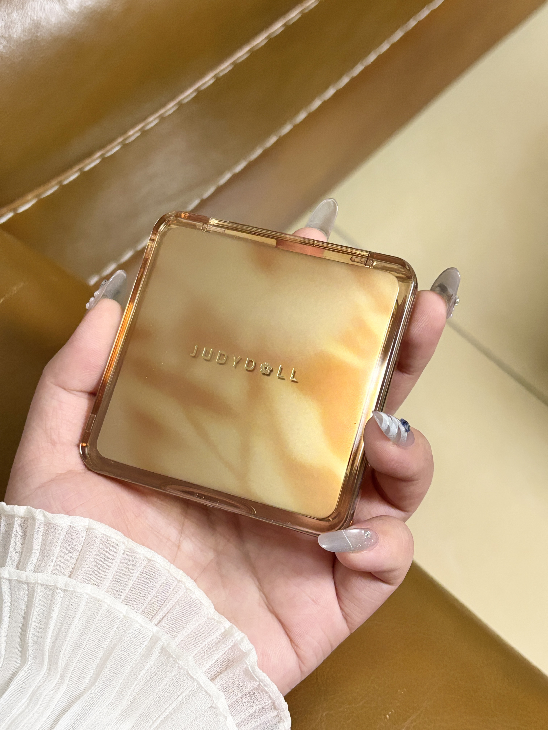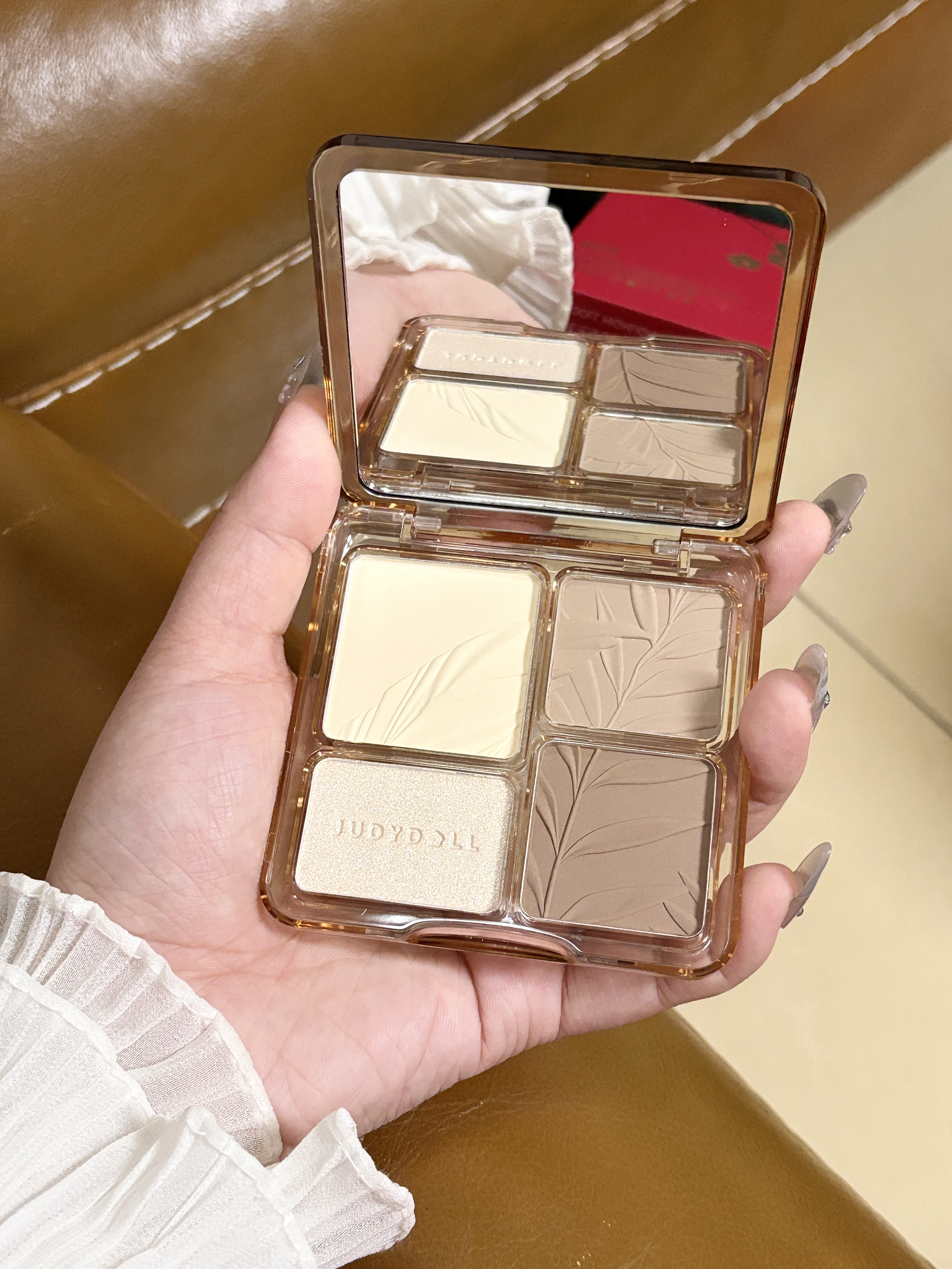 橘朵新年点金系列也太会了 我是一直都在用 02树影盘 这盘很懂黄皮 修容高光全都有 修容的颜色自然不突兀 不发红也不发灰 更不会显脏 米白哑光提亮细腻又干净 香槟金珠光是细腻的土豆泥质地 涂出来是那种水露露的自然光 全脸修容用这一盘就好啦~